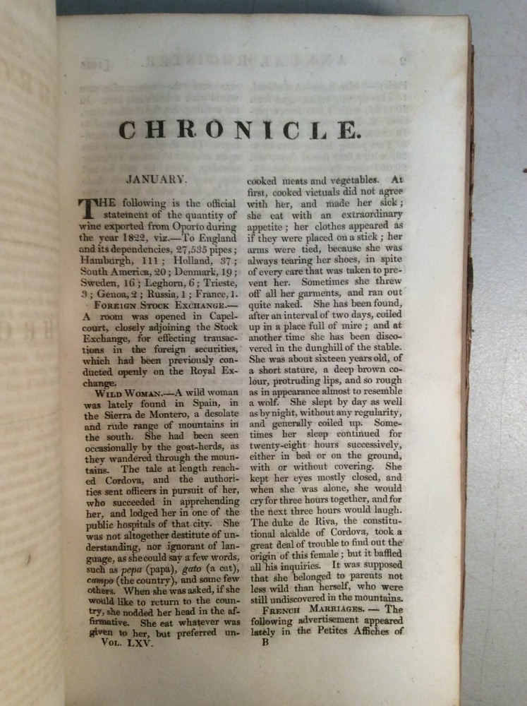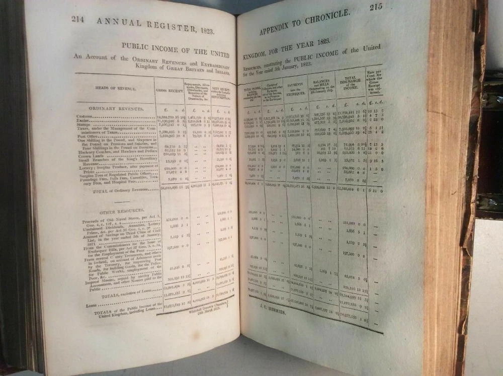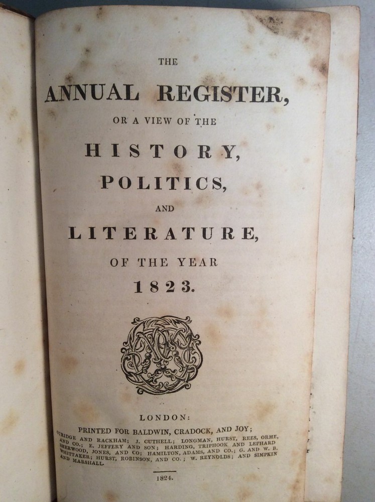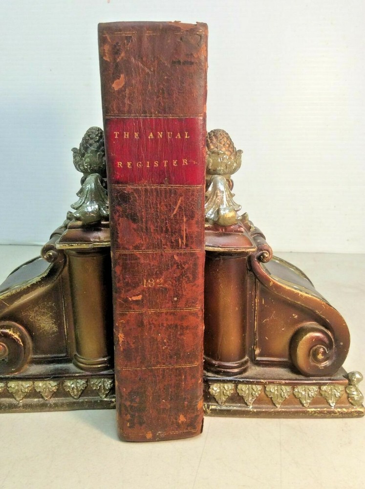 Attention Collectors!!! You are bidding on a rare antique hardcover book titled: The Annual Register, or A View of the History, Politics, and Literature, of the Year 1823. Printed for Baldwin, Cradock, and Joy, 1824. Imagine, this book is almost 200 years old!!! The book is quarter-bound in leather with leather tips. Titling is in gold or red morocco leather label on spine. The binding shows corner and edge wear, as you would expect with a book almost 200 years old! All pages are present, are tightly bound. The first and last few pages shows foxing with the remainder of pages in very good condition. Most pages have no foxing at all. Bookplate of Montrose Library on inside of front cover. There are no other signs of previous ownership. Book remains in good condition! Nice rare, antique book to add to a collection! Very collectible! Great gift idea! (Inventory: 1) Track Page Views With Auctiva's FREE Counter
