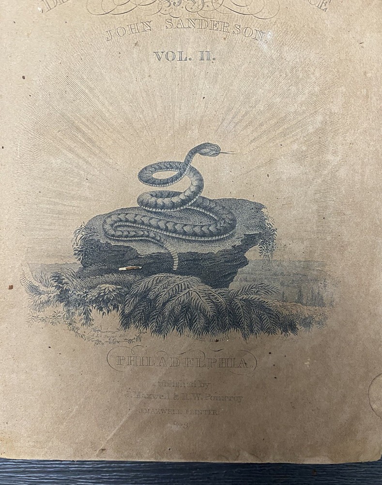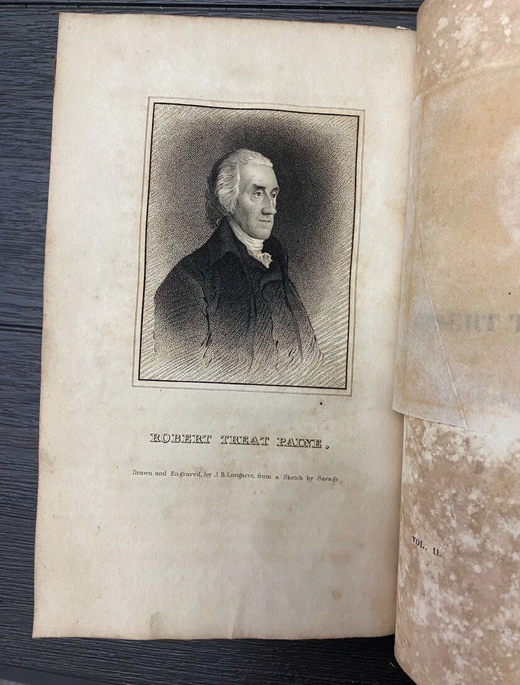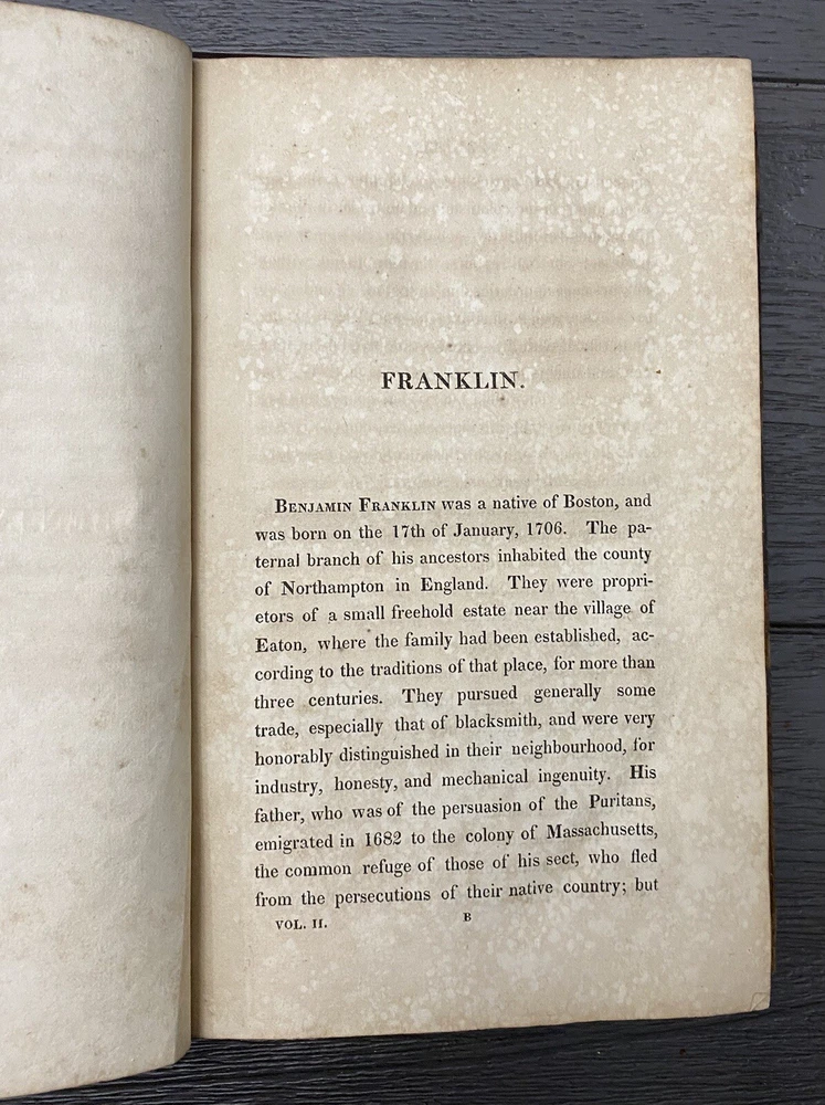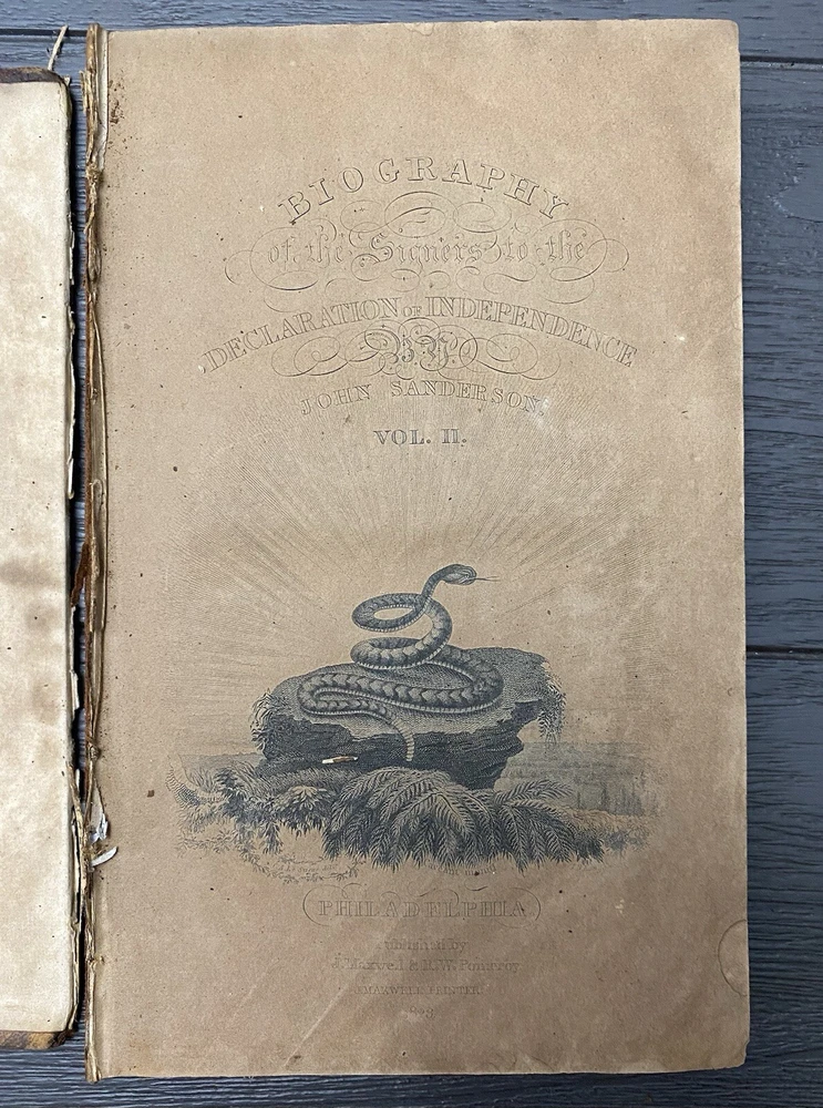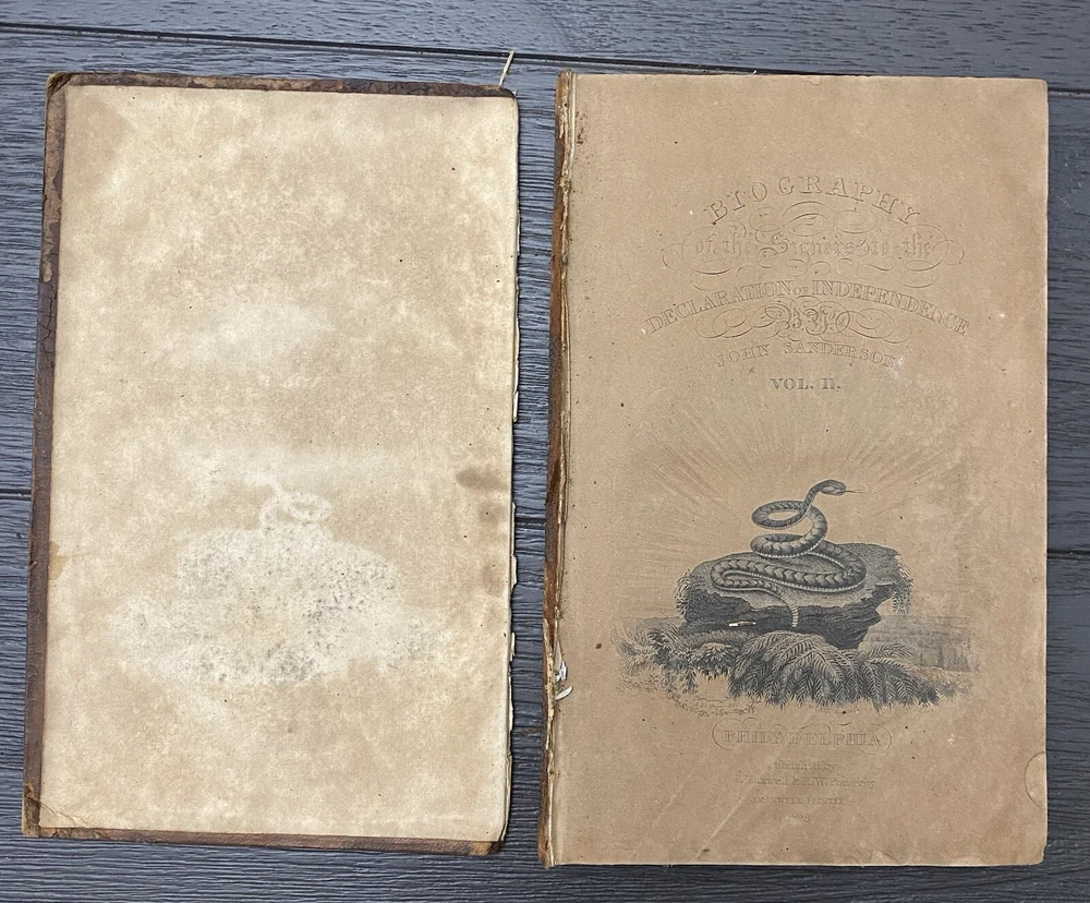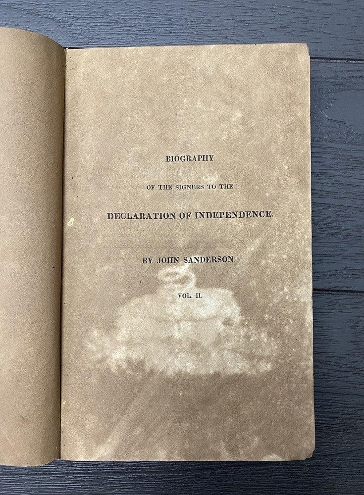 The Biography of the Signers of the Declaration of Independence, by John Sanders, Vol II, Benjamin Franklin, 1823 Bibliographic Details** - **Title:** Biography of the Signers to the Declaration of Independence, Benjamin Franklin - **Publisher:** R. W. Pomeroy, Philadelphia, PA - **Publication Date:** 1823 - **Binding:** Hardcover Vol II **Description:** This is an authentic edition from 1823 of *Biography of the Signers to the Declaration of Independence*, featuring Benjamin Franklin and other notable signers. The book has a brown calf leather cover with significant wear, including flaking, edgewear, and loss of leather throughout. The cover ( front and back) are detached from the pages, but pages are not loose and still all intact (see photos). Corners are bumped, and the spine shows wear, yet the binding remains sound despite cover being detached. There is foxing and toning to the 1st page and throughout the interior pages, typical for a book of this age. Black-and-white engravings are present, with some in good condition. The book does not have any markings or stamps. Given its age of over 200 years, it holds incredible historical value. Imagine the many hands that have read this book! While the cover shows considerable wear, as it is detached but the pages are bound together still, it could be rebound if desired (please refer to the photos for detailed condition, and feel free to ask any questions before purchasing). **Notable Signers in this Volume:** - Benjamin Franklin - George Wythe - Francis Hopkinson - Robert Treat Paine