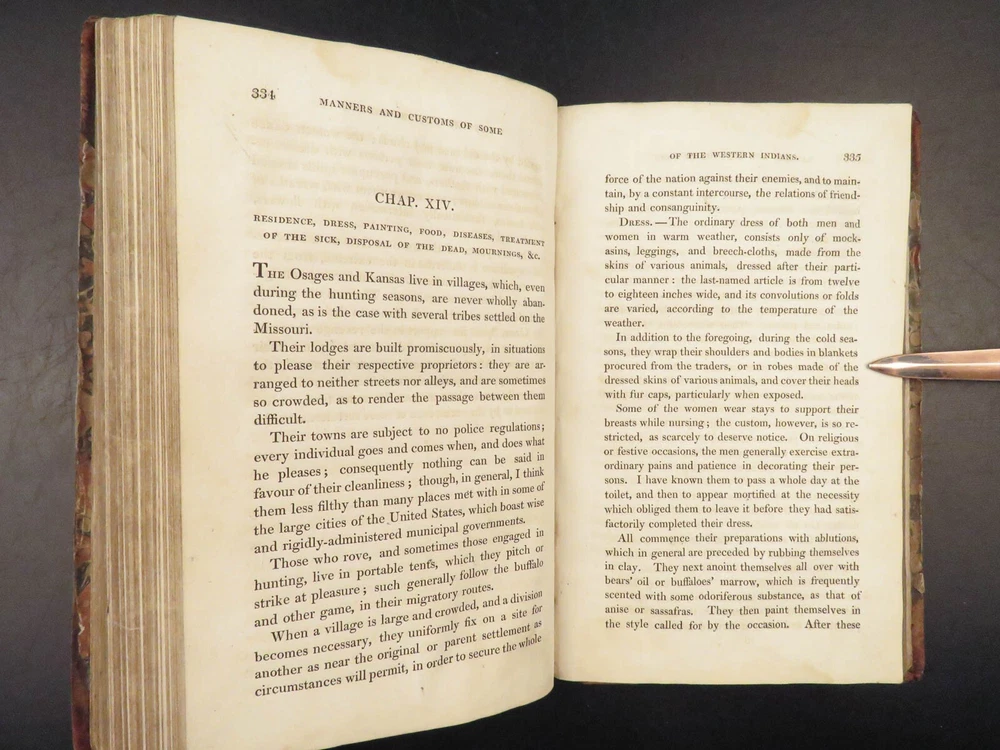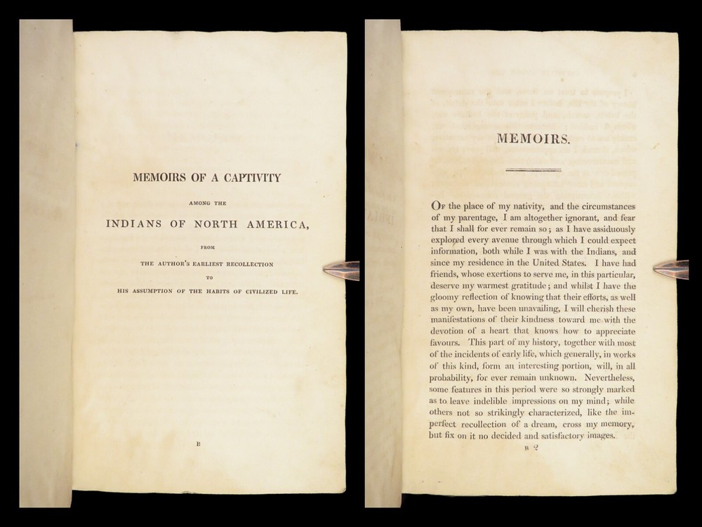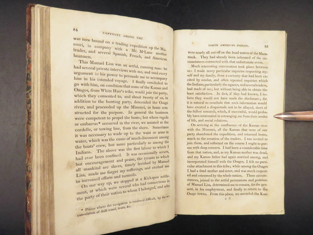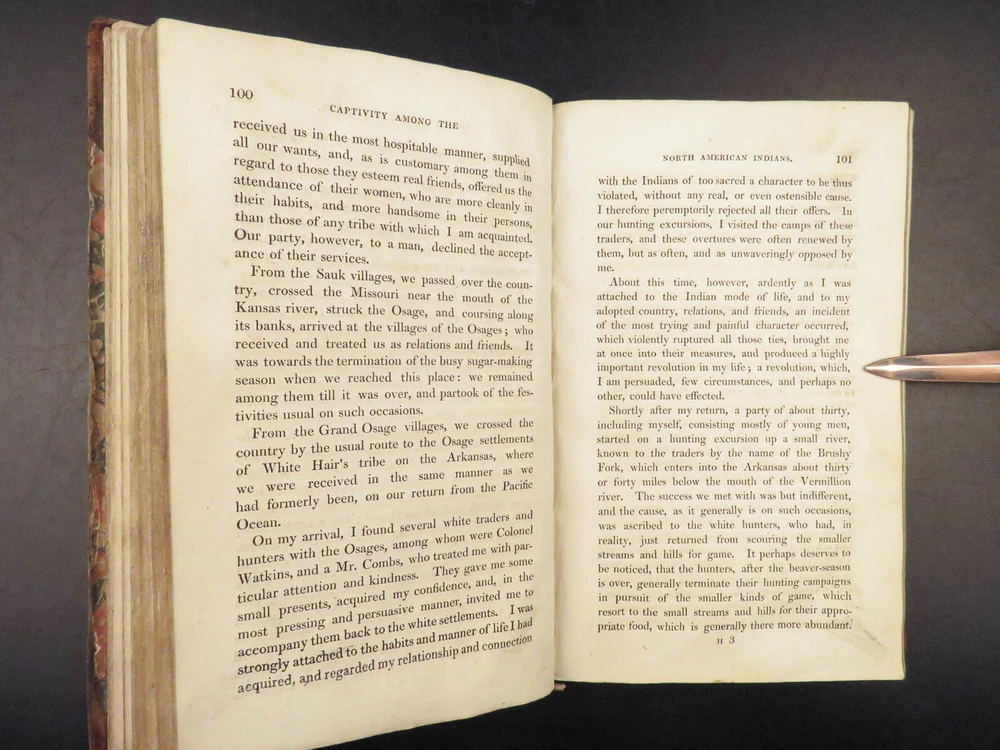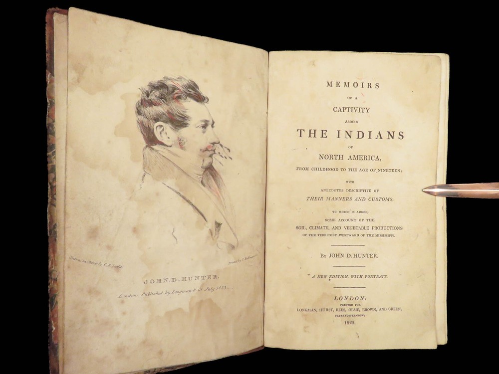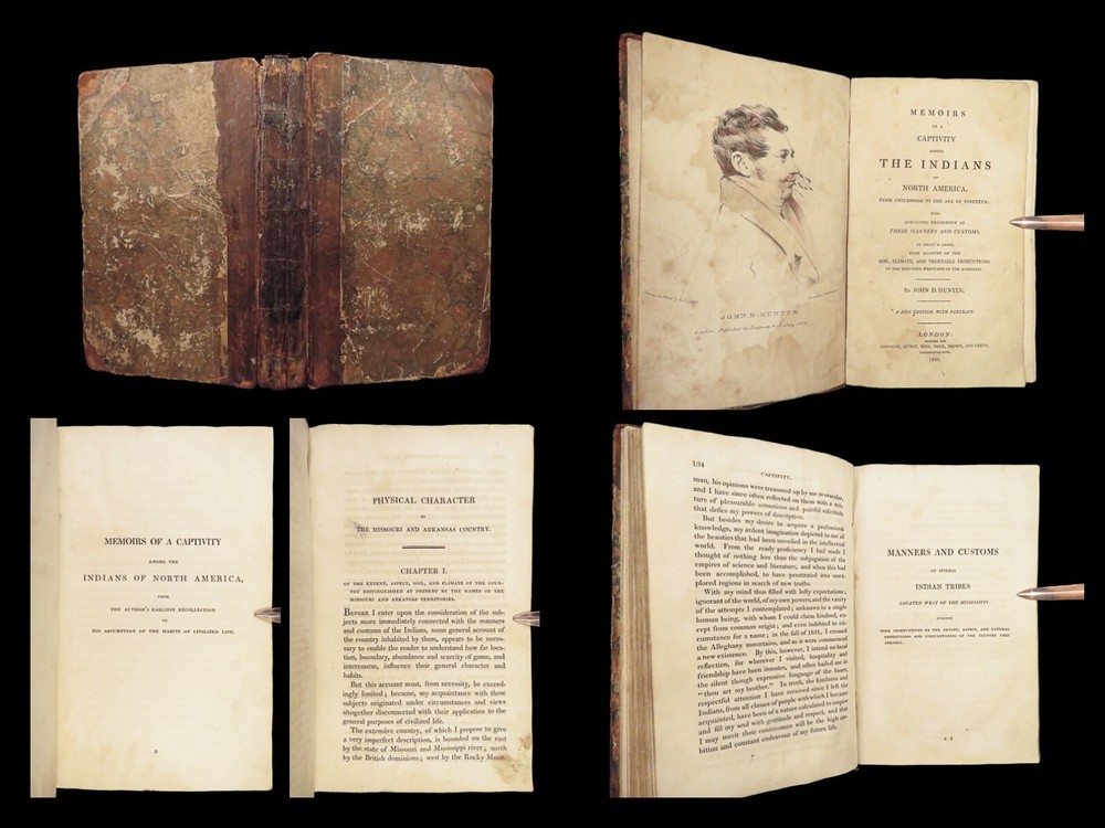 1823 INDIANS 1 ed John Hunter Captivity Kickapoo Cherokee Fredonian Rebellion John Dunn Hunter was an early 19 th -century American who was taken prisoner at birth by the Kickapoo Indians. Hunter himself knew nothing of his origins and only took the name Hunter as he claimed to be a proficient hunter. He is best remembered for his role in the Fredonian Rebellion – Texas’s first attempt to secede from Mexico – and the negotiations that he conducted with Cherokee tribes. However, prior to the Rebellion, which would ultimately cause his death, Hunter wrote a bibliographic sketch of his life among the Indians and the various tribes he encountered while in Missouri, Arkansas, and Texas. Per Wagner Camp: “His account of life among the Kansas and Osage Indians and his experiences on the prairies sound entirely credible.” Item number: #25665 Price: $499 HUNTER, John Dunn Memoirs of a captivity among the Indians of North America, from childhood to the age of nineteen London: Longman, Hurst, Rees, Orme, Brown & Green, 1823. First edition. Details : · Collation: Complete with all pages o [2], ix, [1], 447, [1] o Engraved portrait frontispiece · References: Sabin 33921; Wagner-Camp 24:2; Howes H 813; Field 743 · Language: English · Binding: Leather; secure · Size : ~8.5in X 5.5in (21.5cm x 14cm) Our Guarantee: Very Fast. Very Safe. Free Shipping Worldwide. Customer satisfaction is our priority! Notify us with 7 days of receiving, and we will offer a full refund without reservation!