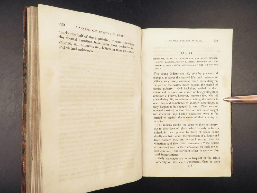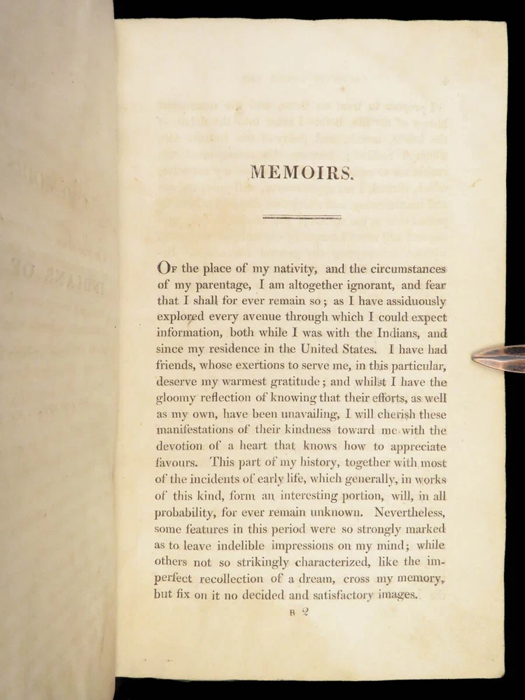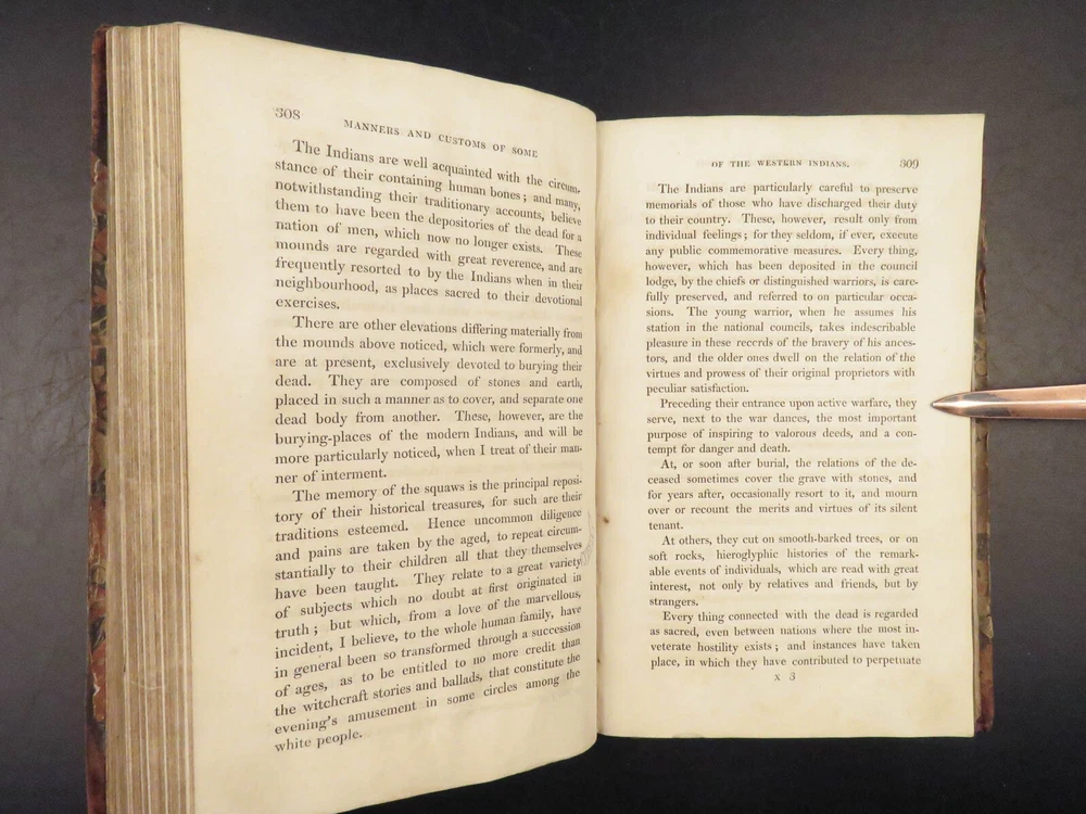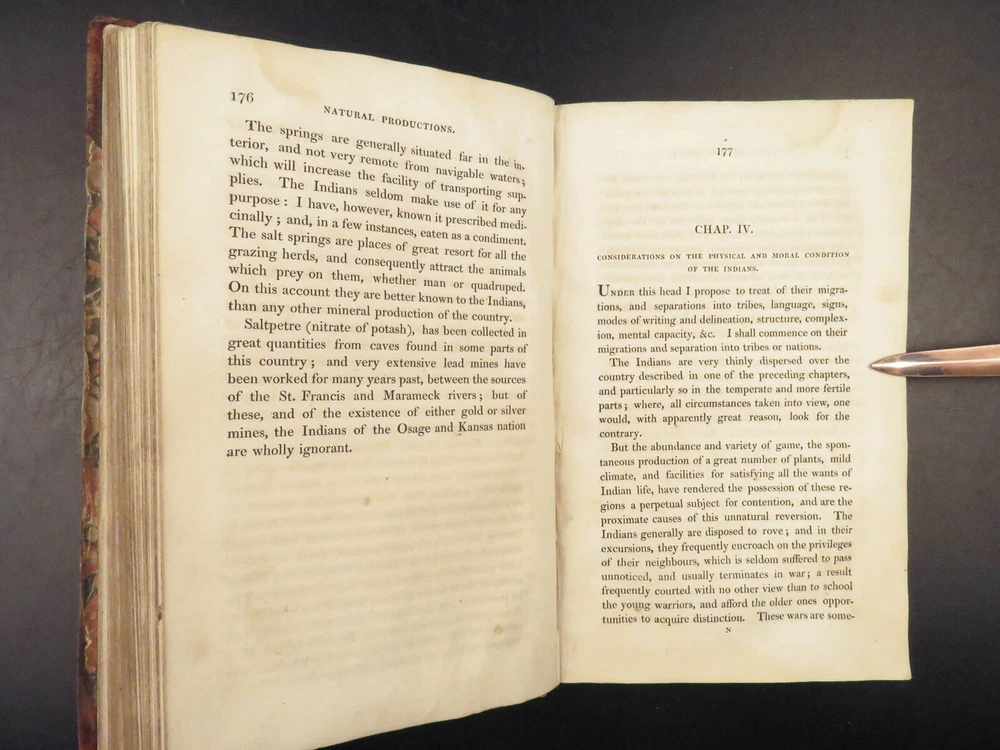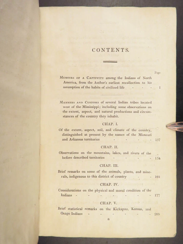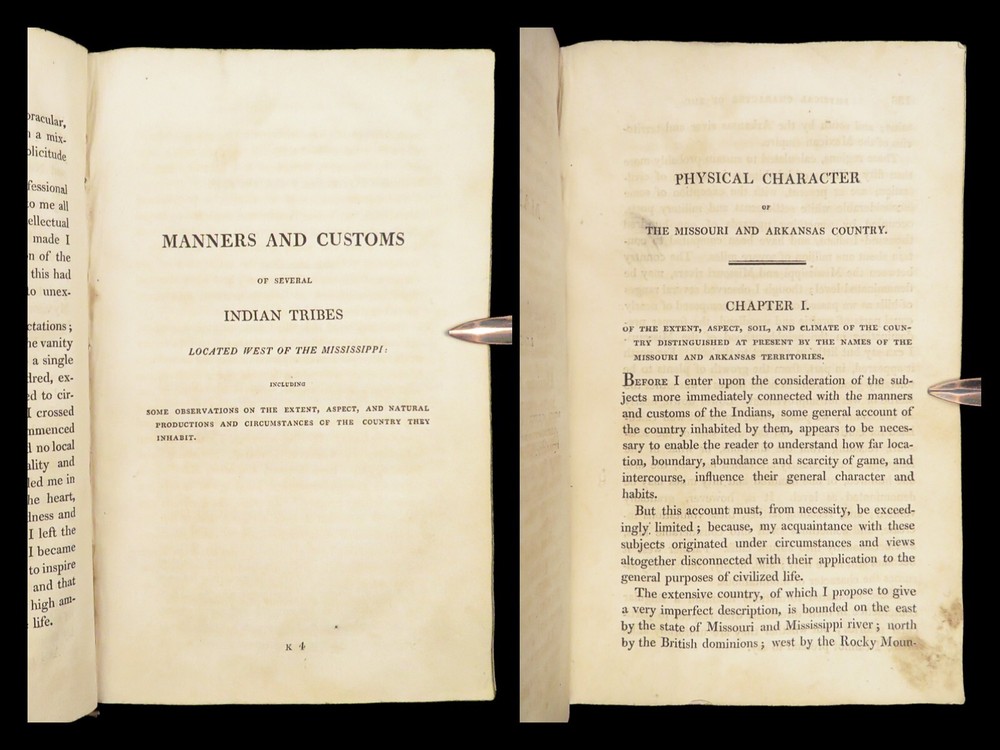 1823 INDIANS 1 ed John Hunter Captivity Kickapoo Cherokee Fredonian Rebellion John Dunn Hunter was an early 19 th -century American who was taken prisoner at birth by the Kickapoo Indians. Hunter himself knew nothing of his origins and only took the name Hunter as he claimed to be a proficient hunter. He is best remembered for his role in the Fredonian Rebellion – Texas’s first attempt to secede from Mexico – and the negotiations that he conducted with Cherokee tribes. However, prior to the Rebellion, which would ultimately cause his death, Hunter wrote a bibliographic sketch of his life among the Indians and the various tribes he encountered while in Missouri, Arkansas, and Texas. Per Wagner Camp: “His account of life among the Kansas and Osage Indians and his experiences on the prairies sound entirely credible.” Item number: #25665 Price: $499 HUNTER, John Dunn Memoirs of a captivity among the Indians of North America, from childhood to the age of nineteen London: Longman, Hurst, Rees, Orme, Brown & Green, 1823. First edition. Details : · Collation: Complete with all pages o [2], ix, [1], 447, [1] o Engraved portrait frontispiece · References: Sabin 33921; Wagner-Camp 24:2; Howes H 813; Field 743 · Language: English · Binding: Leather; secure · Size : ~8.5in X 5.5in (21.5cm x 14cm) Our Guarantee: Very Fast. Very Safe. Free Shipping Worldwide. Customer satisfaction is our priority! Notify us with 7 days of receiving, and we will offer a full refund without reservation!