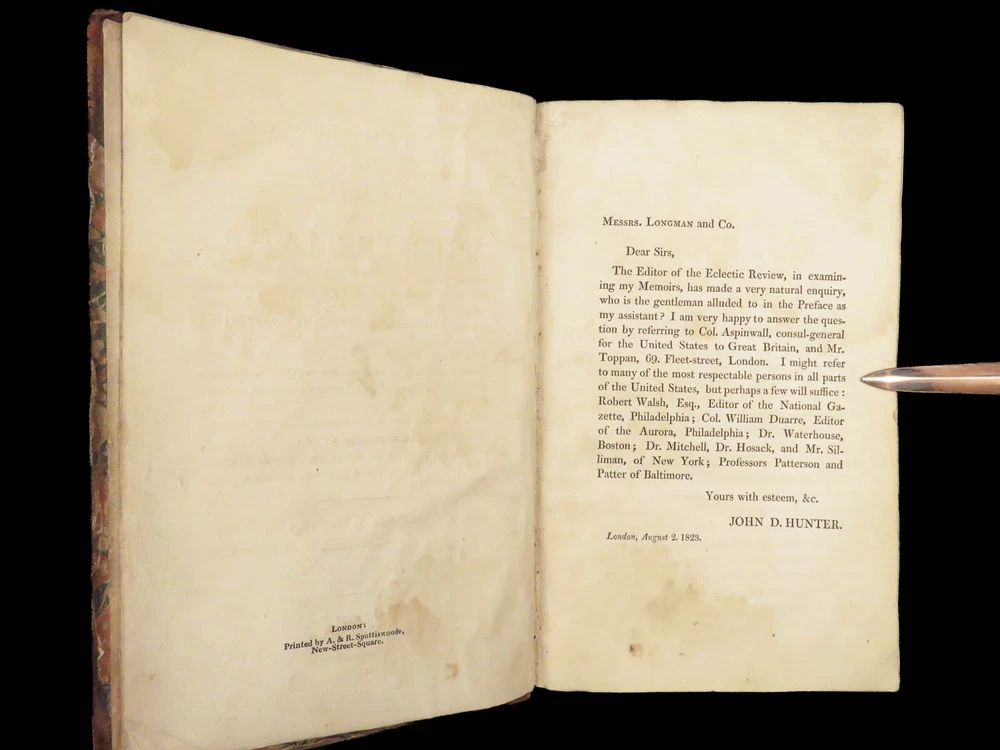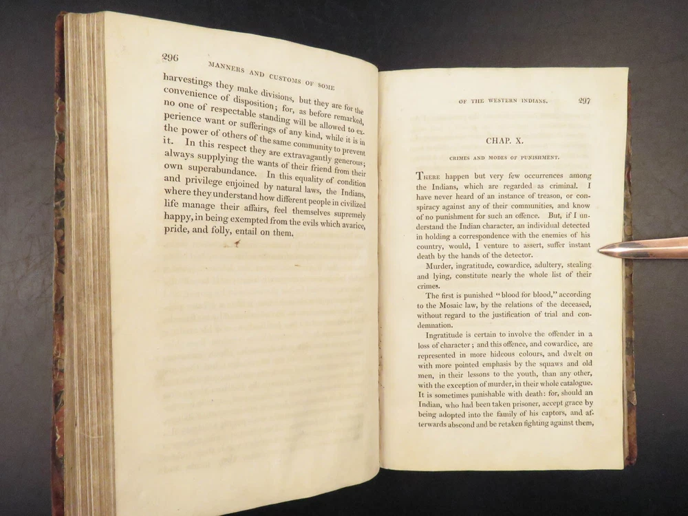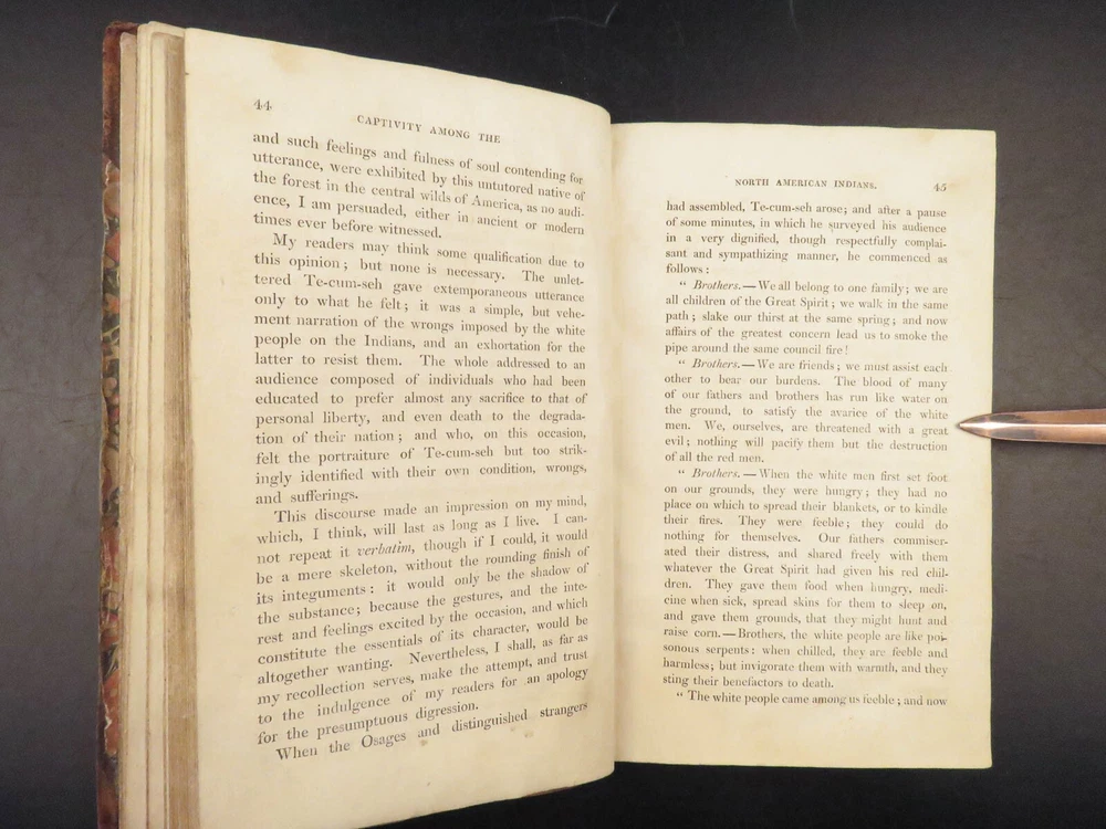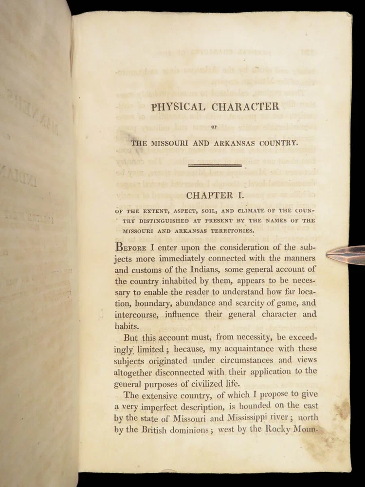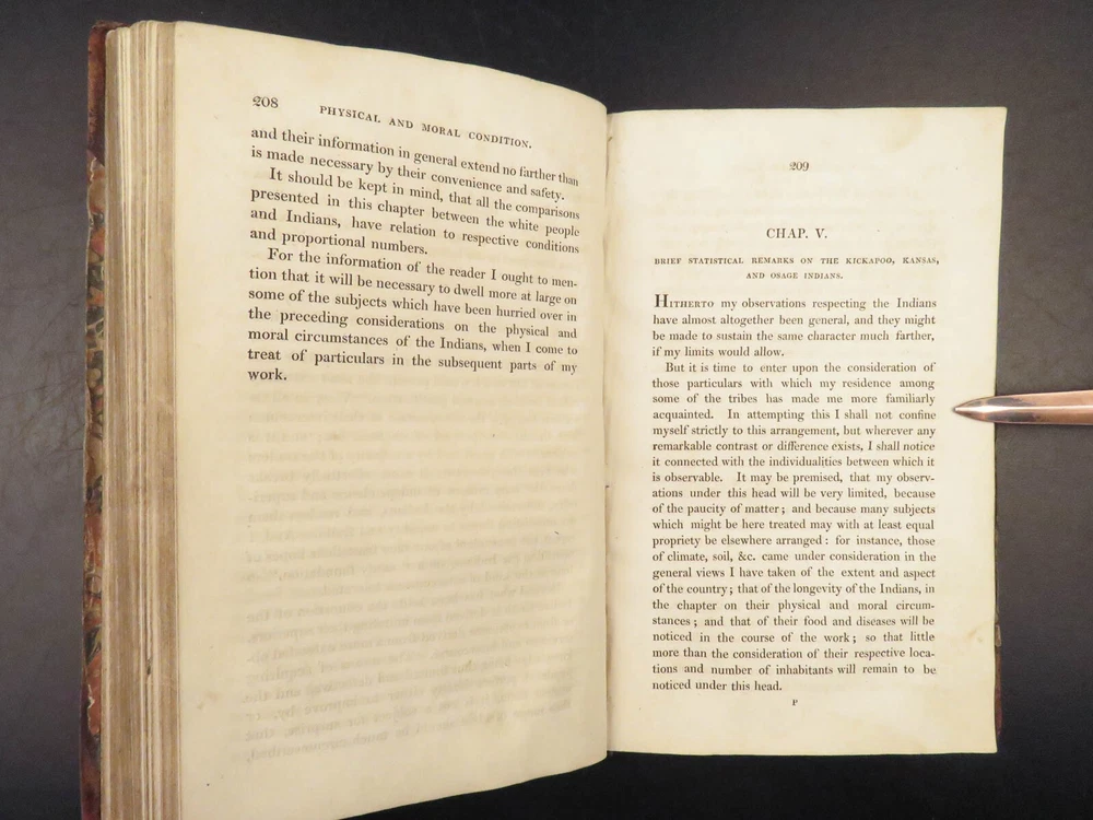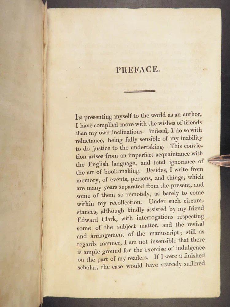1823 INDIANS 1 ed John Hunter Captivity Kickapoo Cherokee Fredonian Rebellion John Dunn Hunter was an early 19 th -century American who was taken prisoner at birth by the Kickapoo Indians. Hunter himself knew nothing of his origins and only took the name Hunter as he claimed to be a proficient hunter. He is best remembered for his role in the Fredonian Rebellion – Texas’s first attempt to secede from Mexico – and the negotiations that he conducted with Cherokee tribes. However, prior to the Rebellion, which would ultimately cause his death, Hunter wrote a bibliographic sketch of his life among the Indians and the various tribes he encountered while in Missouri, Arkansas, and Texas. Per Wagner Camp: “His account of life among the Kansas and Osage Indians and his experiences on the prairies sound entirely credible.” Item number: #25665 Price: $499 HUNTER, John Dunn Memoirs of a captivity among the Indians of North America, from childhood to the age of nineteen London: Longman, Hurst, Rees, Orme, Brown & Green, 1823. First edition. Details : · Collation: Complete with all pages o [2], ix, [1], 447, [1] o Engraved portrait frontispiece · References: Sabin 33921; Wagner-Camp 24:2; Howes H 813; Field 743 · Language: English · Binding: Leather; secure · Size : ~8.5in X 5.5in (21.5cm x 14cm) Our Guarantee: Very Fast. Very Safe. Free Shipping Worldwide. Customer satisfaction is our priority! Notify us with 7 days of receiving, and we will offer a full refund without reservation!