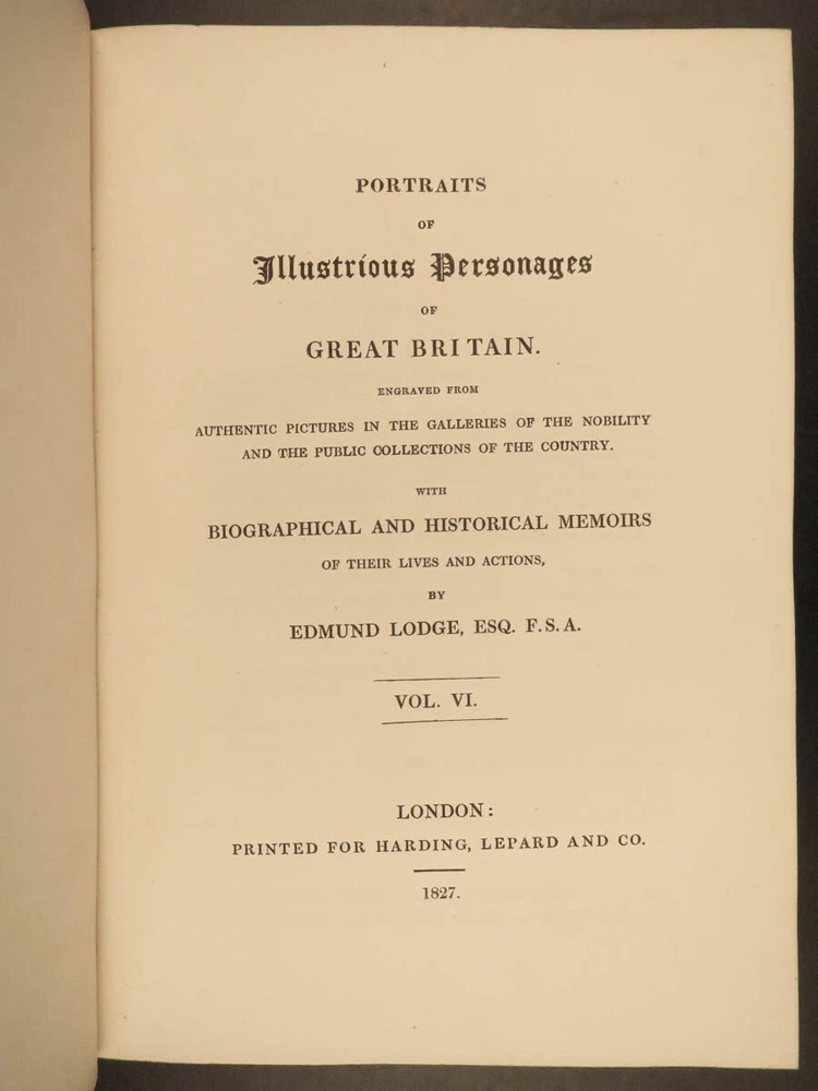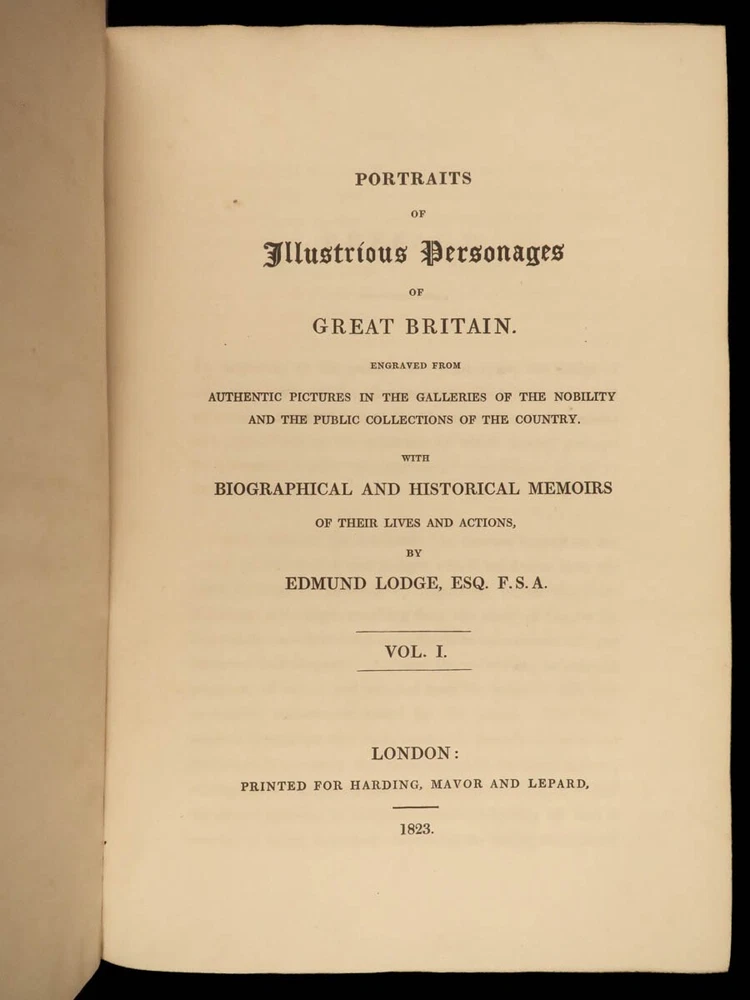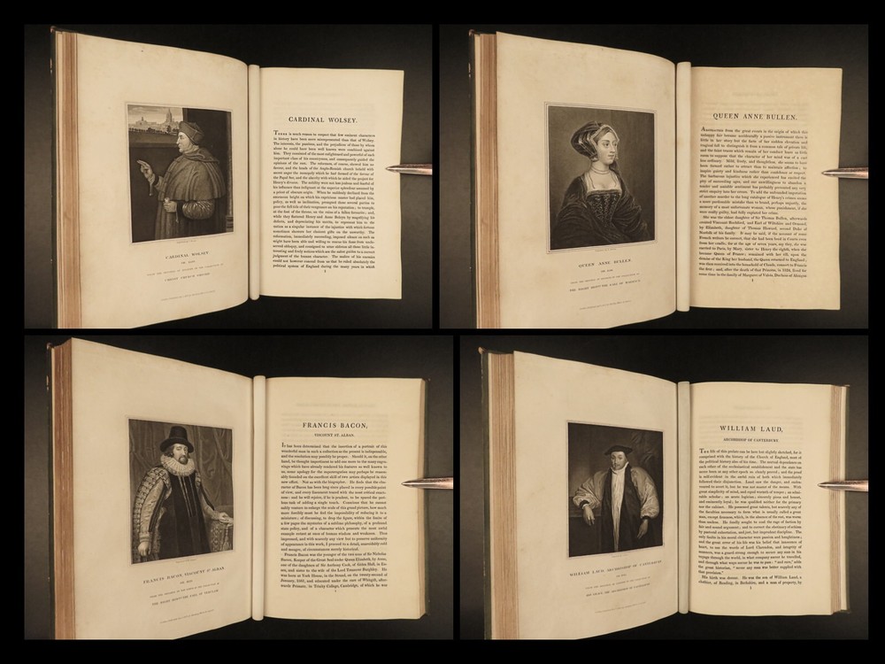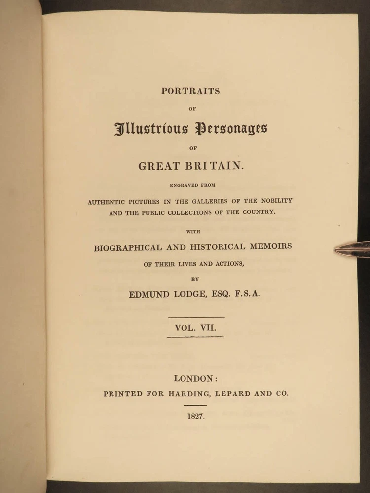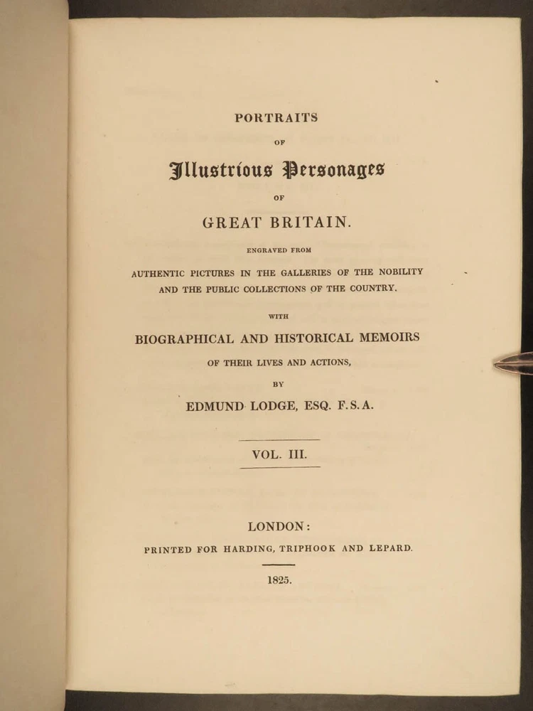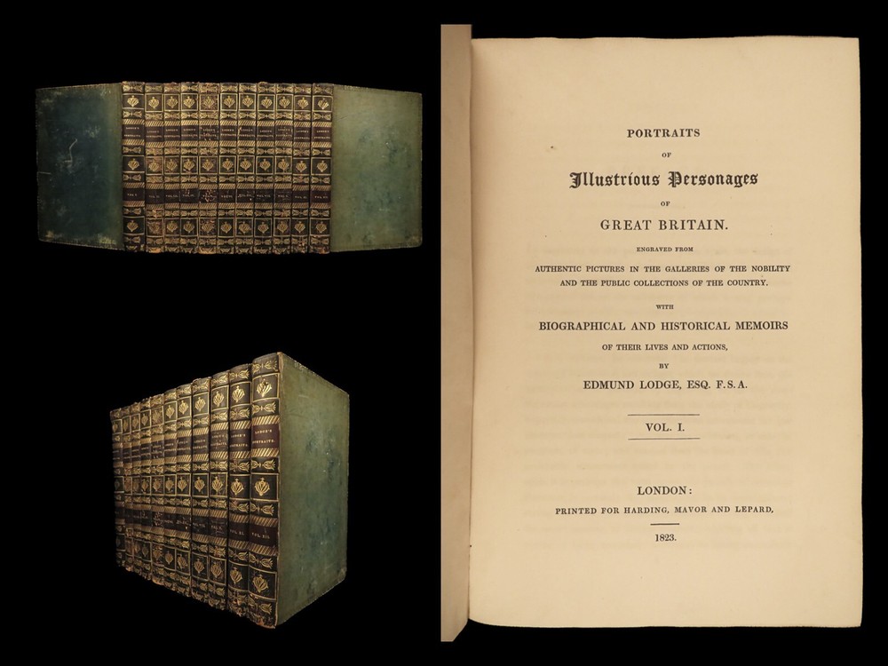 1823 Portraits of Illustrious Personages 206 PLATES Bacon Cromwell Raleigh Queen Edmund Lodge was a long-serving English officer of arms, a writer on heraldic subjects, and a compiler of short biographies. However, he was most remembered for his work ‘ Portraits of Illustrious Personages of Great Britain’ . This work describes some of the most renowned persons in Great Britain. Notable names include: · Thomas Cromwell · Sir Francis Drake · Francis Bacon · Sir Walter Raleigh · William Laud, Archbishop of Canterbury · Queen Catharine Parr · Queen Jane Seymour This stunning 1823 three-volume set features 206 steel engravings in exquisite condition . Item number: #22282 Price: $950 LODGE, Edmund Portraits of Illustrious Personages of Great Britain: Engraved from authentic pictures, with biographical & historical memoirs of their lives. London: Printed for Harding, Mavor and Lepard. [1823-1834] Details : · Collation: Complete with all pages; 11 volumes (of 12) o Volumes I-VIII, X-XII o 206 Steel-Engraved Plates · Language: English · Binding: Leather; secure · Size : ~10.25in X 7.25in (26cm x 18.5cm) Our Guarantee: Very Fast. Very Safe. Free Shipping Worldwide. Customer satisfaction is our priority! Notify us with 7 days of receiving, and we will offer a full refund without reservation! 22282