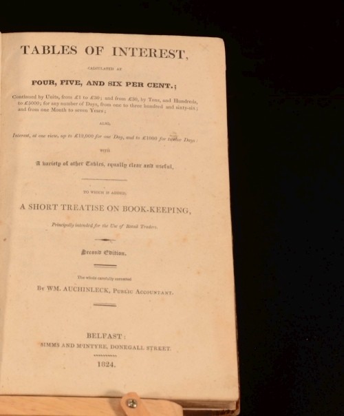 Click here to see our other books! Tables of Interest Calculated at Four, Five, and Six Per Cent with a Short Treatise on Book-Keeping Wm. Auchinleck, Public Accountant 1824 Simms & M'Intyre : Belfast 8" by 5" 183pp SUMMARY A handsome and very scarce Victorian economics aid, bearing the bookplate of Irish noteworthy Samuel Cunningham. Leather Binding,Very Scarce Overall Condition: Very Good This book weighs 1 KG when packed UK Postage: £ 3.99 US Postage: £ 22.99 EU Postage : £ 16.99 European Postage: £ 17.99 Asia Postage: £ 22.99 Worldwide Postage: £ 28.99 DESCRIPTION This scarce work is a fascinating piece of social history, that reminds us that the vast majority of human history is comprised of everyday people going about their everyday lives. This volume contains interest tables calculated at several percentiles for all sums from £1-£30; and thence to £5000 by tens and hundreds. Appended is a short course on bookkeeping and some example ledgers. Samuel Cunningham PC (1862-1946) was an Irish privy councillor, politician, stockbroker, and businessman. He had business interests in the Northern Whig newspaper, and Murray's tobacco. Cunningham served on the Senate of Northern Ireland from 1921 until 1945. His sons included Sir Josias Cunningham (who succeeded him at the family finance firm) and Dunlop Cunningham (who succeeded him at Murray's). CONDITION In half calf binding, with dark green cloth boards, and gilt lettering to spine. Externally sound. Rubbing to the head and tail of the spine, to the joint and to the extremities. Several charming ink blots to front board. Internally, firmly bound. Pages are generally bright and clean, with the odd spot throughout. Overall Condition: Very Good GLOSSARY OF TERMS Overall Condition (Dustwrapper condition rating is shown after that for the book itself, where a dustwrapper is present) Fine - Very well preserved copy showing very little wear Very Good Indeed - Only one or two minor faults, really a very attractive copy Very Good - Quite a wide term meaning no major faults but probably several smaller ones often expected given the age of the book, but still a respectable copy Good - Meaning not very good. Some more serious faults as will be described in the condition report under 'condition' Good Only - Meaning one or more faults that could really do with repair Fair - As with good only above but with other faults leaving a compromised copy even after repair Poor - Really bad and possibly seriously incomplete. We only sell books in this condition where their rarity or value makes them attractive none the less. Major defects will be described. GUARANTEE We offer a full money back guarantee on our descriptions. Please ask for details and conditions. We prefer PAYPAL. If you pay via PAYPAL we will post the item off the same or the next working day with the postage you have selected. Please note we cannot accept USD cheques