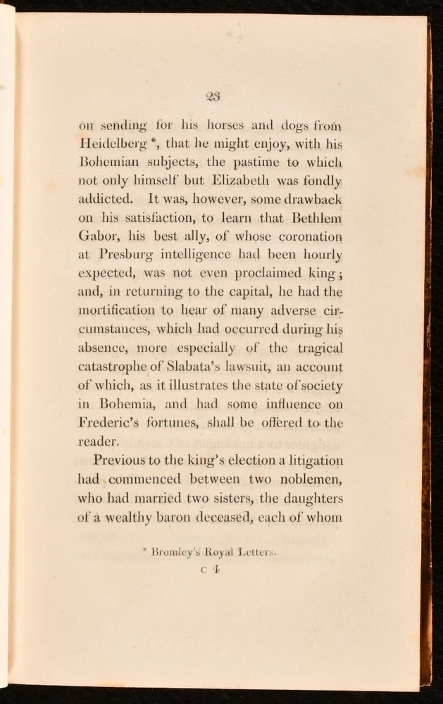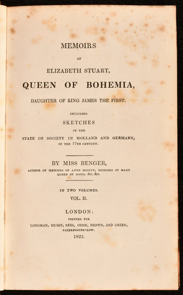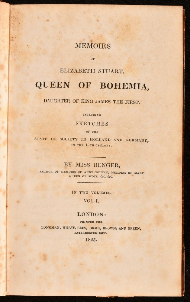 Click here to see our other books! Memoirs of Elizabeth Stuart, Queen of Bohemia Miss Benger 1825 Longman, Hurst, Rees, Orme, Brown and Green : London 8" by 5" xix, 367; vii, 465pp SUMMARY A lovely complete two volume set of this fascinating memoir of the Winter Queen. A first edition of this work. Leather Binding Overall Condition: Very Good This book weighs 1 KG when packed UK Postage: £ 3.99 US Postage: £ 15.99 EU Postage : £ 13.99 European Postage: £ 14.99 Asia Postage: £ 18.99 Worldwide Postage: £ 19.99 DESCRIPTION A complete two volume set, in in the first edition. This fascinating biography was written by Elizabeth Benger an English novelist, biographer and poet. Elizabeth Stuart, was Electress of the Palatinate and Queen of Bohemia as the wife of Frederick V of the Palatinate, a state that was part of the Holy Roman Empire. As her husband's reign lased for just one winter she is called the Winter Queen. The volumes also include sketches of the state of society in Holland and Germany in the 17th Century. With a portrait of Queen Elizabeth to the first volume. Missing the folding plate in Volume I showing the maternal descent of Elizabeth Stuart as well as her own descendants. CONDITION In half calf leather binding with marbled boards. Externally, smart with some rubbing to the spines and extremities. Some light marks to the boards. Previous owner inscription to the page after the front free endpaper of both volumes. Internally, firmly bound with bright pages which are generally clean with some spotting to the first few pages, mainly to volume one. Overall Condition: Very Good GLOSSARY OF TERMS Overall Condition (Dustwrapper condition rating is shown after that for the book itself, where a dustwrapper is present) Fine - Very well preserved copy showing very little wear Very Good Indeed - Only one or two minor faults, really a very attractive copy Very Good - Quite a wide term meaning no major faults but probably several smaller ones often expected given the age of the book, but still a respectable copy Good - Meaning not very good. Some more serious faults as will be described in the condition report under 'condition' Good Only - Meaning one or more faults that could really do with repair Fair - As with good only above but with other faults leaving a compromised copy even after repair Poor - Really bad and possibly seriously incomplete. We only sell books in this condition where their rarity or value makes them attractive none the less. Major defects will be described. GUARANTEE We offer a full money back guarantee on our descriptions. Please ask for details and conditions. We prefer PAYPAL. If you pay via PAYPAL we will post the item off the same or the next working day with the postage you have selected. Please note we cannot accept USD cheques