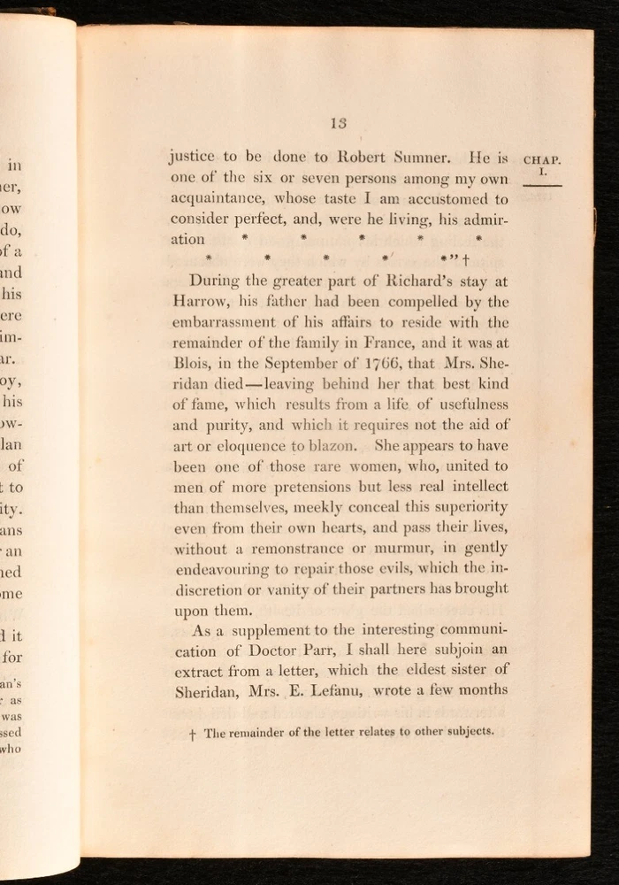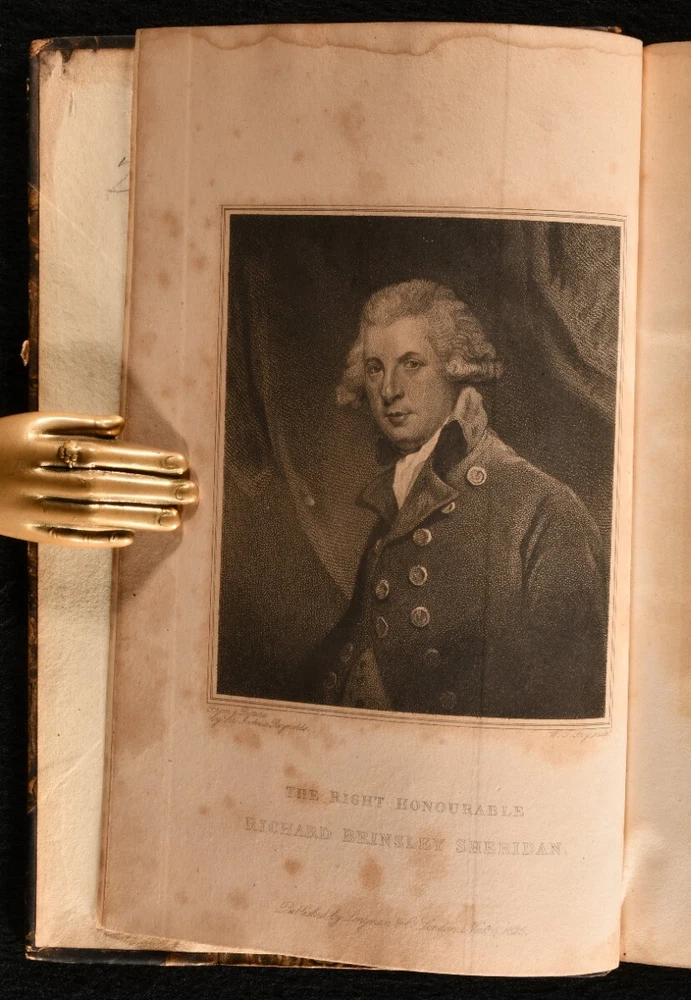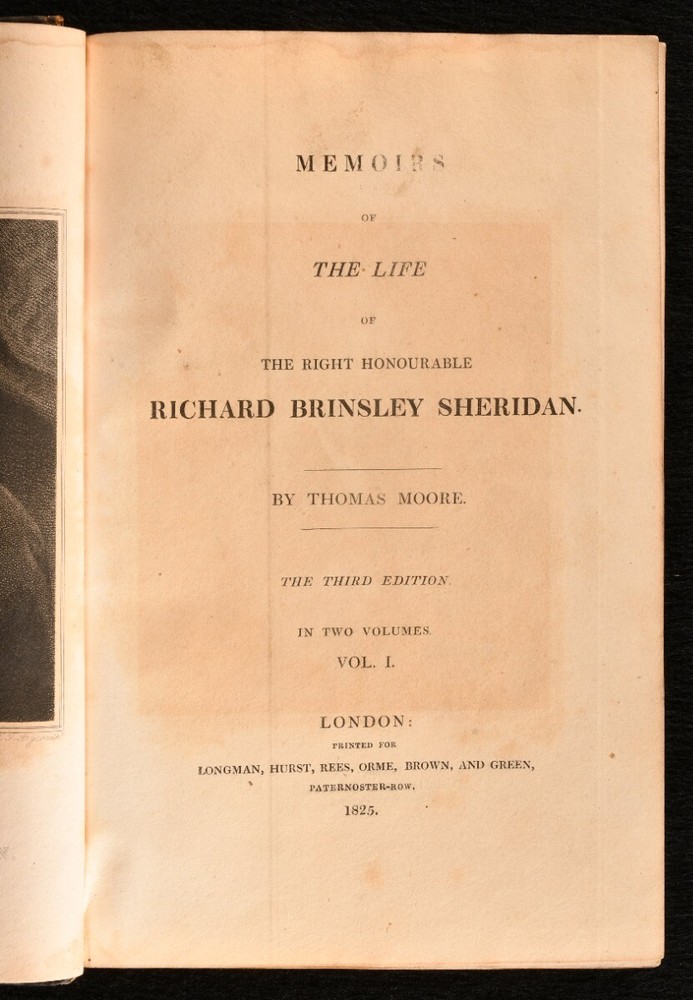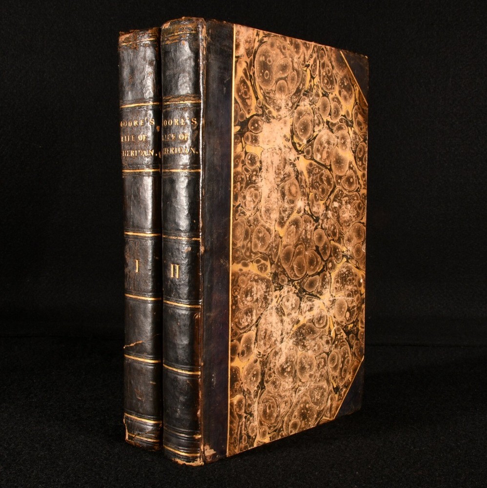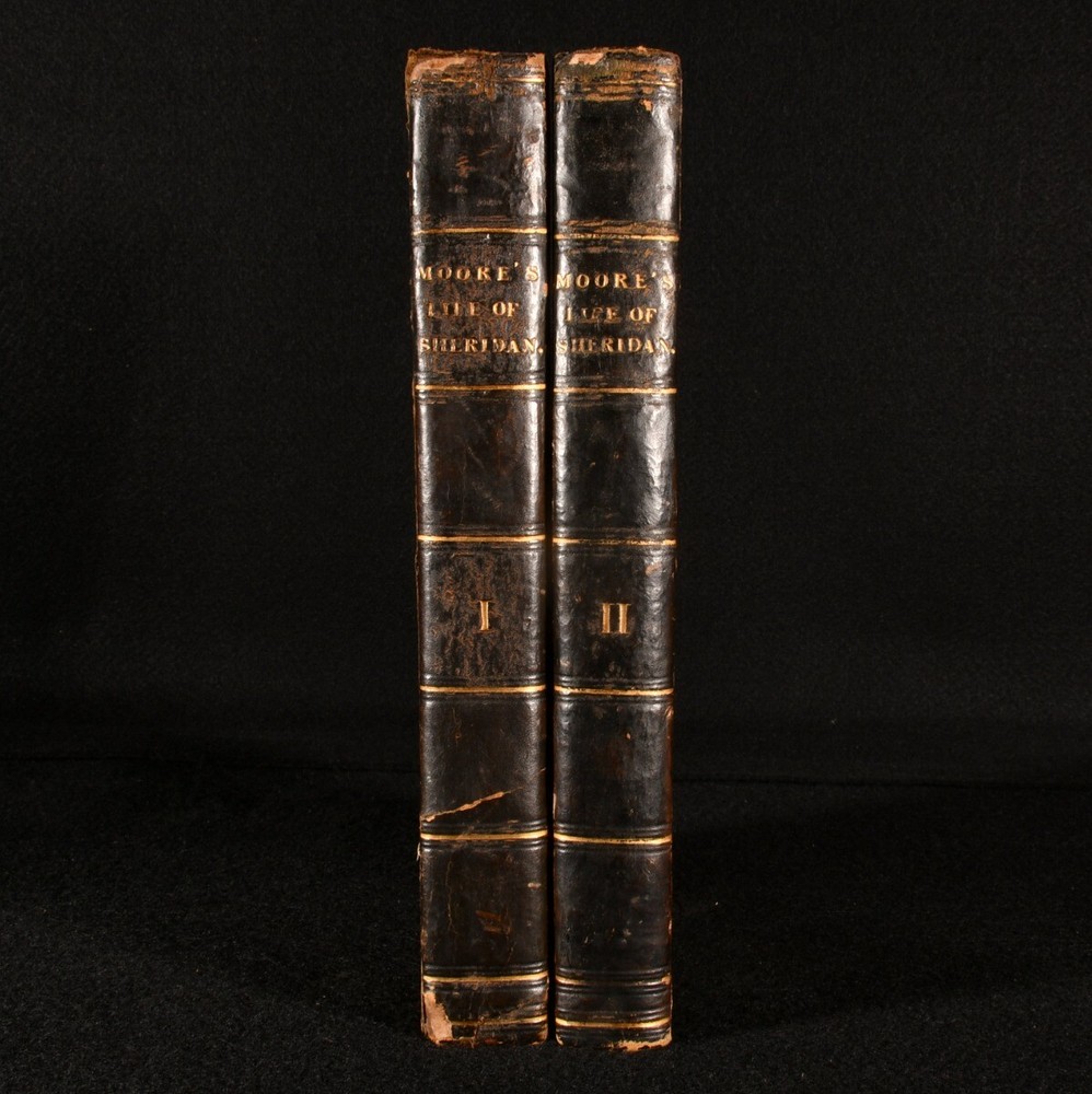 Click here to see our other books! Memoirs of the Life of Richard Brinsley Sheridan Thomas Moore 1825 Longman, Hurst, Rees, Orme, Brown and Green : London 8.5" by 5.5" viii, 543; iv, 492pp SUMMARY A third edition in two volumes, comprising a biography of important British playwright Richard Brinsley Sheridan. Leather Binding Overall Condition: Very Good This book weighs 1.5 KG when packed UK Postage: £ 3.99 US Postage: £ 23.99 EU Postage : £ 18.99 European Postage: £ 19.99 Asia Postage: £ 31.99 Worldwide Postage: £ 32.99 DESCRIPTION Richard Brinsley Sheridan (1751-1816) was an Irish playwright and poet, also known for owning the London Theatre Royal. He was honoured with burial at Poet's Corner in Westminster Abbey, and remembered for plays such as 'School for Scandal, 'The Rivals', 'The Duenna' and 'A Trip to Scarborough'. Written by Thomas Moore, (1779-1852), an Irish poet renowned for combining English and Irish tradition in his verse, and less kindly remembered for the role he had in destroying the manuscripts of Lord Byron, Romantic poet and politician. He also penned a biography of Lord Edward Fitzgerald and a four volume History of Ireland. A third edition of this work, printed the same year as the first. Volume I is illustrated with a full plate frontispiece of the subject and a folding facsimile plate. CONDITION In a half calf binding. Externally generally smart, with some slight loss to the leather of the head and tails of each spine. Boards are a little bumped, as are the extremities. Internally, firmly bound. Ownership inscription to the front pastedown of volume II. Pages have a few instances of spotting, but are bright and clean otherwise. Overall Condition: Very Good GLOSSARY OF TERMS Overall Condition (Dustwrapper condition rating is shown after that for the book itself, where a dustwrapper is present) Fine - Very well preserved copy showing very little wear Very Good Indeed - Only one or two minor faults, really a very attractive copy Very Good - Quite a wide term meaning no major faults but probably several smaller ones often expected given the age of the book, but still a respectable copy Good - Meaning not very good. Some more serious faults as will be described in the condition report under 'condition' Good Only - Meaning one or more faults that could really do with repair Fair - As with good only above but with other faults leaving a compromised copy even after repair Poor - Really bad and possibly seriously incomplete. We only sell books in this condition where their rarity or value makes them attractive none the less. Major defects will be described. GUARANTEE We offer a full money back guarantee on our descriptions. Please ask for details and conditions. We prefer PAYPAL. If you pay via PAYPAL we will post the item off the same or the next working day with the postage you have selected. Please note we cannot accept USD cheques