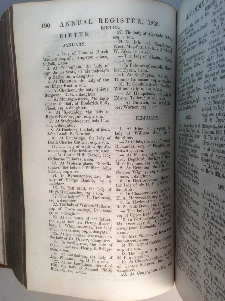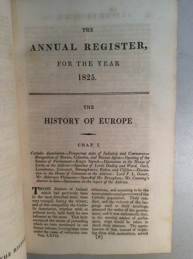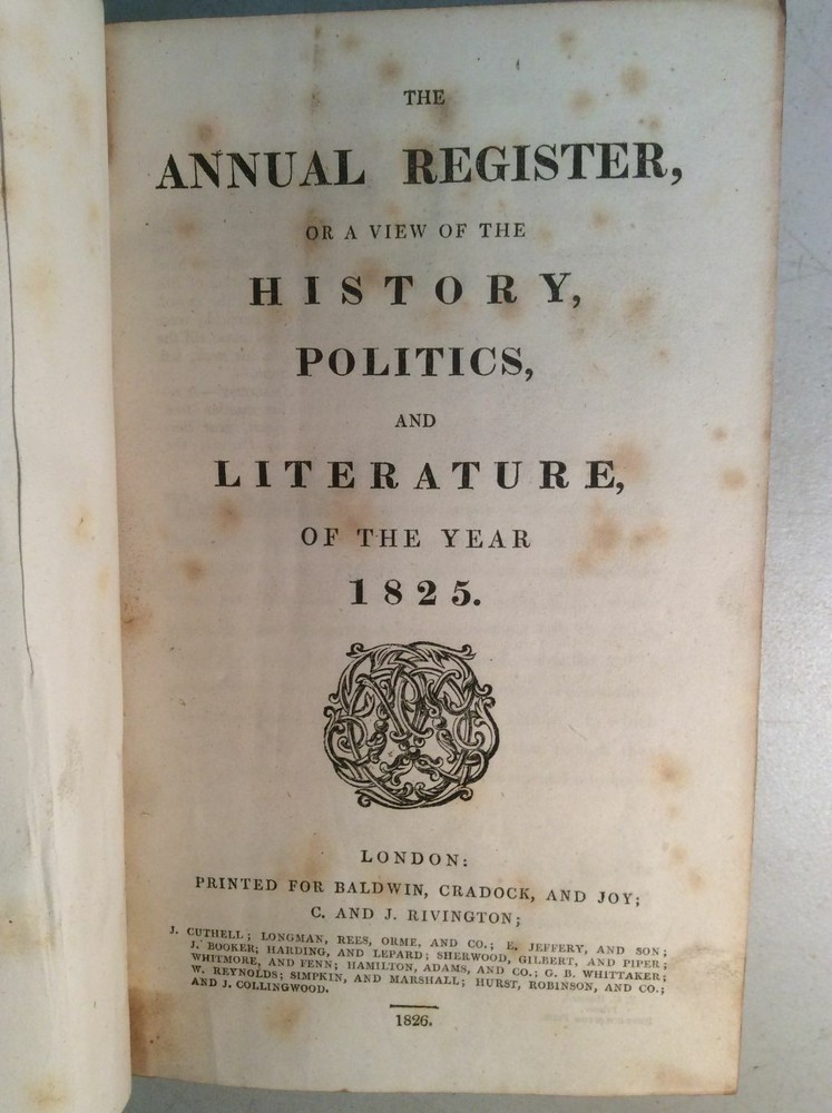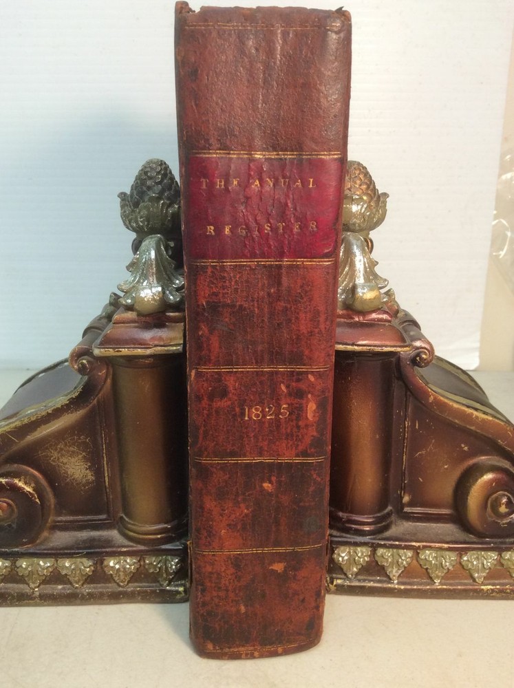 Attention Collectors!!! You are bidding on a rare antique hardcover book titled: The Annual Register, or A View of the History, Politics, and Literature, of the Year 1825. Printed for Baldwin, Cradock, and Joy: C. and J. Rivington, 1826. Book is a treasure trove of information for the year 1825, including a section Physical Form and Character of the Siamese, Manners and Customs of the Siamese, Manners and Customs of the People of Cochin, China, and so much more!!!! Imagine, this book is almost 200 years old!!! The book is quarter-bound in leather with leather tips. Titling is in gold or red morocco leather label on spine. The binding shows corner and edge wear, as you would expect with a book almost 200 years old! All pages are present, and are tightly bound. The first and last few pages shows foxing with the remainder of pages in very good condition. Most pages have no foxing at all. There are no signs of previous ownership. Book remains in good condition! Nice rare, antique book to add to a collection! Very collectible! Great gift idea! (Inventory: 1296-Z-1) Track Page Views With Auctiva's FREE Counter