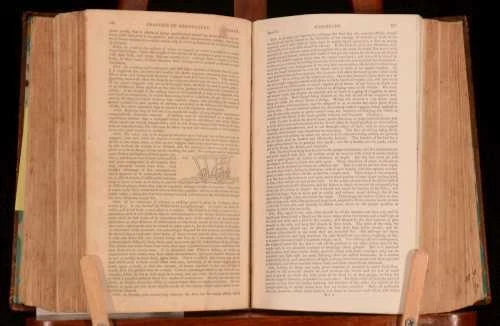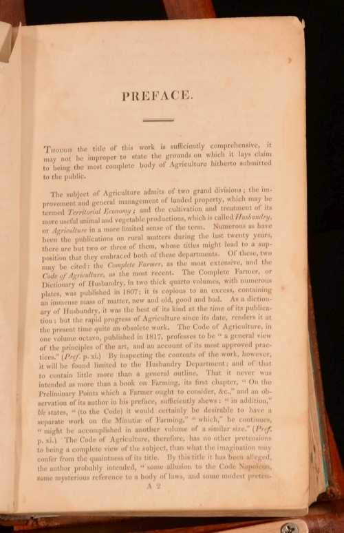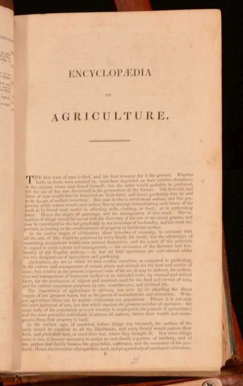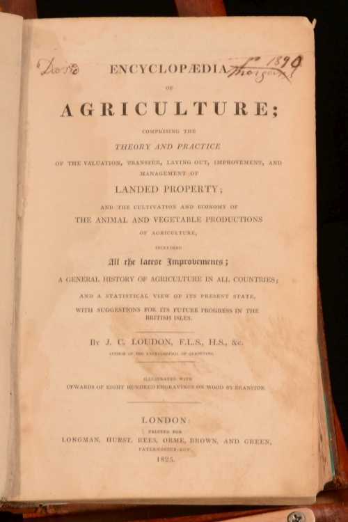 Click here to see our other books! An Encyclopaedia of Agriculture; Comprising the Theory and Practice of the Valuation, Transfer, Laying Out, Improvement, and Management of Landed Property; and the Cultivation and Economy of the Animal and Vegetable Productions of Agriculture, Including All the latest Improvements; a General History of Agriculture in all Countries; and a Statistical View of its Present State, with Suggestions for its Future Progress in the British Isles J. C. Loudon; F.L.S.; H.S.; & c. 1825 Longman, Hurst, Rees, Orme, Brown, and Green : London 8.5" by 6" xvi, 540, 615-621, 557-1226, 16pp with publisher's catalogue to rear SUMMARY An Encyclopaedia of Agriculture comprising detailed examinations of the agricultural structures and skills as well as the general history in all countries. First Edition,Illustrated,Leather Binding,Rebound Overall Condition: Good This book weighs 1 KG when packed UK Postage: £ 3.99 US Postage: £ 22.99 EU Postage : £ 16.99 European Postage: £ 17.99 Asia Postage: £ 22.99 Worldwide Postage: £ 28.99 DESCRIPTION First edition. With engraved illustrations integrated with text and with a new section bound in regarding railroads and canals, probably from a more recent edition of the same book, replacing pages 541-556 and differently paginated as 615-621pp. Previous owner's ink inscription to front and to last page of text and with a note from a previous owner inserted. CONDITION Rebound in calf with newer endpapers. Externally, sound but with some wear to extremities. Joints starting. Internally, firmly bound. Bright but with occasional slight foxing and handling marks. Loss to title where past inscription is. Overall Condition: Good GLOSSARY OF TERMS Overall Condition (Dustwrapper condition rating is shown after that for the book itself, where a dustwrapper is present) Fine - Very well preserved copy showing very little wear Very Good Indeed - Only one or two minor faults, really a very attractive copy Very Good - Quite a wide term meaning no major faults but probably several smaller ones often expected given the age of the book, but still a respectable copy Good - Meaning not very good. Some more serious faults as will be described in the condition report under 'condition' Good Only - Meaning one or more faults that could really do with repair Fair - As with good only above but with other faults leaving a compromised copy even after repair Poor - Really bad and possibly seriously incomplete. We only sell books in this condition where their rarity or value makes them attractive none the less. Major defects will be described. GUARANTEE We offer a full money back guarantee on our descriptions. Please ask for details and conditions. We prefer PAYPAL. If you pay via PAYPAL we will post the item off the same or the next working day with the postage you have selected. Please note we cannot accept USD cheques