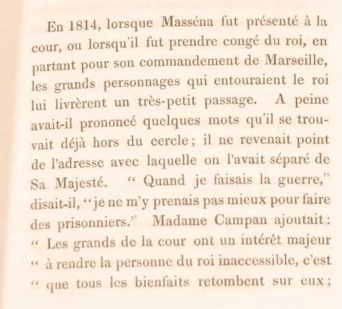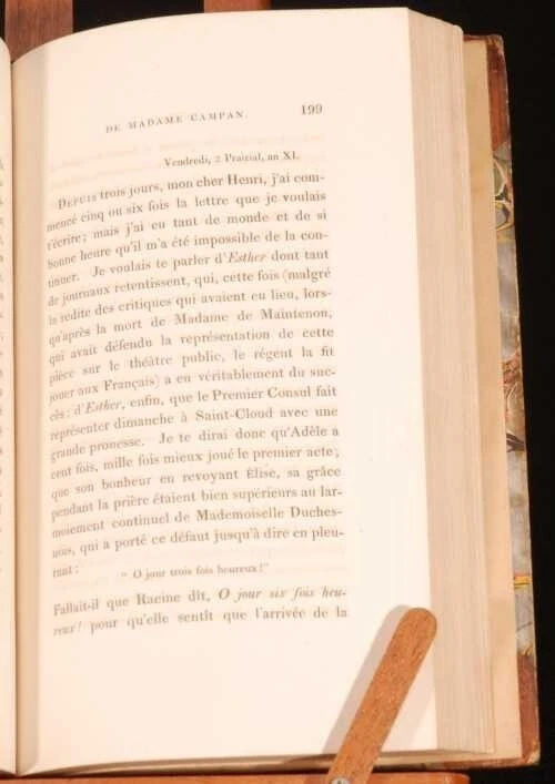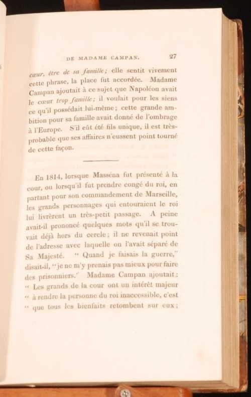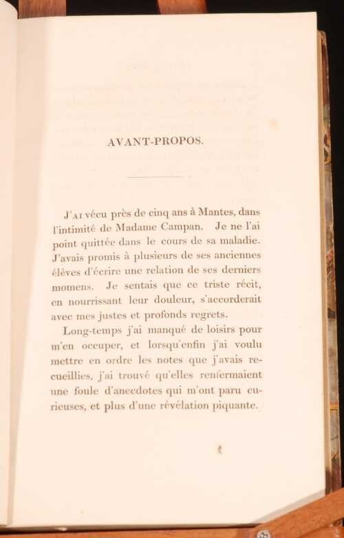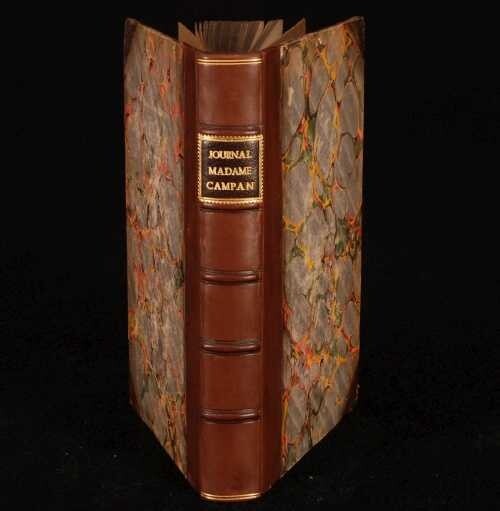 Click here to see our other books! Journal Anecdotique de Madame Campan; Ou, Conversations Recueillies dans ses Entretiens M. Maigne; Jeanne-Louise-Henriette Campan 1825 Chez Colburn : Paris 8.5" by 5.5" vi, 388pp SUMMARY The first edition of this collection of the journals of Jeanne-Louise-Henriette Campan. First Edition,Leather Binding,Rebound Overall Condition: Very Good This book weighs 0.75 KG when packed UK Postage: £ 3.99 US Postage: £ 19.99 EU Postage : £ 15.99 European Postage: £ 16.99 Asia Postage: £ 21.99 Worldwide Postage: £ 25.99 DESCRIPTION The first edition of this work. In the original French. The journals of Jeanne-Louise-Henriette Campan. Jeanne-Louise-Henriette Campan, born Henriette Genet was a French educator and lady-in-waiting to Queen Marie Antoinette before and during the French Revolution. At the age of fifteen she could speak English and Italian, and had gained so high a reputation for her accomplishments as to be appointed reader to the three daughters of Louis XV. At court she was a general favourite, and was appointed first lady of the bedchamber by Marie Antoinette. She continued to be her faithful attendant until she was forcibly separated from her at the storming of the Tuileries on 10 August 1792. Madame Campan survived the dangers of the Terror and started a school, dying in 1822. CONDITION Rebacked in a half calf binding with marbled paper to the boards. Externally, generally smart. Light rubbing to the boards. Minor bumping to the extremities. Internally, firmly bound. Pages are bright and clean with the odd spot. Overall Condition: Very Good GLOSSARY OF TERMS Overall Condition (Dustwrapper condition rating is shown after that for the book itself, where a dustwrapper is present) Fine - Very well preserved copy showing very little wear Very Good Indeed - Only one or two minor faults, really a very attractive copy Very Good - Quite a wide term meaning no major faults but probably several smaller ones often expected given the age of the book, but still a respectable copy Good - Meaning not very good. Some more serious faults as will be described in the condition report under 'condition' Good Only - Meaning one or more faults that could really do with repair Fair - As with good only above but with other faults leaving a compromised copy even after repair Poor - Really bad and possibly seriously incomplete. We only sell books in this condition where their rarity or value makes them attractive none the less. Major defects will be described. GUARANTEE We offer a full money back guarantee on our descriptions. Please ask for details and conditions. We prefer PAYPAL. If you pay via PAYPAL we will post the item off the same or the next working day with the postage you have selected. Please note we cannot accept USD cheques