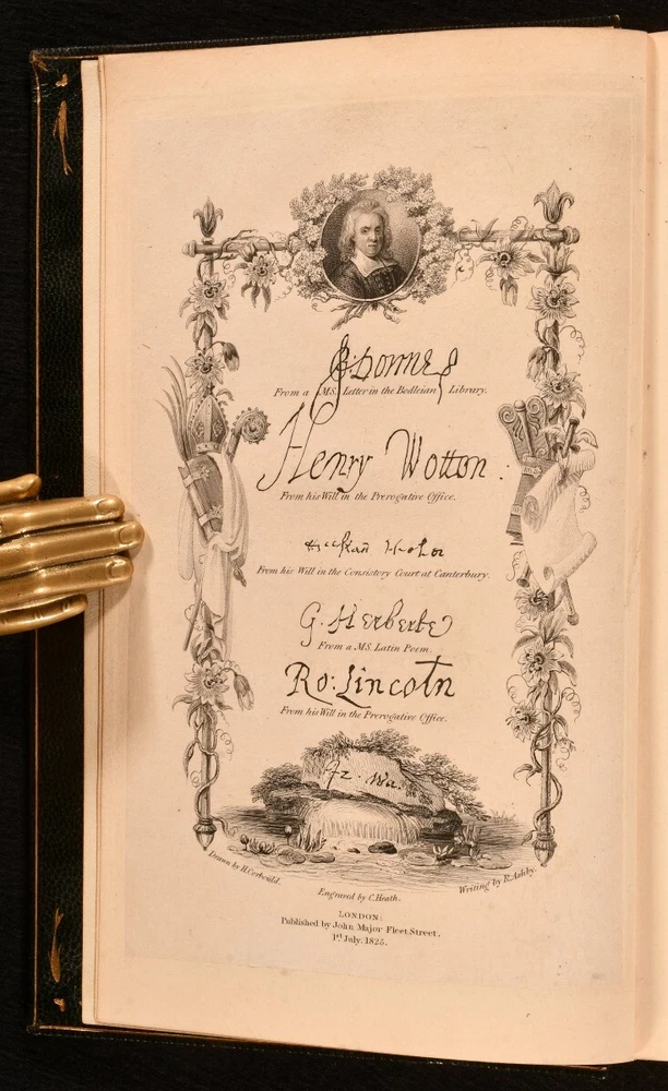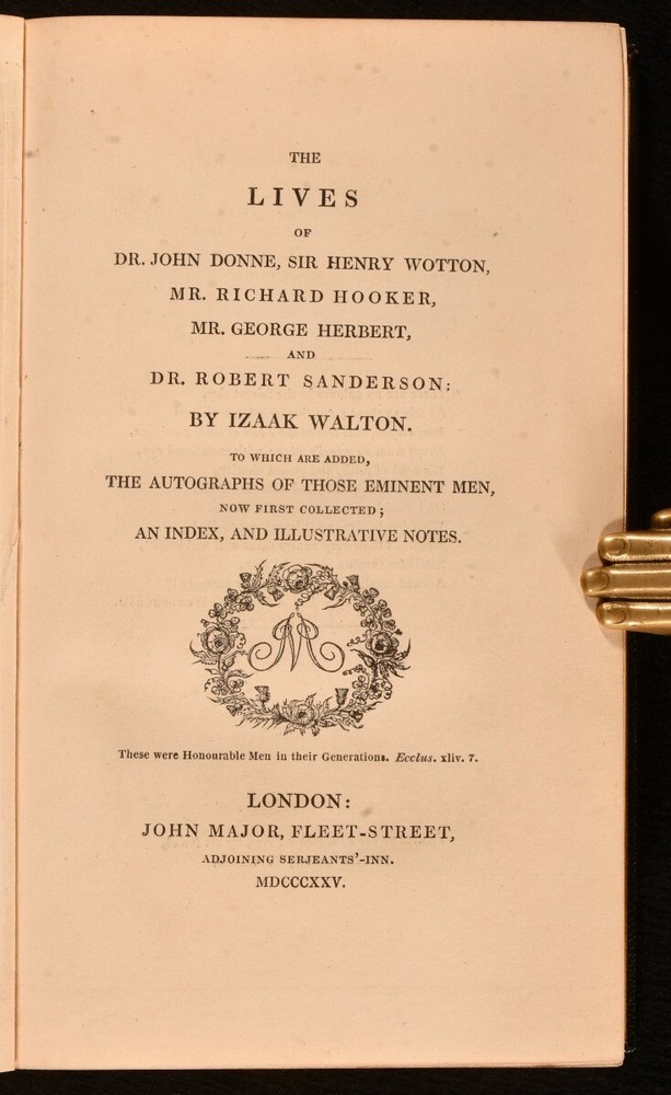 Click here to see our other books! The Lives of Dr. John Donne, Sir Henry Wotton, Mr. Richard Hooker, Mr. George Herbert, and Dr. Robert Sanderson Izaak Walton 1825 John Major : London 8" by 5" xviii, 503pp SUMMARY A beautifully bound edition of Izaak Walton's 'Lives', sumptuously bound by Riviere and Son, complete with detailed plates throughout. Fine Binding,Illustrated,Leather Binding,Signed Binding Overall Condition: Fine This book weighs 1 KG when packed UK Postage: £ 3.99 US Postage: £ 22.99 EU Postage : £ 16.99 European Postage: £ 17.99 Asia Postage: £ 22.99 Worldwide Postage: £ 28.99 DESCRIPTION The first John Major edition. In a striking morocco binding by Riviere and Son. Illustrated with a frontispiece, eleven plates, and engravings. Collated, complete. A series of insightful and concise biographies by Izaak Walton, commonly known as 'Walton's Lives'. This volume explores the lives of John Donne, Henry Wotton, Richard Hooker, George Herbert, and Robert Sanderson. Bookplate of W. A. Foyle of Beeleigh Abbey to the front paste down. CONDITION In a full morocco binding by Riviere and Son. Externally, very smart. Spine is a little faded. Very light bumping to the extremities. Very light rubbing to the spine. Bookplate to the front paste down. Tipped-in note from prior seller to the recto of the front endpaper. Internally, firmly bound. Pages are bright and clean. Overall Condition: Fine GLOSSARY OF TERMS Overall Condition (Dustwrapper condition rating is shown after that for the book itself, where a dustwrapper is present) Fine - Very well preserved copy showing very little wear Very Good Indeed - Only one or two minor faults, really a very attractive copy Very Good - Quite a wide term meaning no major faults but probably several smaller ones often expected given the age of the book, but still a respectable copy Good - Meaning not very good. Some more serious faults as will be described in the condition report under 'condition' Good Only - Meaning one or more faults that could really do with repair Fair - As with good only above but with other faults leaving a compromised copy even after repair Poor - Really bad and possibly seriously incomplete. We only sell books in this condition where their rarity or value makes them attractive none the less. Major defects will be described. GUARANTEE We offer a full money back guarantee on our descriptions. Please ask for details and conditions. We prefer PAYPAL. If you pay via PAYPAL we will post the item off the same or the next working day with the postage you have selected. Please note we cannot accept USD cheques