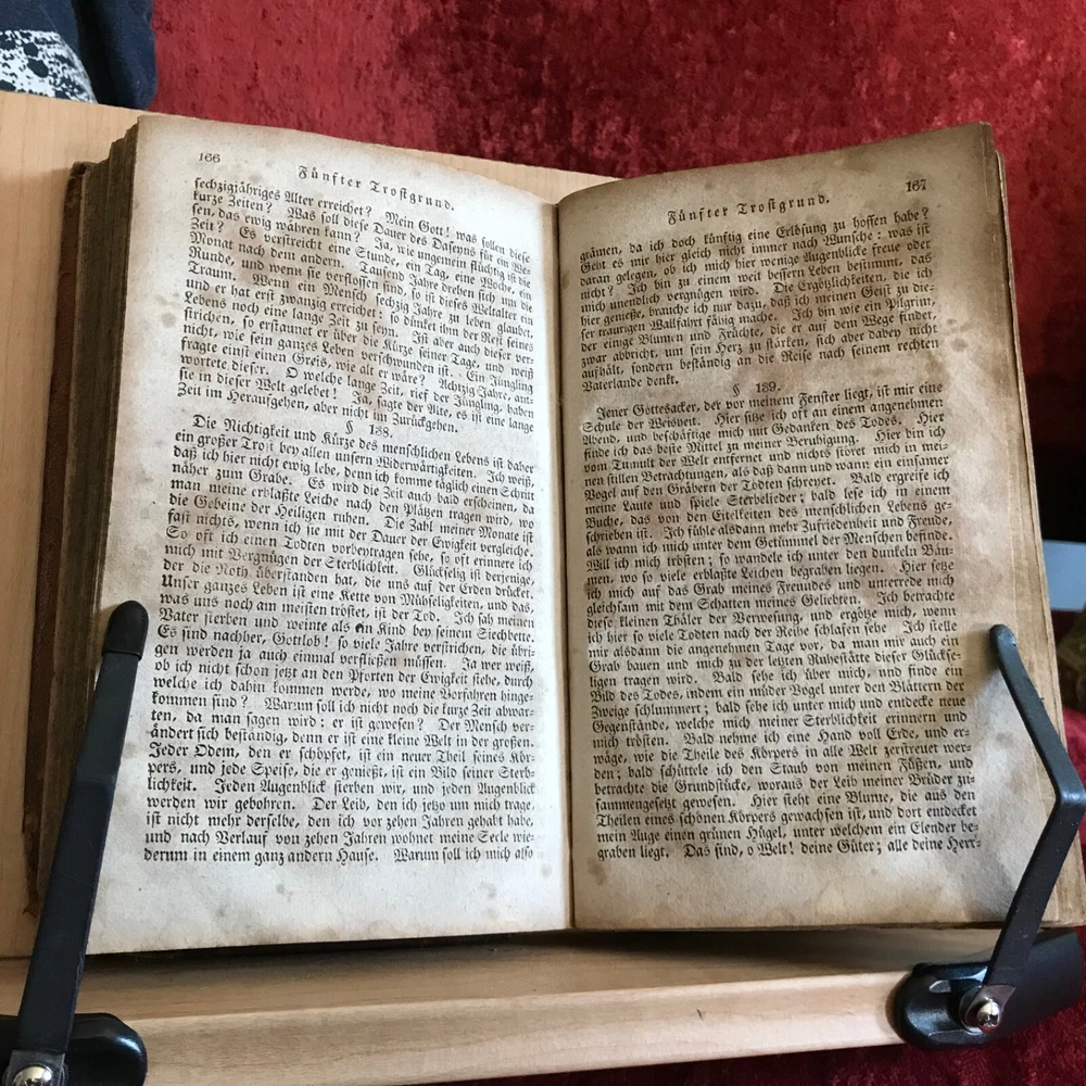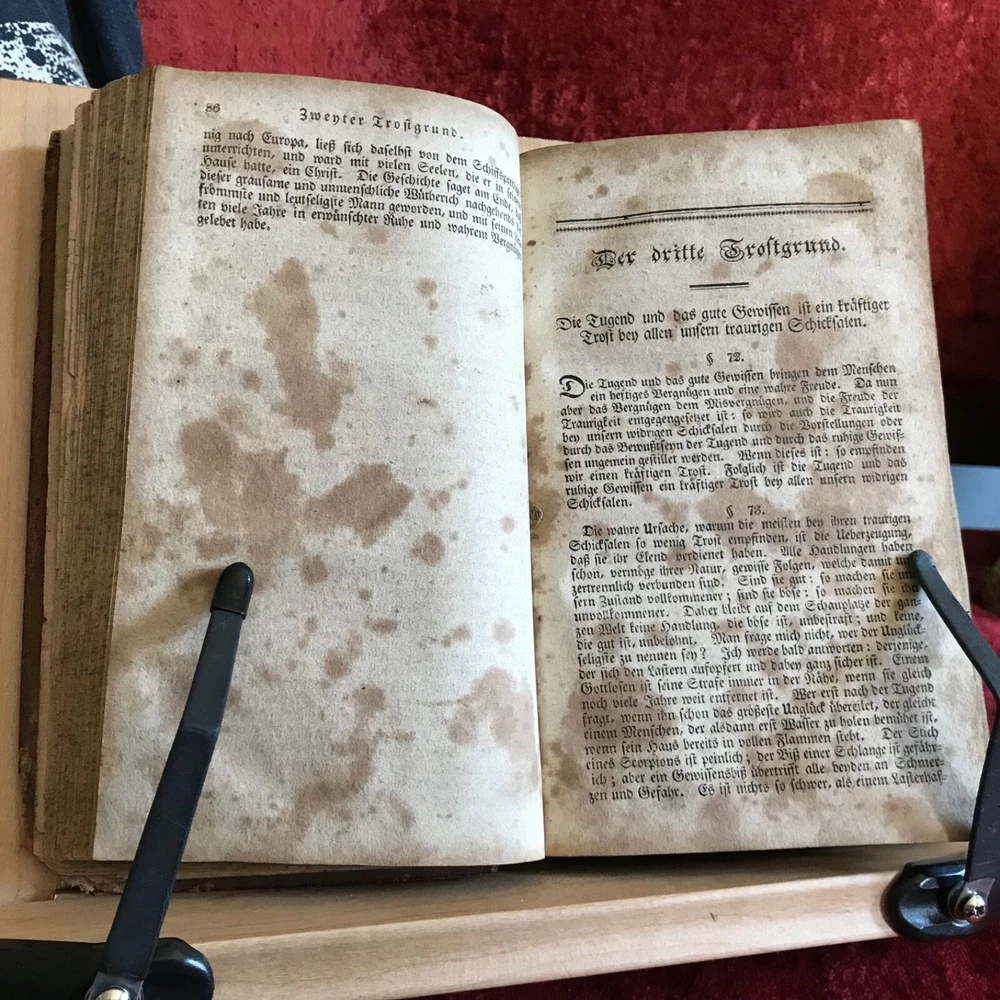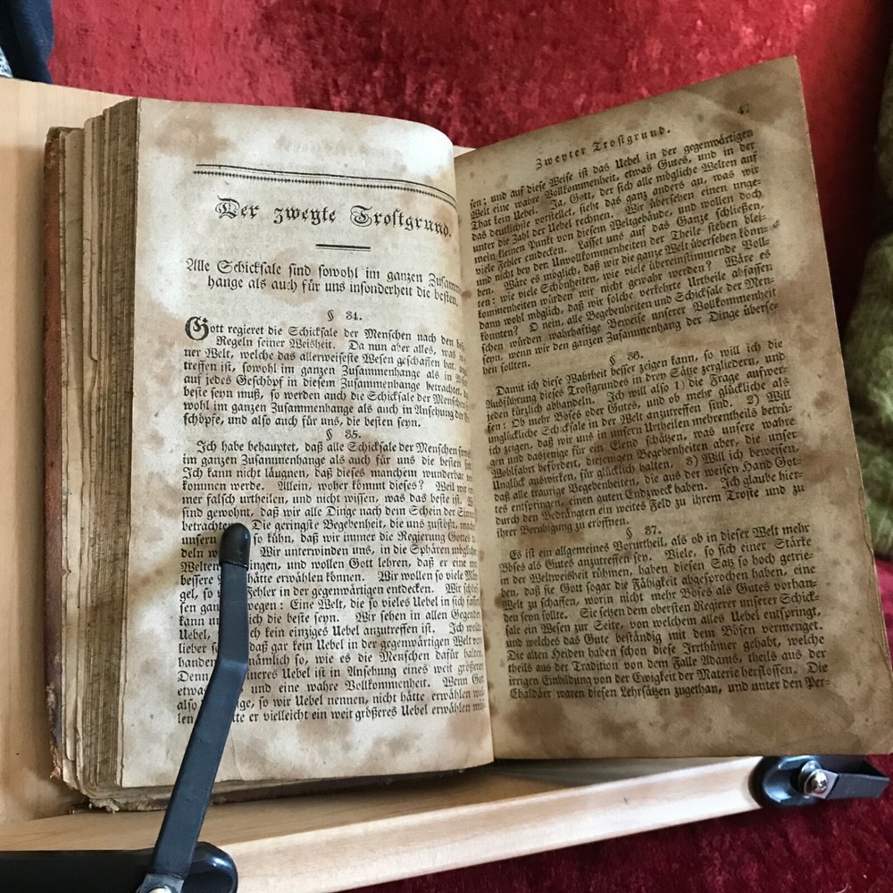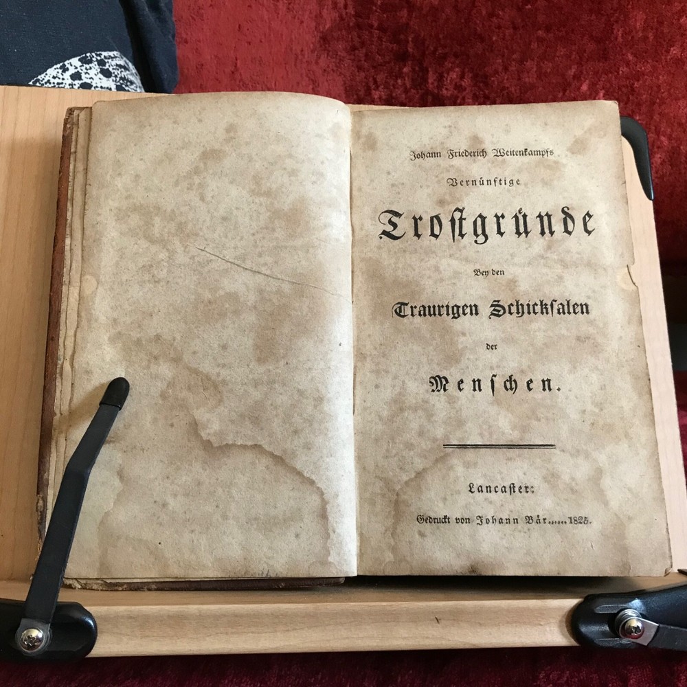 Weitenkampf's Vernünftigte Trostgründe Bey Den Traurigen Schicksalen Der Menschen, Johann Friedrich Weitenkampf, Johann Bar, Lancaster, 1825, 221 pp plus register, full original leather, 7.5 x 4.5”, 12mo. In fair condition. Moderate wear to extremities. Scuffed boards with scratching to surface of leather. Corners worn to board, mostly missing from bottom right hand corner of front board. Creasing to spine with loss at bottom edge. Dampness staining throughout. Toned with scattered foxing. Free of known markings or ownership. Binding tight and intact. Please see photos. COLR1825BDEN