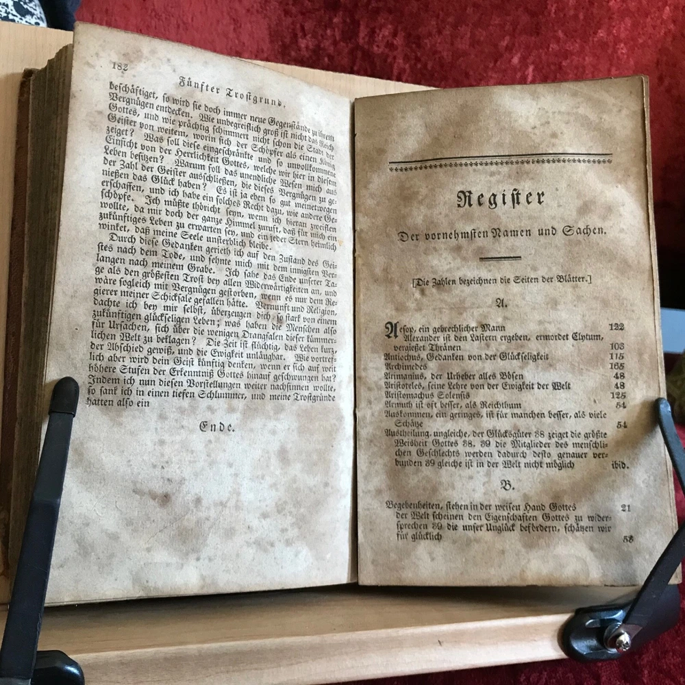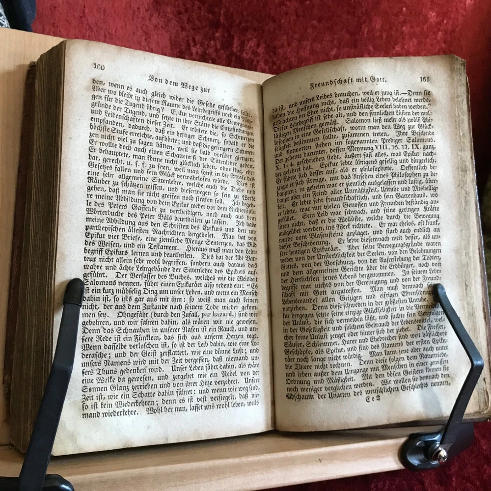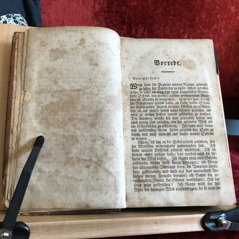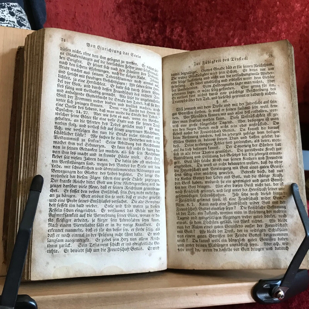 Weitenkampf's Vernünftigte Trostgründe Bey Den Traurigen Schicksalen Der Menschen, Johann Friedrich Weitenkampf, Johann Bar, Lancaster, 1825, 221 pp plus register, full original leather, 7.5 x 4.5”, 12mo. In fair condition. Moderate wear to extremities. Scuffed boards with scratching to surface of leather. Corners worn to board, mostly missing from bottom right hand corner of front board. Creasing to spine with loss at bottom edge. Dampness staining throughout. Toned with scattered foxing. Free of known markings or ownership. Binding tight and intact. Please see photos. COLR1825BDEN