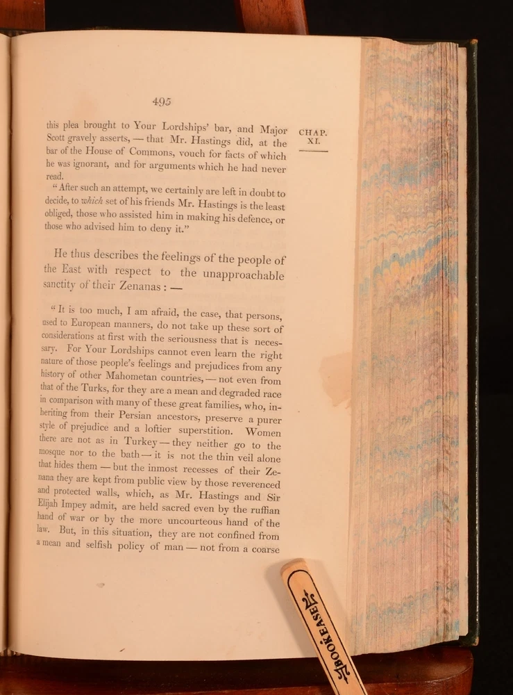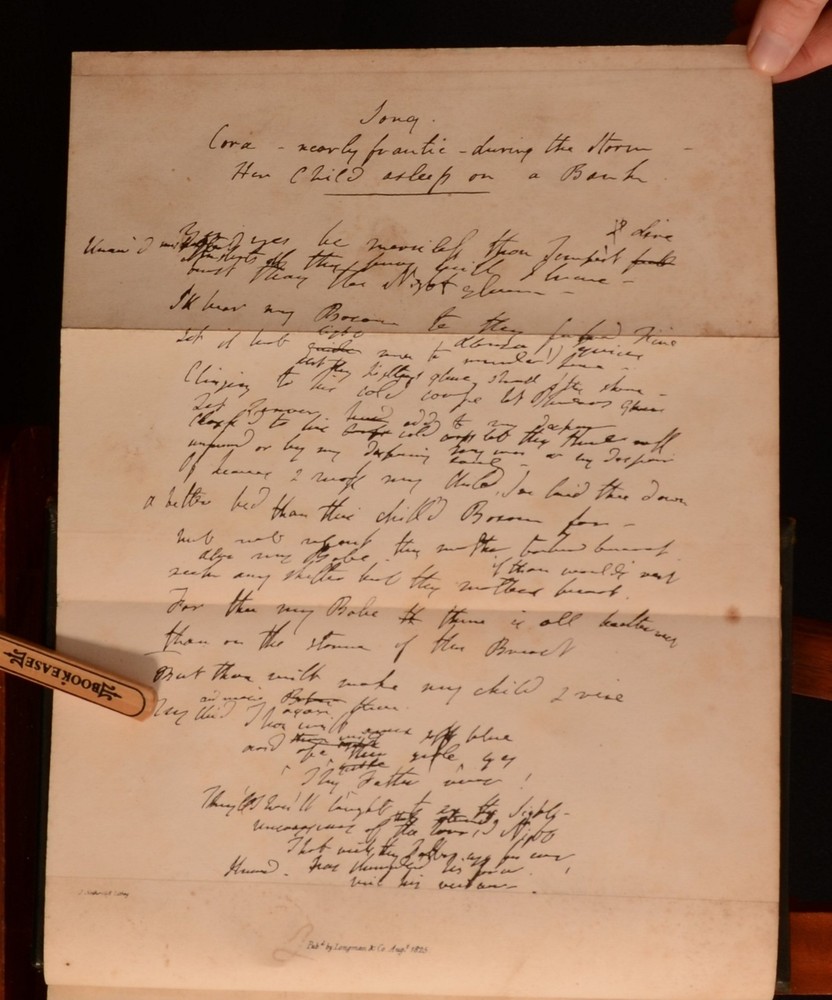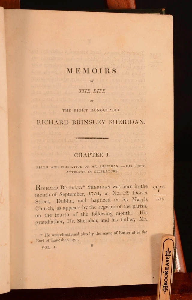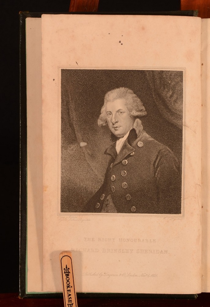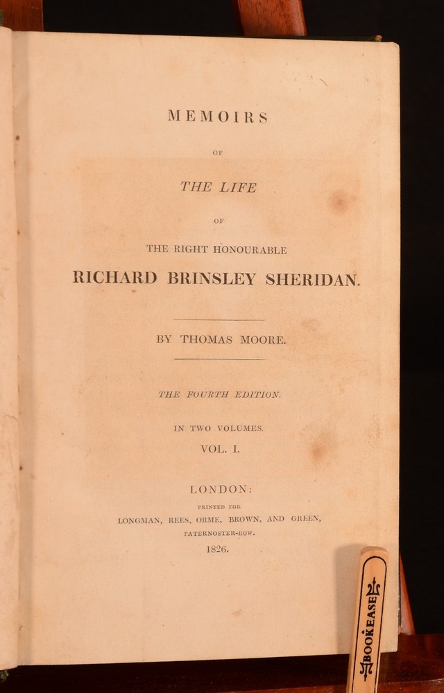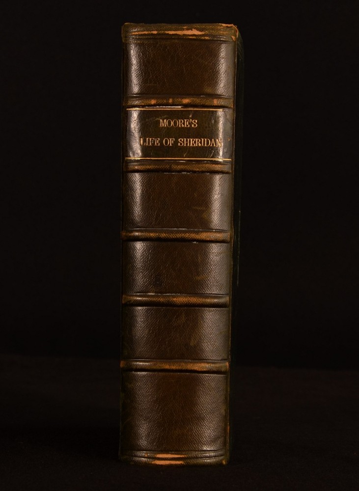 Click here to see our other books! Memoirs of the Life of the Right Honourable Richard Brinsley Sheridan Thomas Moore 1826 Longman, Rees, Orme, Brown, and Green : London 8.5" by 5.5" viii, [2pp], 543pp; [4pp], iv, 492pp SUMMARY Two volumes bound into one of Thomas Moore's interesting biography on the Irish poet and playwright Richard Sheridan. Leather Binding,Original Binding Overall Condition: Good This book weighs 1.5 KG when packed UK Postage: £ 3.99 US Postage: £ 23.99 EU Postage : £ 18.99 European Postage: £ 19.99 Asia Postage: £ 31.99 Worldwide Postage: £ 32.99 DESCRIPTION Complete as two volumes bound into one. Richard Sheridan was a satirist and poet, as well as being the owner of the famous London Theatre Royal in Drury Lane. Sheridan was also a Whig MP for thirty-two years, being an ally of Charles James Fox, who was allegedy a lover of Georgiana the Duchess of Devonshire. Sheridan wrote the plays 'The Rivals', 'The School for Scandal', and 'The Duenna'. Written by Thomas Moore. Moore was a fellow Irish poet who had met Sheridan on many occasions. He is best known for his poems 'The Minstrel Boy' and 'The Last Rose of Summer' as well as for being the literary executor for Lord Byron, thus burning Byron's memoirs after his death. With a frontispiece to the first volume, and a folding plate to the front of the first volume. CONDITION In the original full calf binding. Externally, smart. Light rubbing to the boards, joints, and to the raised bands, with further minor rubbing to the head and tail of the spine and to the extremities. Light marking to the boards and to the spine. Hinges strained. Bookplate to the front pastedown 'Nec Temere. Nec Timide'. Internally, firmly bound. Pages are bright with scattered spots and handling marks, mostly to the first and last few pages. Overall Condition: Good GLOSSARY OF TERMS Overall Condition (Dustwrapper condition rating is shown after that for the book itself, where a dustwrapper is present) Fine - Very well preserved copy showing very little wear Very Good Indeed - Only one or two minor faults, really a very attractive copy Very Good - Quite a wide term meaning no major faults but probably several smaller ones often expected given the age of the book, but still a respectable copy Good - Meaning not very good. Some more serious faults as will be described in the condition report under 'condition' Good Only - Meaning one or more faults that could really do with repair Fair - As with good only above but with other faults leaving a compromised copy even after repair Poor - Really bad and possibly seriously incomplete. We only sell books in this condition where their rarity or value makes them attractive none the less. Major defects will be described. GUARANTEE We offer a full money back guarantee on our descriptions. Please ask for details and conditions. We prefer PAYPAL. If you pay via PAYPAL we will post the item off the same or the next working day with the postage you have selected. Please note we cannot accept USD cheques