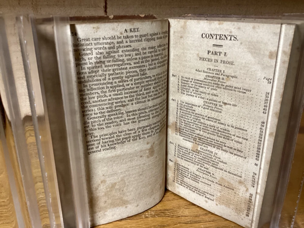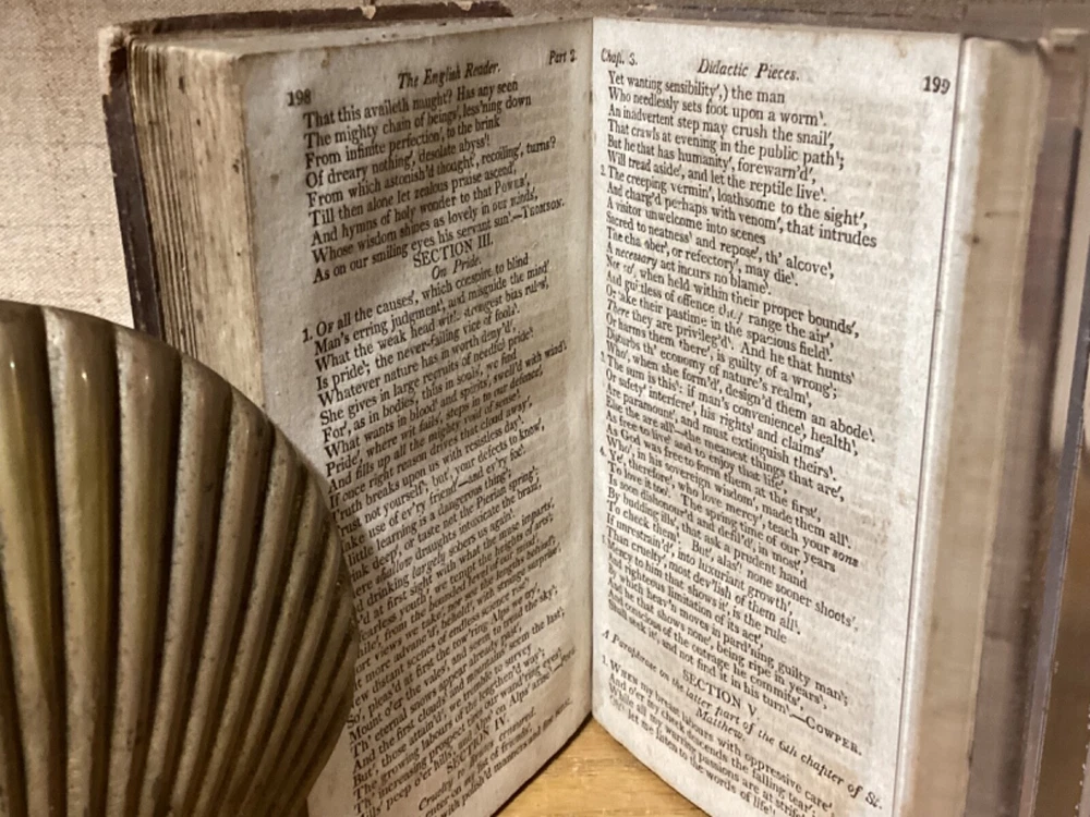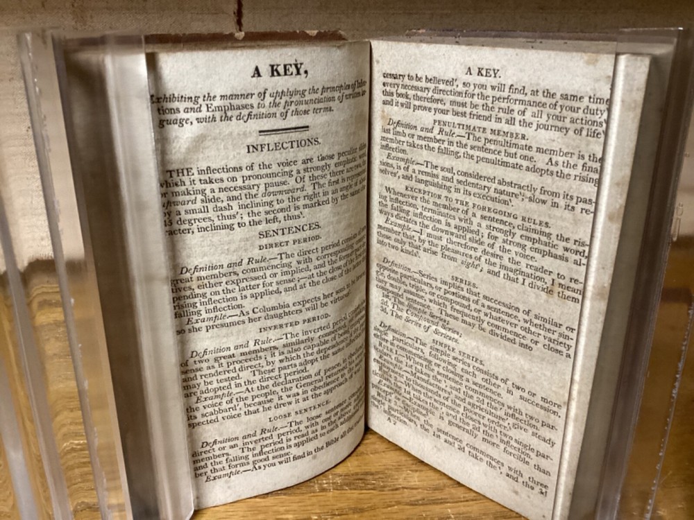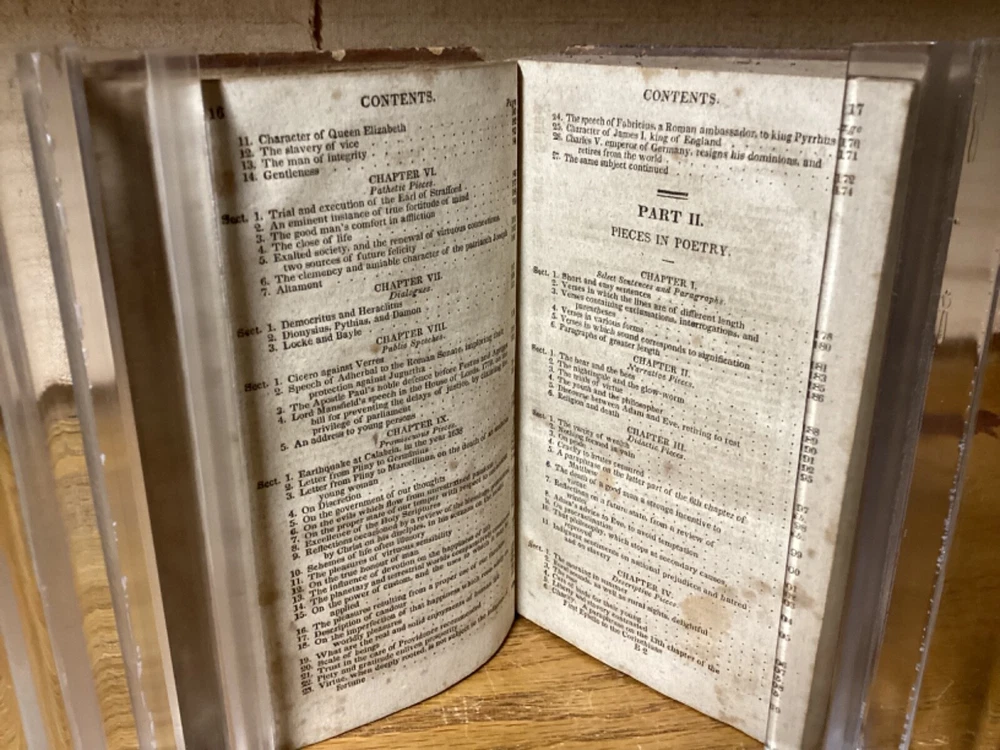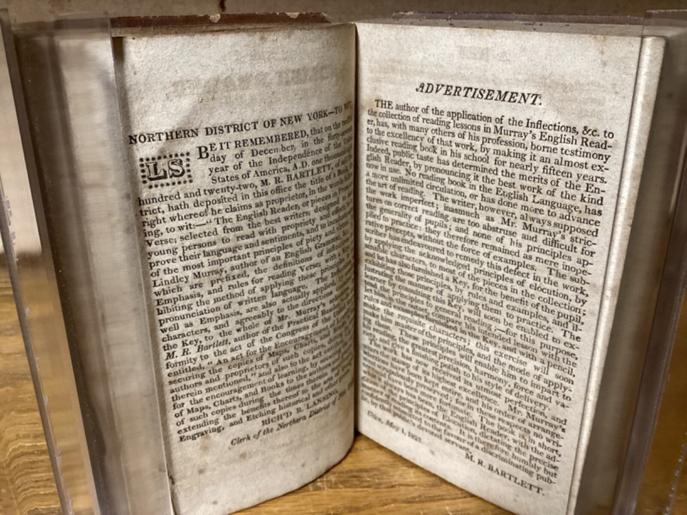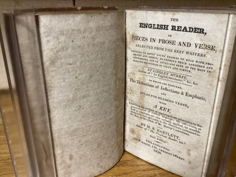 The English Reader, or Pieces in Prose and Verse, Selected from the Best Writers. By Lindley Murray and printed in Philadelphia by M.R. Bartlett. 1826, 252 pp. 5.75” x 3.75”. 12mo. Hardcover full leather. In fair condition, with rubbing and wear to exterior. Some loss to binding and title label on spine. Some cracking to front hinge. Text block remains bound well with minor wear. Light markings, including old-hand inscription from 1828 at front. General age-related toning to pages, along with periodic foxing and wear. Please see photographs and ask any questions prior to purchasing. A scarce Philadelphia imprint on popular English-language selections. FORN-SHELF-0463-BB-1024-aj2812