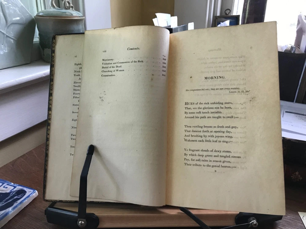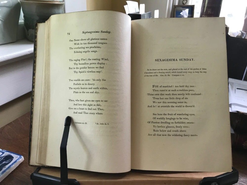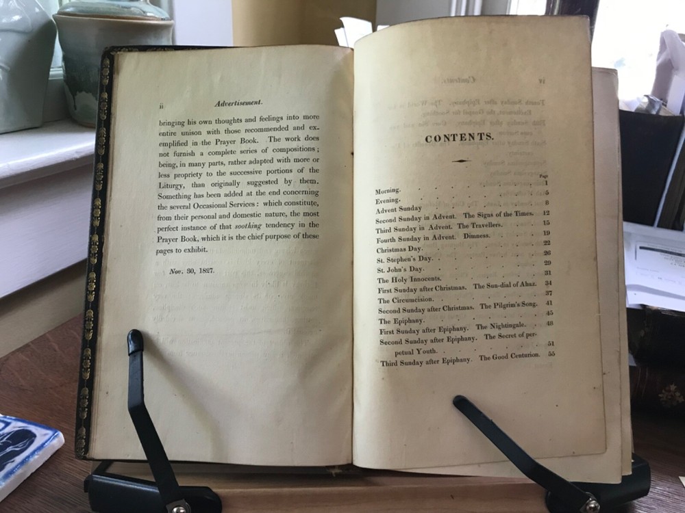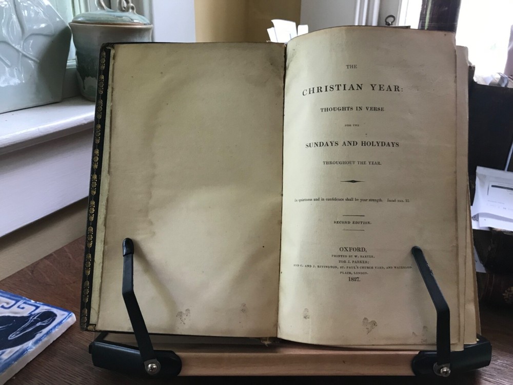 The Christian Year: Thoughts in Verse for the Sundays and Holidays Throughout the Year, Second Edition, Printed by W. Baxter, Oxford, 1827, 360 pp plus index, full gilt embellishment leather, 8.5 x 5.5”, 8vo. In as-is condition. Moderate wear to extremities with scuffed corners and cracking front joint. Top compartment of spine is splitting from joint. Gilt tooling remains bright. Dark staining to front board.. perhaps ink? Spine abraded with splitting of leather and tarnished gilt tooling. Hinges poorly repaired with cloth tape in front and rear. Applied with a thick, non-archival glue. Old hand ownership on front pastedown. Brittle edges on end papers, chipped and stained. Binding broken. Scattered foxing throughout. Numerous instances of underlining in pencil. Please see photos. COLR1827ADEN