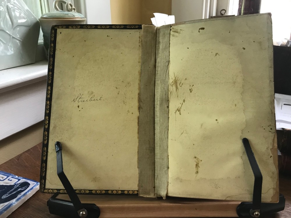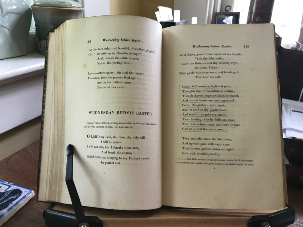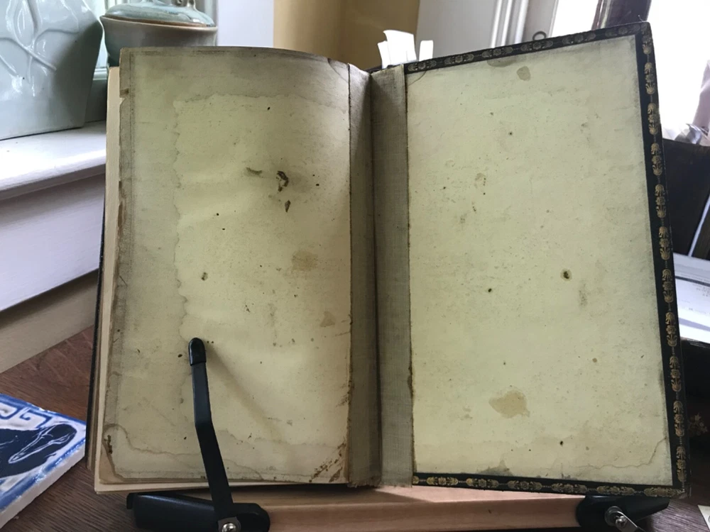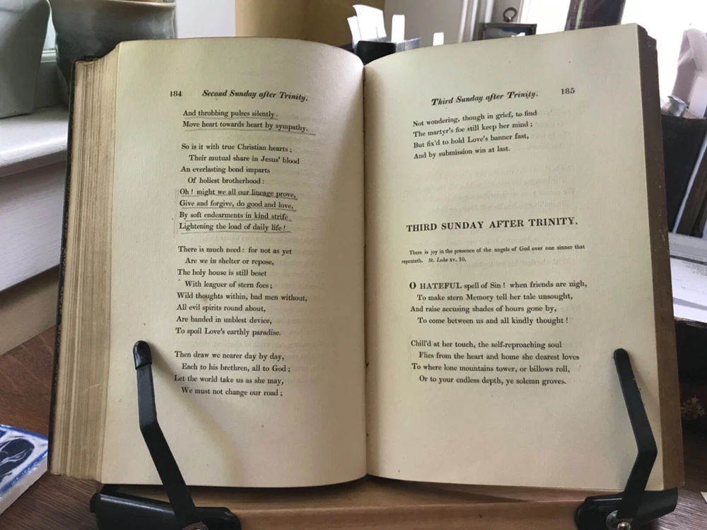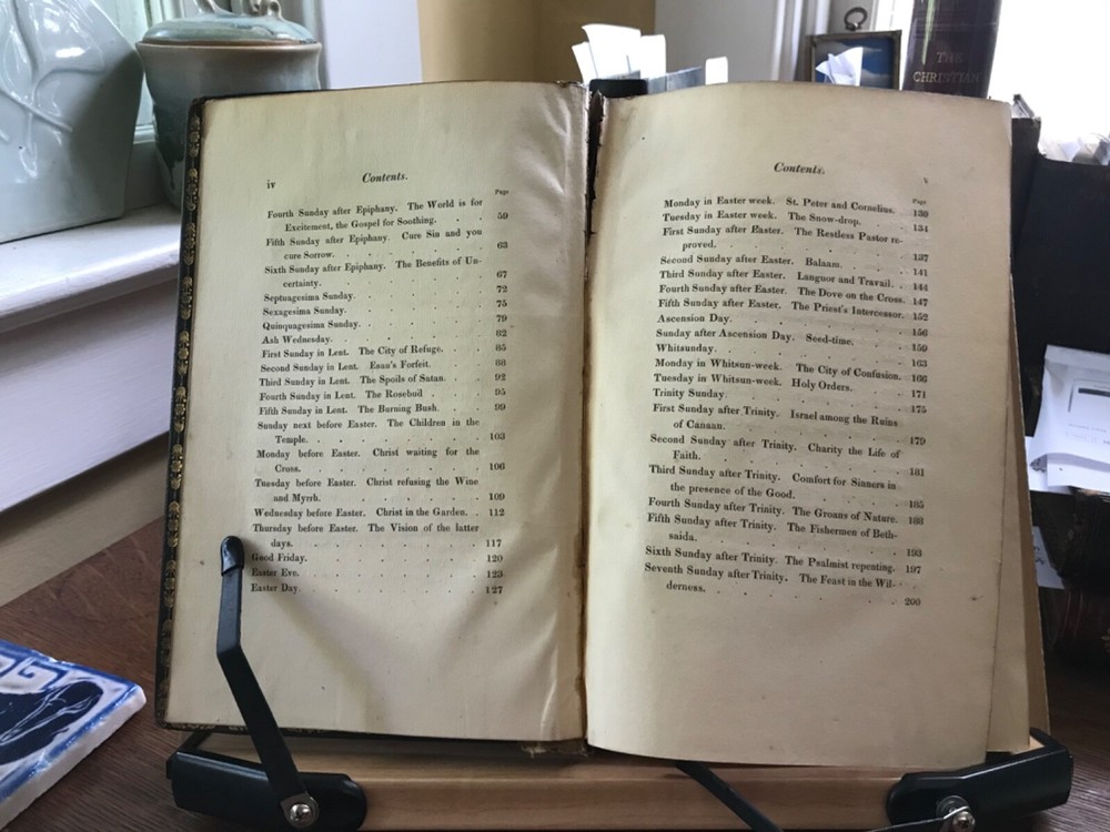 The Christian Year: Thoughts in Verse for the Sundays and Holidays Throughout the Year, Second Edition, Printed by W. Baxter, Oxford, 1827, 360 pp plus index, full gilt embellishment leather, 8.5 x 5.5”, 8vo. In as-is condition. Moderate wear to extremities with scuffed corners and cracking front joint. Top compartment of spine is splitting from joint. Gilt tooling remains bright. Dark staining to front board.. perhaps ink? Spine abraded with splitting of leather and tarnished gilt tooling. Hinges poorly repaired with cloth tape in front and rear. Applied with a thick, non-archival glue. Old hand ownership on front pastedown. Brittle edges on end papers, chipped and stained. Binding broken. Scattered foxing throughout. Numerous instances of underlining in pencil. Please see photos. COLR1827ADEN