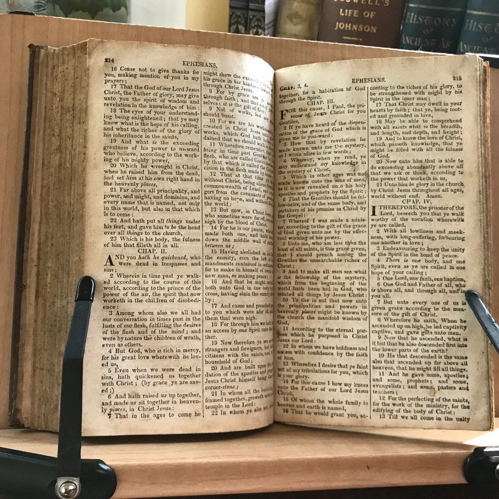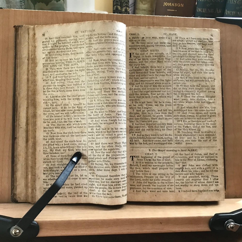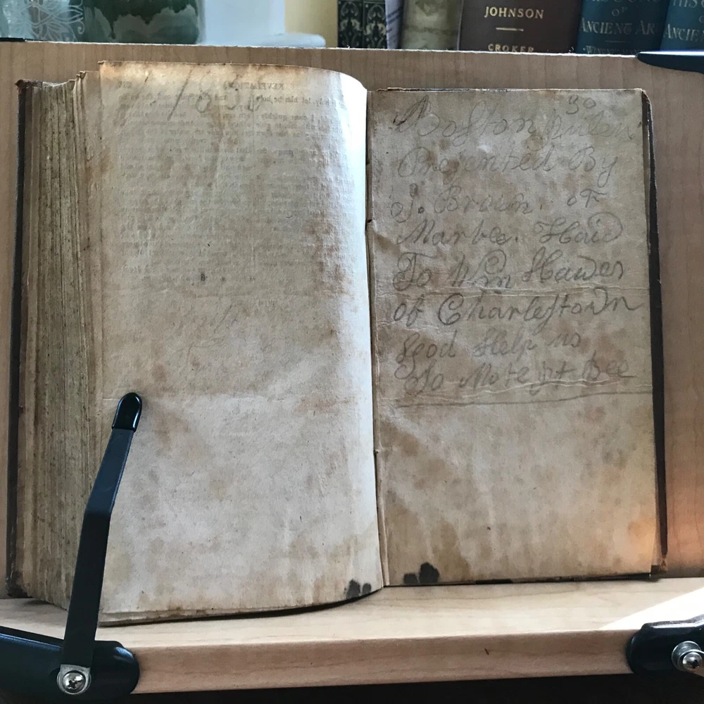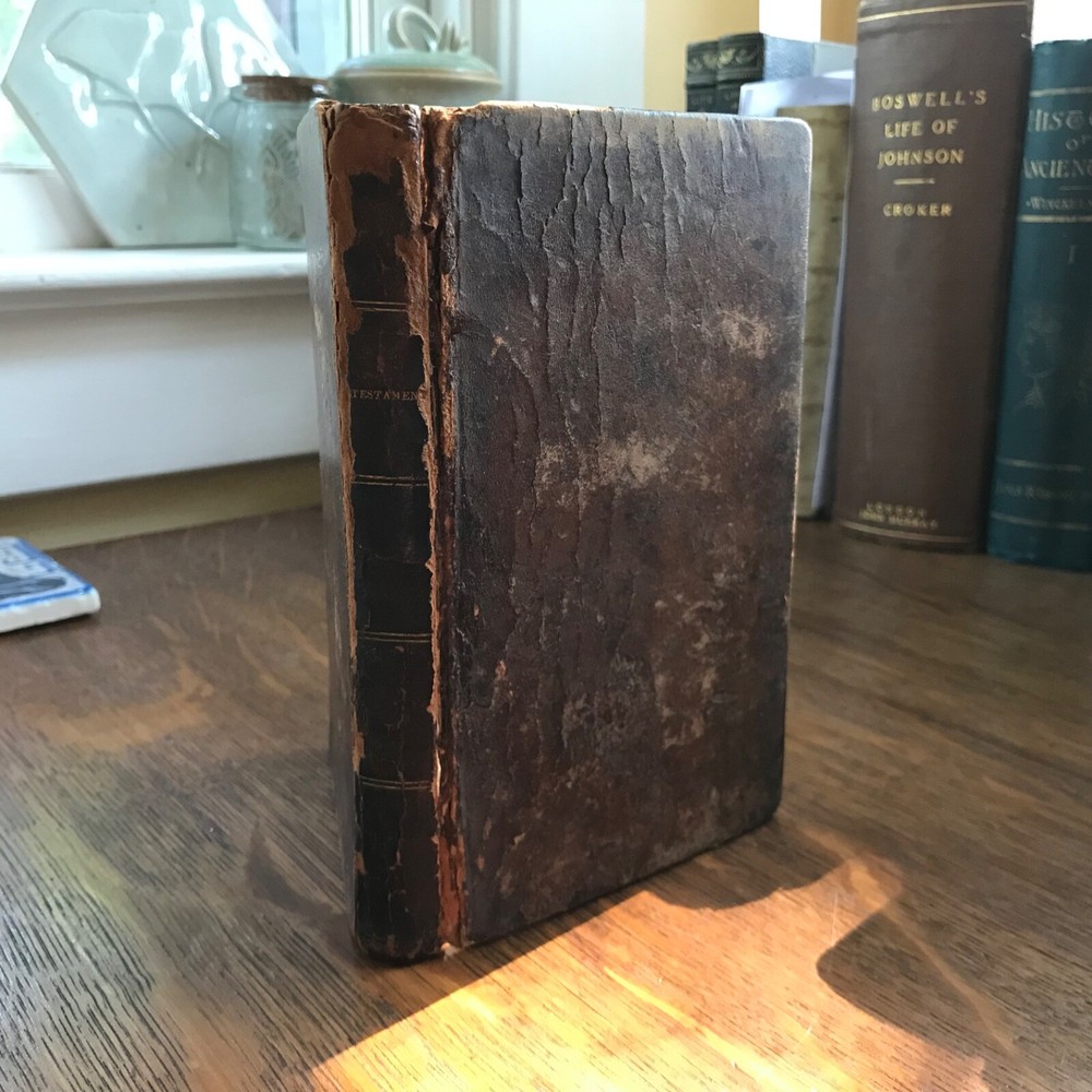 The New Testament Of Our Lord and Saviour Jesus Christ: Translated Out of The Original Greek; and with the Former Translations Diligently Compared and Revised, Stereotyped by T.H.& C. Carter, Boston, Published by John M. Putnam, Concord, N.H., 1827, 283 pp, leather, 7 x 4.5”, 12mo. In fair condition. Original leather worn and desiccated. Moderate wear to extremities with rubbing to end bands and corners. Front joint cracked. Spine abraded and worn. Double column text worn with soiling, foxing. Age-stained overall. Old hand manuscript presentation in rear by J. Brown, Marble Haid (Marblehead) to Wm. Hawes of Charlestown, 1836 “God Help Us”. Some ink staining in rear. Binding intact. Please see photos. An early American New Testament. COLR1827ABDN