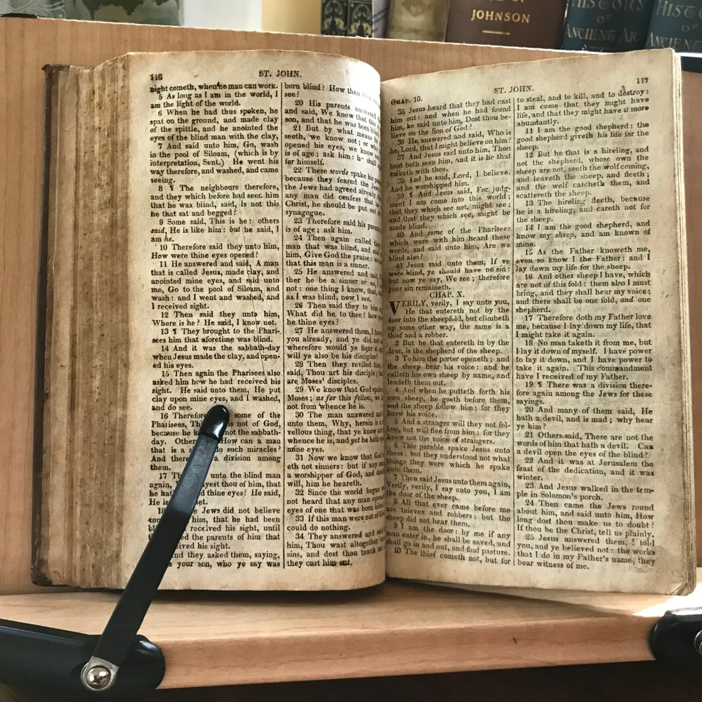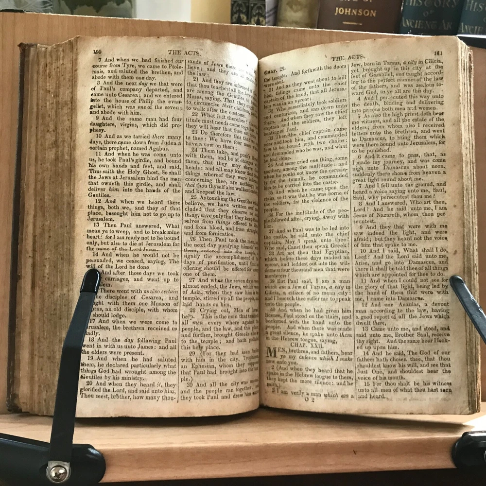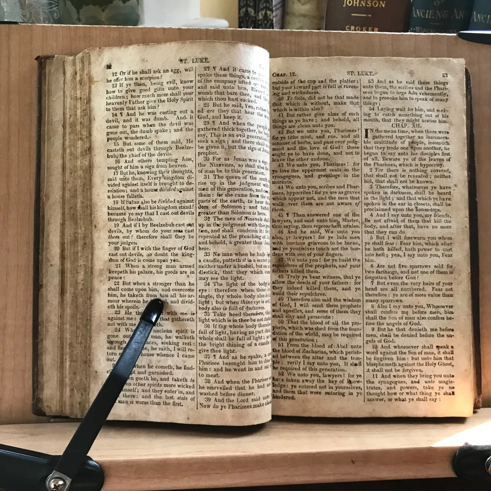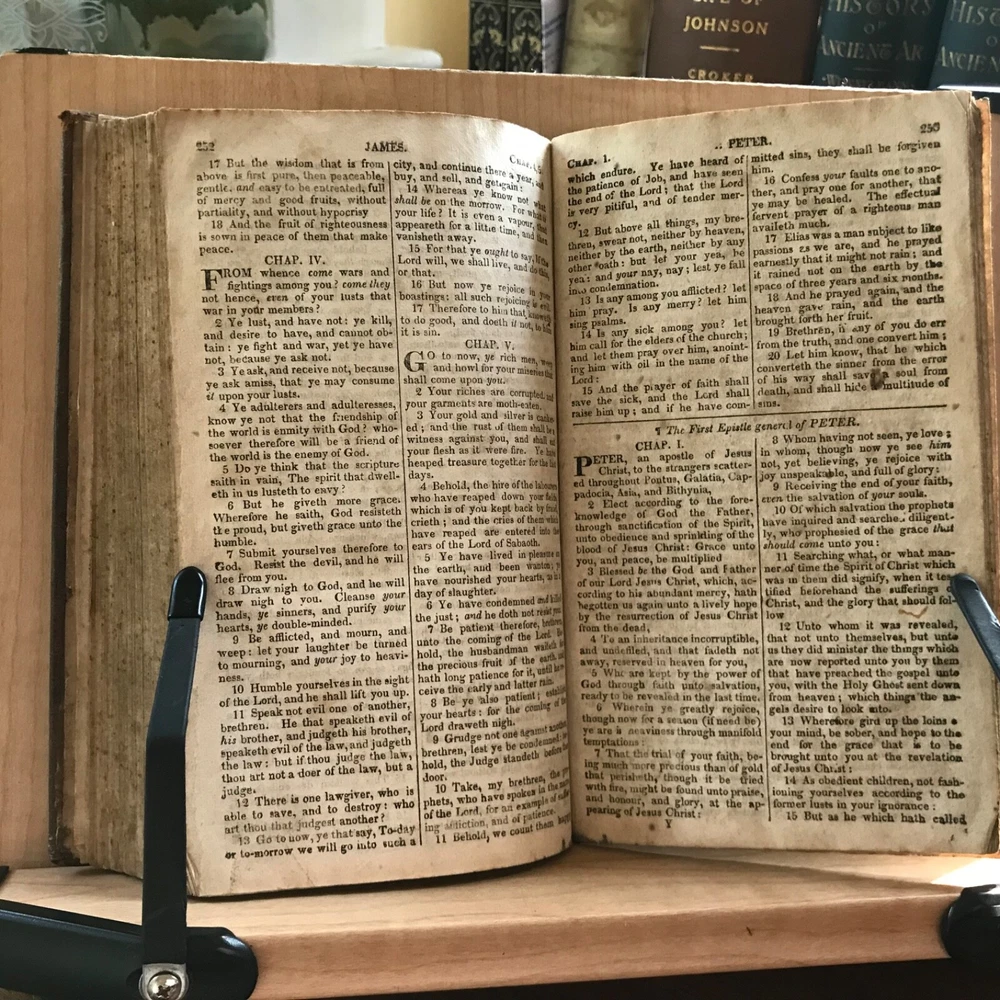 The New Testament Of Our Lord and Saviour Jesus Christ: Translated Out of The Original Greek; and with the Former Translations Diligently Compared and Revised, Stereotyped by T.H.& C. Carter, Boston, Published by John M. Putnam, Concord, N.H., 1827, 283 pp, leather, 7 x 4.5”, 12mo. In fair condition. Original leather worn and desiccated. Moderate wear to extremities with rubbing to end bands and corners. Front joint cracked. Spine abraded and worn. Double column text worn with soiling, foxing. Age-stained overall. Old hand manuscript presentation in rear by J. Brown, Marble Haid (Marblehead) to Wm. Hawes of Charlestown, 1836 “God Help Us”. Some ink staining in rear. Binding intact. Please see photos. An early American New Testament. COLR1827ABDN