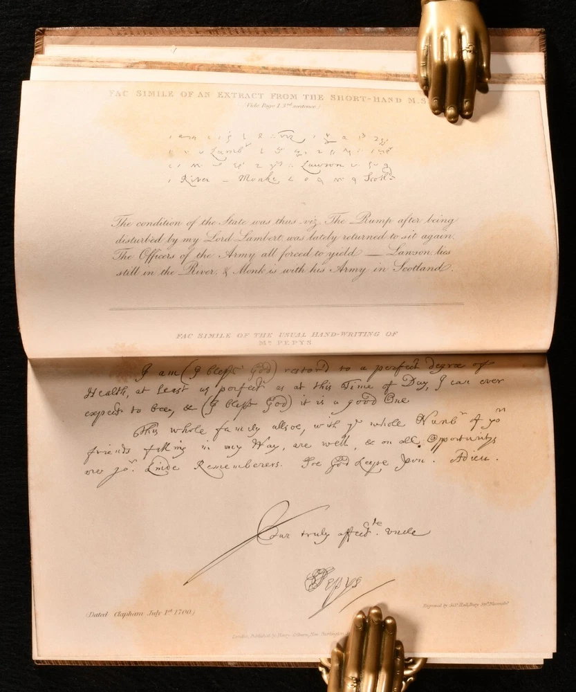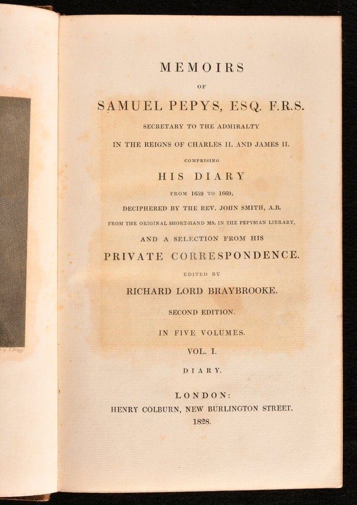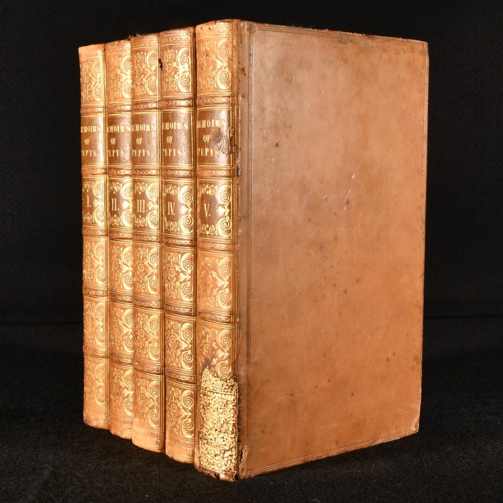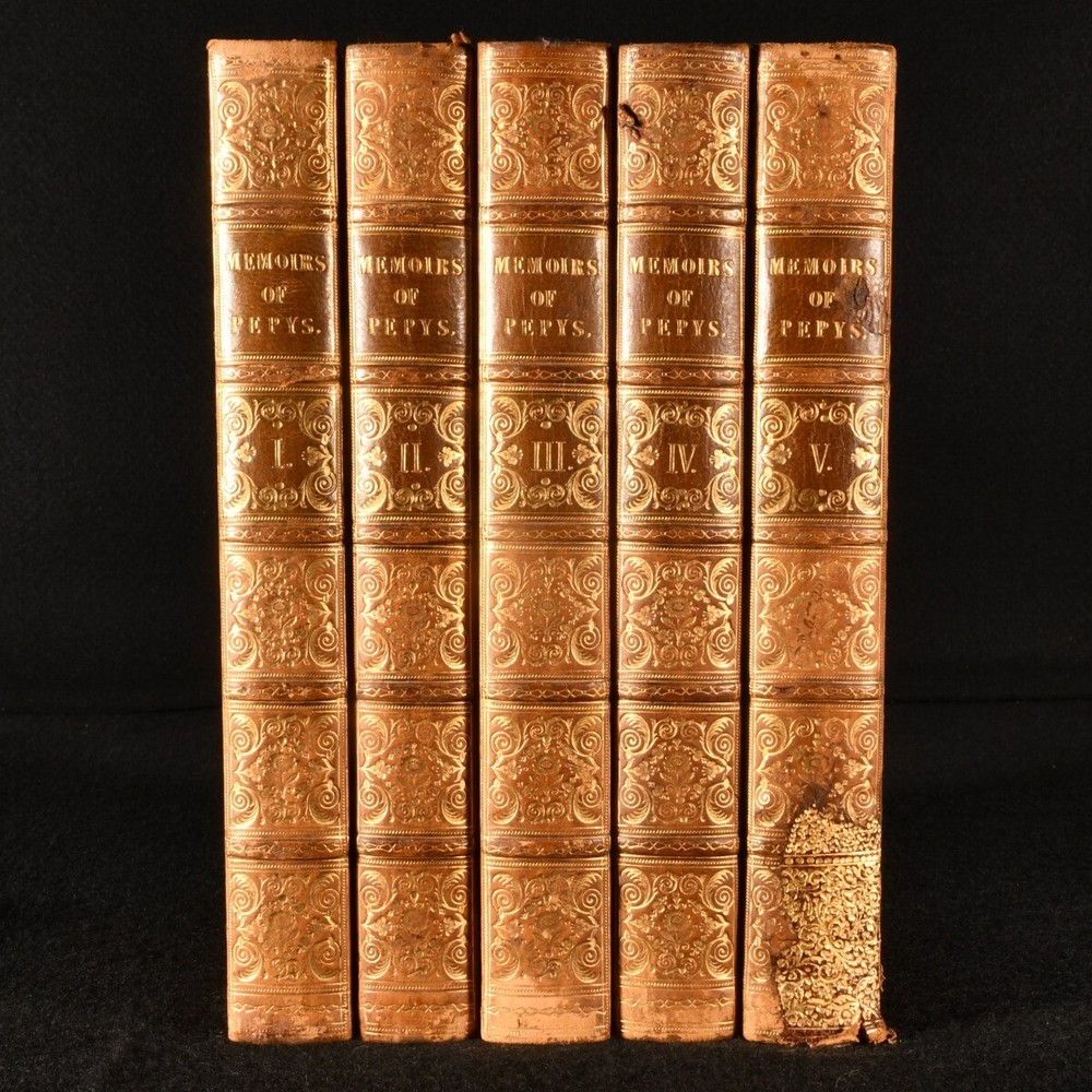 Click here to see our other books! Memoirs of Samuel Pepys, Esq. Samuel Pepys; Richard Lord Braybrooke 1828 Henry Colburn : London 9" by 6" lx, 376; 451; 446; 461; 485pp SUMMARY A charming five volume set of the second edition of Pepy's renowned memoirs, published for the first time, detailing life in the 1660s. An Important Work,Early Edition,Illustrated,Leather Binding Overall Condition: Very Good This book weighs 4 KG when packed UK Postage: £ 4.49 US Postage: £ 39.99 EU Postage : £ 26.99 European Postage: £ 36.99 Asia Postage: £ 65.99 Worldwide Postage: £ 99.99 DESCRIPTION This is a second edition of the first publication of Pepy's diary. Painstakingly written out in standard English by John Smith, it was edited by Lord Braybrooke and published in two volumes in 1825. Unfortunately for Smith, he laboured with his transcription, oblivious to the fact that Pepys had a key to his shorthand system stored on a shelf just above where the diaries were stored; he only discovered this when he had nearly finished the work. Samuel Pepys (1633-1703) was an English politician, bibliophile and author. He kept a diary for ten years between 1660 and 1669 which chronicles life during the English Restoration, and as well as Pepys' personal and day-to-day life, it documents important events such as the Great Plague of London, the Great Fire of London and the Second Dutch War. It was first published in the nineteenth century. A second edition of this work. Volume I is illustrated with four plates, including a frontispiece portrait of the author. Volume II contains two plates, volume III two, volume IV one and volume V two, including one folding plate. Collated, complete. An early edition of an important British memoir, providing a first-hand account of life in the seventeenth century. CONDITION In a full calf binding. Externally generally smart; some slight rubbing to the heads and tails of the spines, with a large amount of loss to the tail of volume V having been re-gilt. Extremities are a touch bumped. Internally, firmly bound. Pages are bright and clean, bar a little offsetting to the title pages and the odd spot. Overall Condition: Very Good GLOSSARY OF TERMS Overall Condition (Dustwrapper condition rating is shown after that for the book itself, where a dustwrapper is present) Fine - Very well preserved copy showing very little wear Very Good Indeed - Only one or two minor faults, really a very attractive copy Very Good - Quite a wide term meaning no major faults but probably several smaller ones often expected given the age of the book, but still a respectable copy Good - Meaning not very good. Some more serious faults as will be described in the condition report under 'condition' Good Only - Meaning one or more faults that could really do with repair Fair - As with good only above but with other faults leaving a compromised copy even after repair Poor - Really bad and possibly seriously incomplete. We only sell books in this condition where their rarity or value makes them attractive none the less. Major defects will be described. GUARANTEE We offer a full money back guarantee on our descriptions. Please ask for details and conditions. We prefer PAYPAL. If you pay via PAYPAL we will post the item off the same or the next working day with the postage you have selected. Please note we cannot accept USD cheques