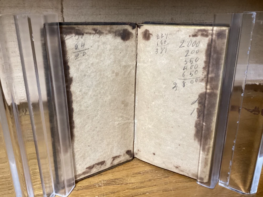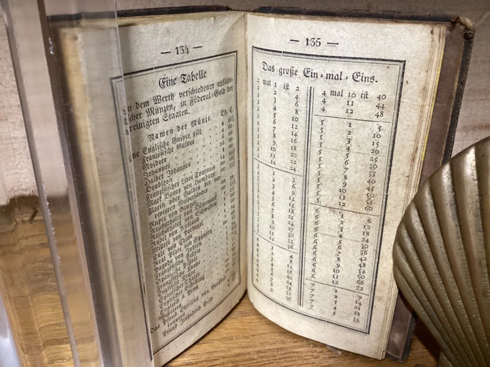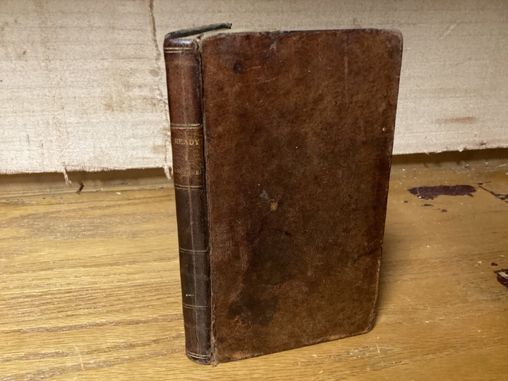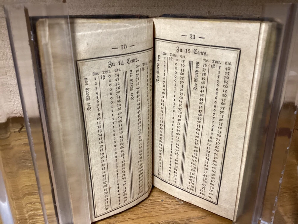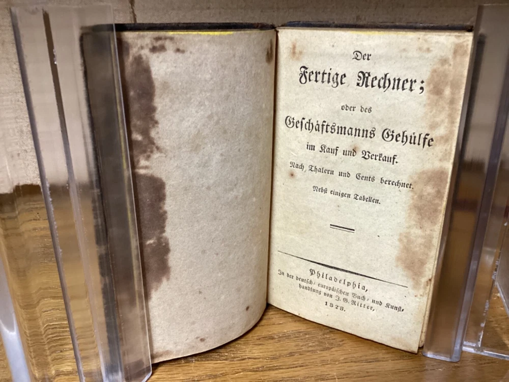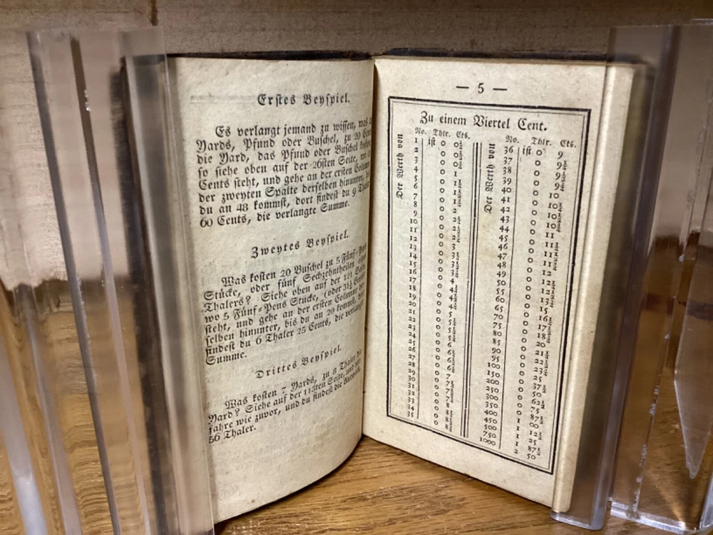 Der Fertige Rechner; oder des Geschäftsmanns Gehülfe im Kauf und Verkauf. Nach Thalern und Cents berechnet. Nebst einigen Tabellen. Printed in Philadelphia by J.G. Ritter. 1828, 144 pp, 5.5” x 3.5”, 12mo, full leather hardcover. In good condition, with minor superficial rubbing and wear to exterior, primarily along edges and corners. Light vertical cracking to leather down spine. Minor wear and cracking to hinges at front and rear. Text block remains bound well, with small markings and inscriptions at front. General age-related toning to pages (disproportionate along edges of boards), along with periodic foxing and wear. Please see photographs and ask any questions prior to purchasing. A scarce reference manual and calculator for buying and selling goods in both Thalers and Cents. Designed for Pennsylvania’s large German-speaking population in the early 19th Century. A later edition, with at least one prior edition published in 1817. COLU1828BCDX-0624-aj1886