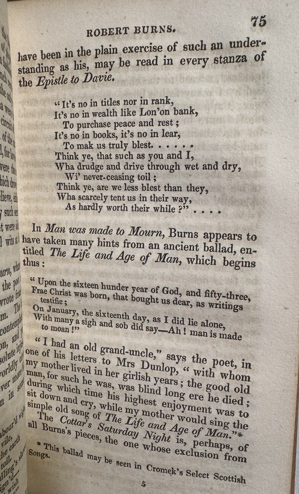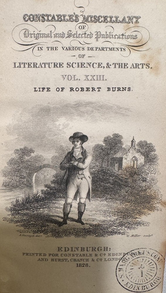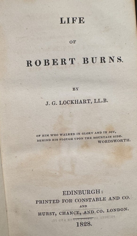Life of Robert Burns by J. G. Lockhart Biography of the famous Scottish Poet best known for Auld Lang Syne. OVERALL CONDITION: GOOD+ to VG Published by Constable and Co. in 1828 in Edinburgh as part of its “Constable’s Miscellany” series which featured original and selected publications from science, literature, and the arts. The volumes were published over the course of six years. This is volume 23 out of 80 and is the first edition and first printing of this biography. In contemporary 1/2 leather over mottled paper. Two gilt-lettered spine labels. Blind-stamped bordering. All edges speckled. Vignette title page. Octavo, 5.75” x 3.75”, vii; 310 pp. Provenance: Bishop Jacob of Limyren in Scotland and St. Margaret Convent in Edinburgh, Scotland. ABOUT THE AUTHOR John Gibson Lockhart (12 June 1794 – 25 November 1854) was a Scottish writer and editor. He is best known as the author of the seminal, and much-admired, seven-volume biography of his father-in-law Sir Walter Scott: Memoirs of the Life of Sir Walter Scott, Bart. Robert Burns (January 1759 – July 1796), also known familiarly as Rabbie Burns, was a Scottish poet and lyricist. He is widely regarded as the national poet of Scotland and is celebrated worldwide. He is the best known of the poets who have written in the Scots language, although much of his writing is in a "light Scots dialect" of English, accessible to an audience beyond Scotland. He also wrote in standard English, and in these writings his political or civil commentary is often at its bluntest. The book is in GOOD+ to VERY GOOD condition for being in boards nearly 200-years-old. Rubbing and cracking of the joints. Rubbed extremities and spine. Chipping of spine labels. Square spine with firm hinges. Foxing to endpapers and first few and last few pages of book. The occasional spot of foxing or smudge but most of the text is quite clean and bright. Offsetting from vignette title page. Former owner bookplate on front pastedown and stamp of St. Margaret Convent on vignette title page. As a fellow book collector, I know how frustrating it can be when items aren’t accurately described or poorly packaged for shipping. That is why I (1) take a lot of pictures and try to describe condition issues as accurately as possible and (2) pack your book purchases with the utmost care before shipping. I have been selling and buying on eBay for over 10 years and have a 100% satisfaction rating, and offer a 100% satisfaction guarantee 30-day return policy. Please follow me as I have thousands of highly collectible books to list in the coming weeks and months!