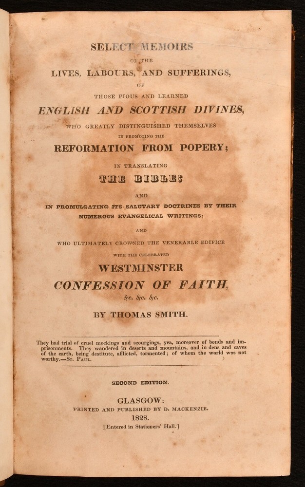 Click here to see our other books! Select Memoirs of the Lives, Labours, and Sufferings, of Those Pious and Learned English and Scottish Divines, Who Greatly Distinguished themselves from Promoting the Reformation from Popery' in Translating the Bible and in Promulgating its Salutary Doctrines by their Numerous Evangelical Writings; and Who Ultimately Crowned the Venerable Edifice with the Celebrated Westminster Confession of Faith &c. &c. &c. Thomas Smith 1828 D. Mackenzie : Glasgow 8.5" by 5.5" lxxx, 724pp. SUMMARY A very scarce second edition of this collection of memoirs of English and Scottish divines. Early Edition,Leather Binding,Very Scarce Overall Condition: Very Good This book weighs 1 KG when packed UK Postage: £ 3.99 US Postage: £ 22.99 EU Postage : £ 16.99 European Postage: £ 17.99 Asia Postage: £ 22.99 Worldwide Postage: £ 28.99 DESCRIPTION Second edition. Very scarce work. With a portrait frontispiece. A retrospective view of the Church prior to the Reformation, contemplating the inhuman cruelties exercised on the few faithful and conscientious Christians who rejected the idolatrous worship of Rome. Containing numerous memoirs on important and learned English and Scottish divines from this period. Written by Thomas Smith, an English scholar and priest. CONDITION In the original half calf with marbled boards. Externally, smart with light rubbing and minor bumping to the extremities. Fading to the spine with the odd mark to the boards. Internally, firmly bound. Pages are bright with scattered spotting and age toning, predominantly to the first and last few pages. Overall Condition: Very Good GLOSSARY OF TERMS Overall Condition (Dustwrapper condition rating is shown after that for the book itself, where a dustwrapper is present) Fine - Very well preserved copy showing very little wear Very Good Indeed - Only one or two minor faults, really a very attractive copy Very Good - Quite a wide term meaning no major faults but probably several smaller ones often expected given the age of the book, but still a respectable copy Good - Meaning not very good. Some more serious faults as will be described in the condition report under 'condition' Good Only - Meaning one or more faults that could really do with repair Fair - As with good only above but with other faults leaving a compromised copy even after repair Poor - Really bad and possibly seriously incomplete. We only sell books in this condition where their rarity or value makes them attractive none the less. Major defects will be described. GUARANTEE We offer a full money back guarantee on our descriptions. Please ask for details and conditions. We prefer PAYPAL. If you pay via PAYPAL we will post the item off the same or the next working day with the postage you have selected. Please note we cannot accept USD cheques