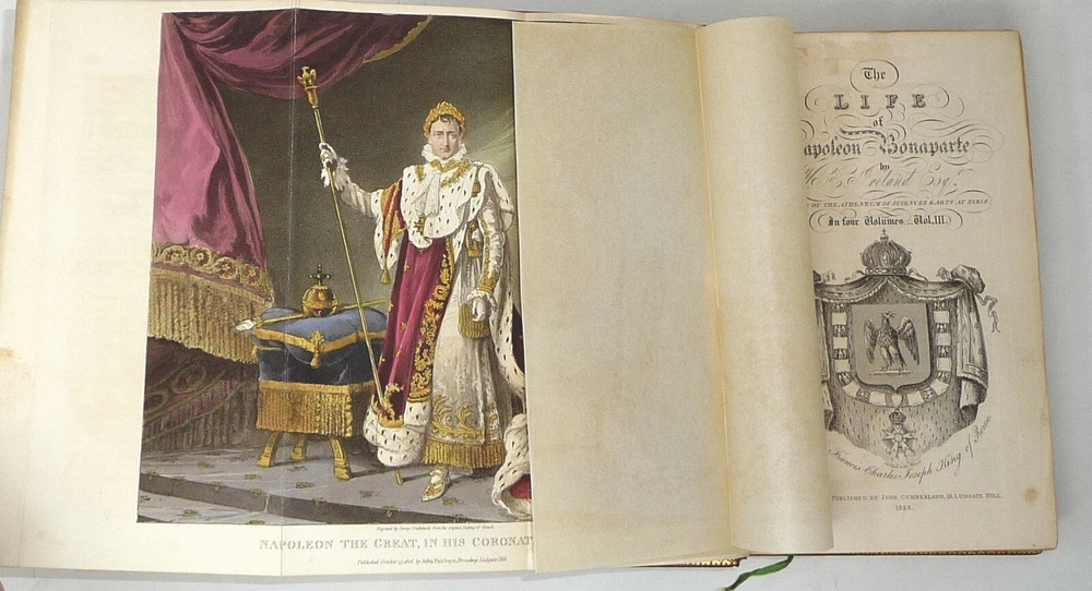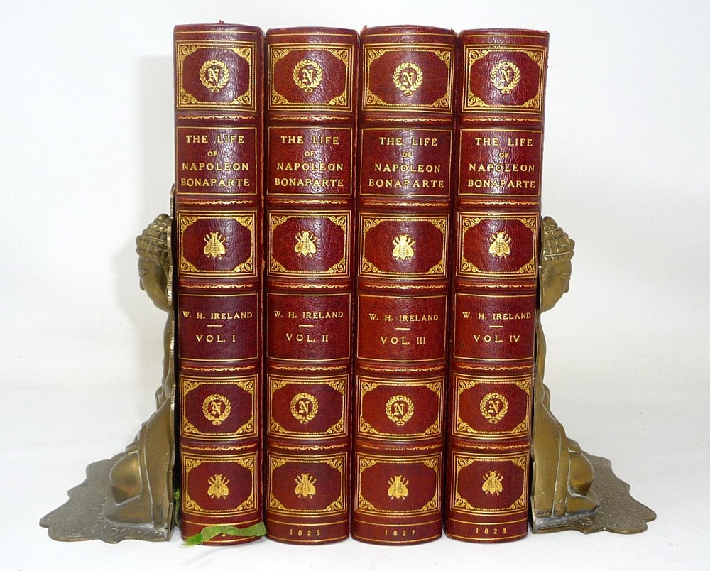 The French Revolution, by W. H. Ireland, 1828 The Life of Napoleon. Ireland, W. H. London: John Cumberland, 1828. Four volume set, complete. First edition set. Full maroon Morocco leather, with gilt vignette illustrations on each corner of the front and back covers and gilt rules. Gilt titles and elaborate gilt designs in six compartments on the spine, five raised bands -- plus the date each individual volume was published in gilt at the bottom (1823, 1825, 1827 and 1828). Pages gilt tipped on the three edges. Gilt detailing on the front and back inside covers, brown endpapers. The volumes are lavishly illustrated, with 27 total folding plates, most by George Cruikshank. Twenty-three are hand colored. The frontispiece folding plates have tissue guards. Title pages have Napoleon's crest. Handsome foldout portraits of Napoleon and Josephine -- all the illustrations are gorgeous. The volumes are in very good condition -- Three volumes have the original green ribbon bookmark. Volume 1 is fragile at the hinge, slightly cracked. All the gilt is still bright, no ownership inscriptions or bookplates and otherwise in especially nice condition. Spectacular set.