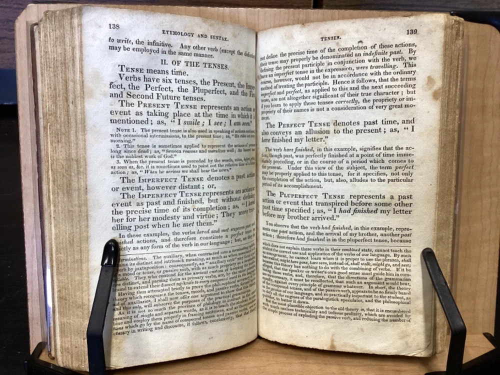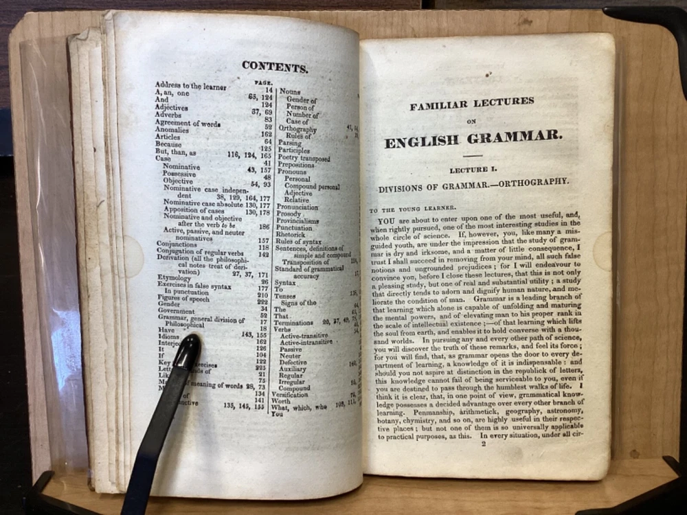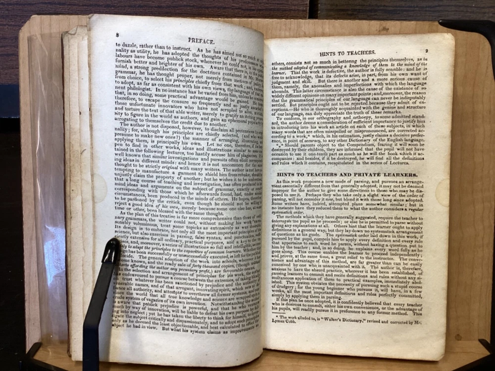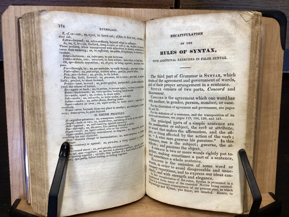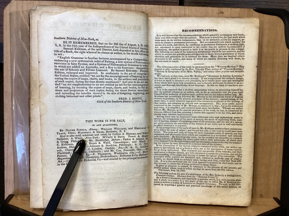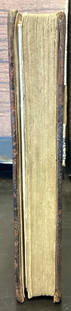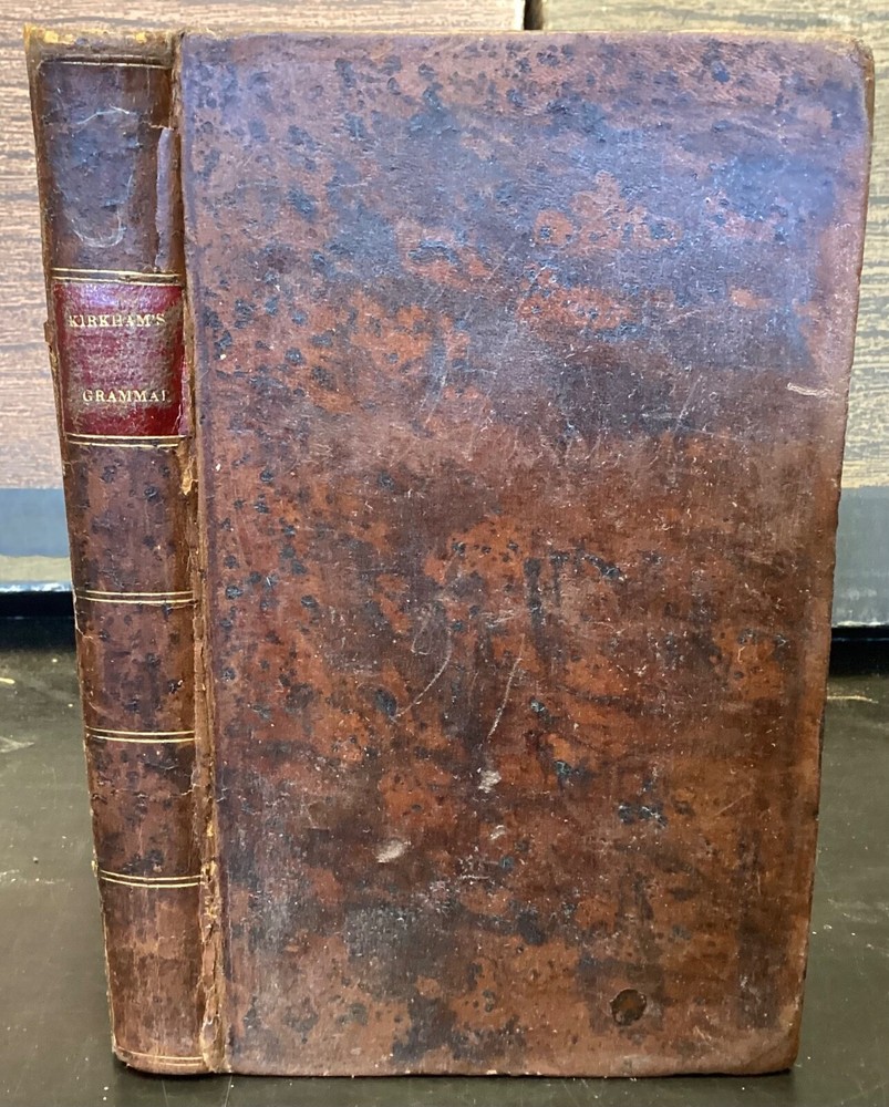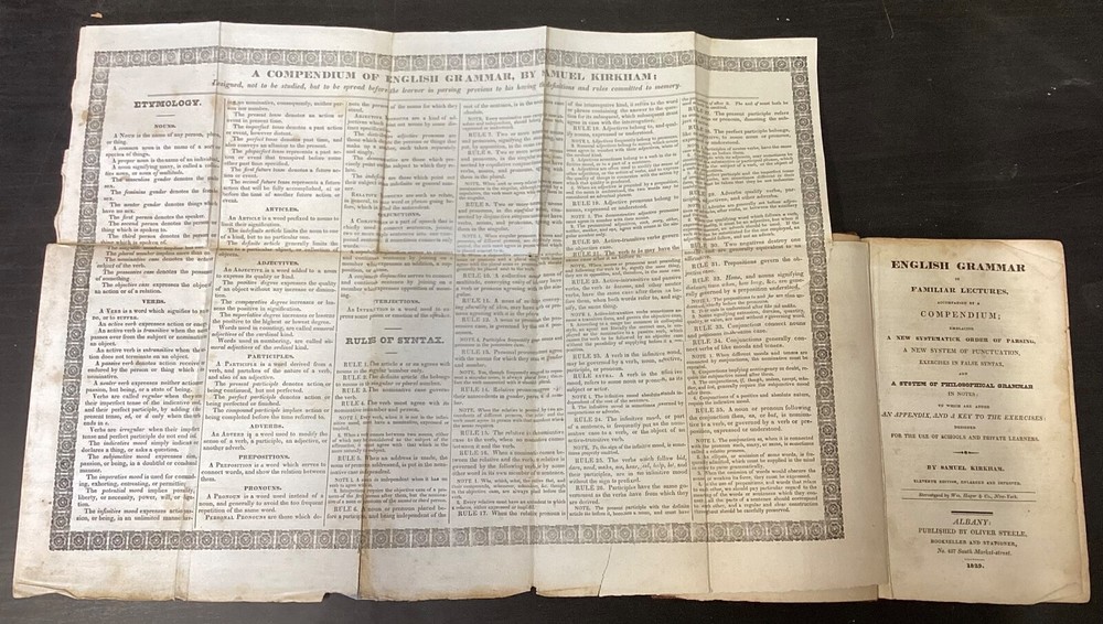 English Grammar in Familiar Lectures, Accompanied by a Compendium; Embracing A New Systematick Order of Parsing, A New System of Punctuation, Exercises in False Syntax, and A System of Philosophical Grammar in Notes: To Which Are Added An Appendix and a Key to the Exercises: Designed for the Use of Schools and Private Learners, by Samuel Kirkham, Oliver Steele, Albany, 1829, 228pp, leather, 4.5 x 7.5", 16mo Fair condition. Loose plastic sleeve over boards. Wear to front and rear boards. Tips are bumped. Spine shows some wear and cracking, but is still legible. Joints and hinges all show some level of cracking. Large fold-out table opposite title page. Toning, age-staining, and tea-staining throughout textblock. Bottom corner of 221/222 is torn; some text missing. Binding intact. Please see photos. Samuel Kirkham was an American educator and grammarian who lived in the 19th century. He authored several books on English grammar and language education, with English Grammar in Familiar Lectures being one of his most renowned works. The edition in this listing includes a large fold-out chart that could have been used for display in a classroom. FORN-MSB-0224-TUB0005-JC115