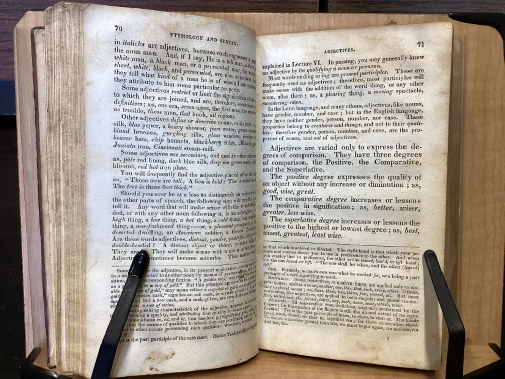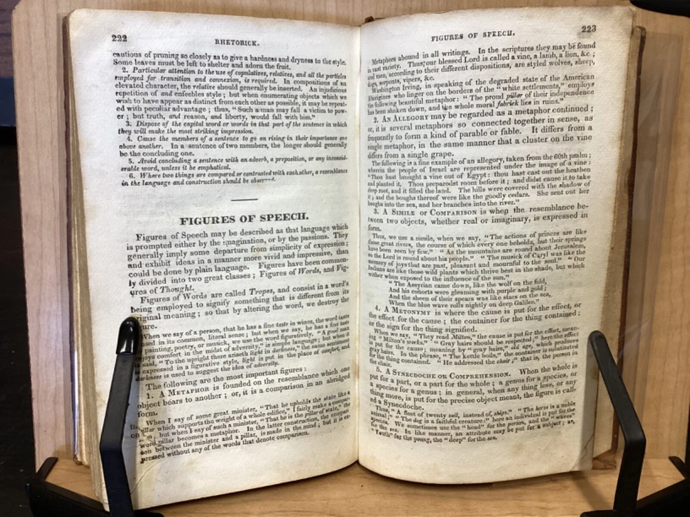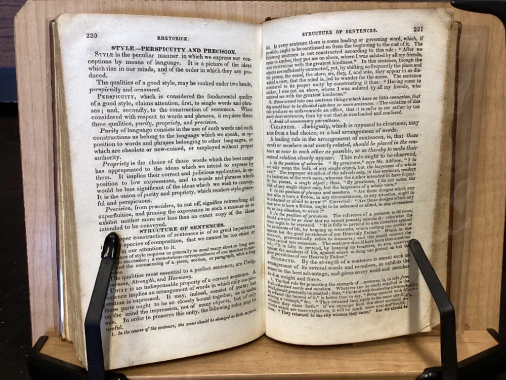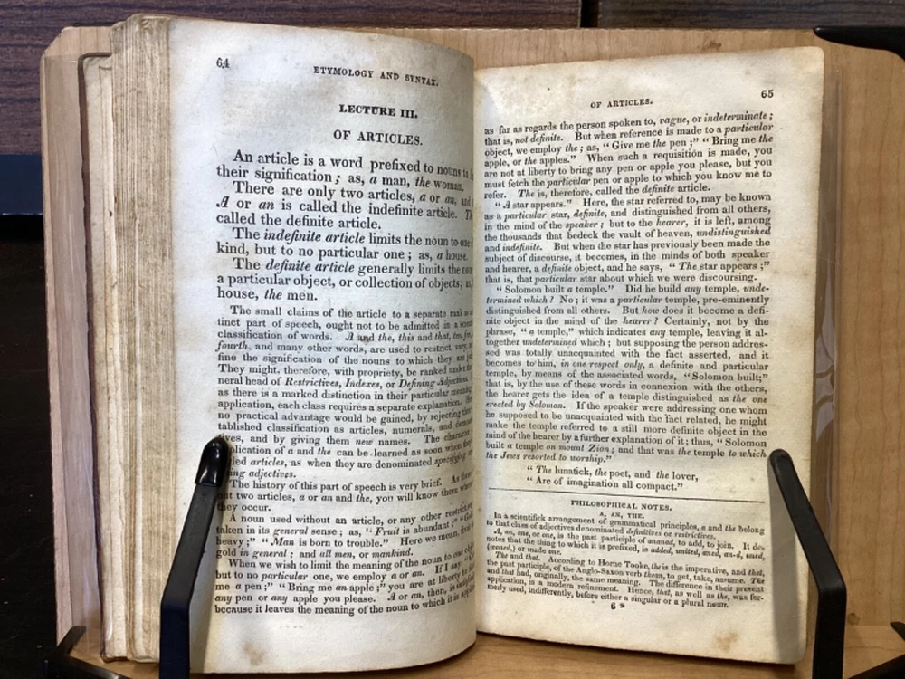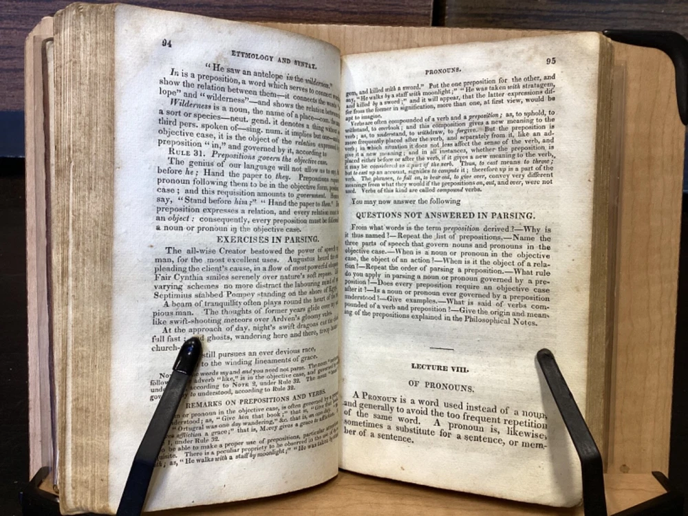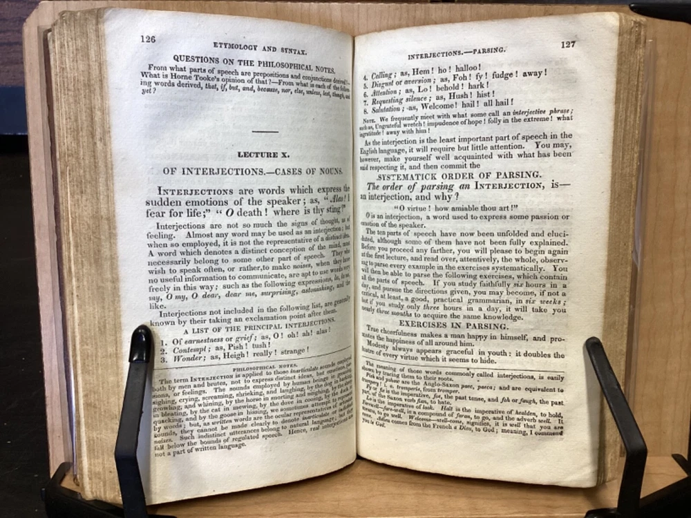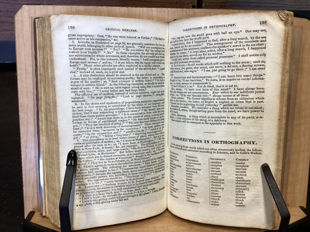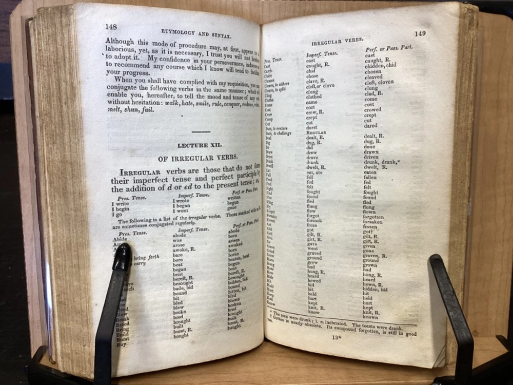 English Grammar in Familiar Lectures, Accompanied by a Compendium; Embracing A New Systematick Order of Parsing, A New System of Punctuation, Exercises in False Syntax, and A System of Philosophical Grammar in Notes: To Which Are Added An Appendix and a Key to the Exercises: Designed for the Use of Schools and Private Learners, by Samuel Kirkham, Oliver Steele, Albany, 1829, 228pp, leather, 4.5 x 7.5", 16mo Fair condition. Loose plastic sleeve over boards. Wear to front and rear boards. Tips are bumped. Spine shows some wear and cracking, but is still legible. Joints and hinges all show some level of cracking. Large fold-out table opposite title page. Toning, age-staining, and tea-staining throughout textblock. Bottom corner of 221/222 is torn; some text missing. Binding intact. Please see photos. Samuel Kirkham was an American educator and grammarian who lived in the 19th century. He authored several books on English grammar and language education, with English Grammar in Familiar Lectures being one of his most renowned works. The edition in this listing includes a large fold-out chart that could have been used for display in a classroom. FORN-MSB-0224-TUB0005-JC115