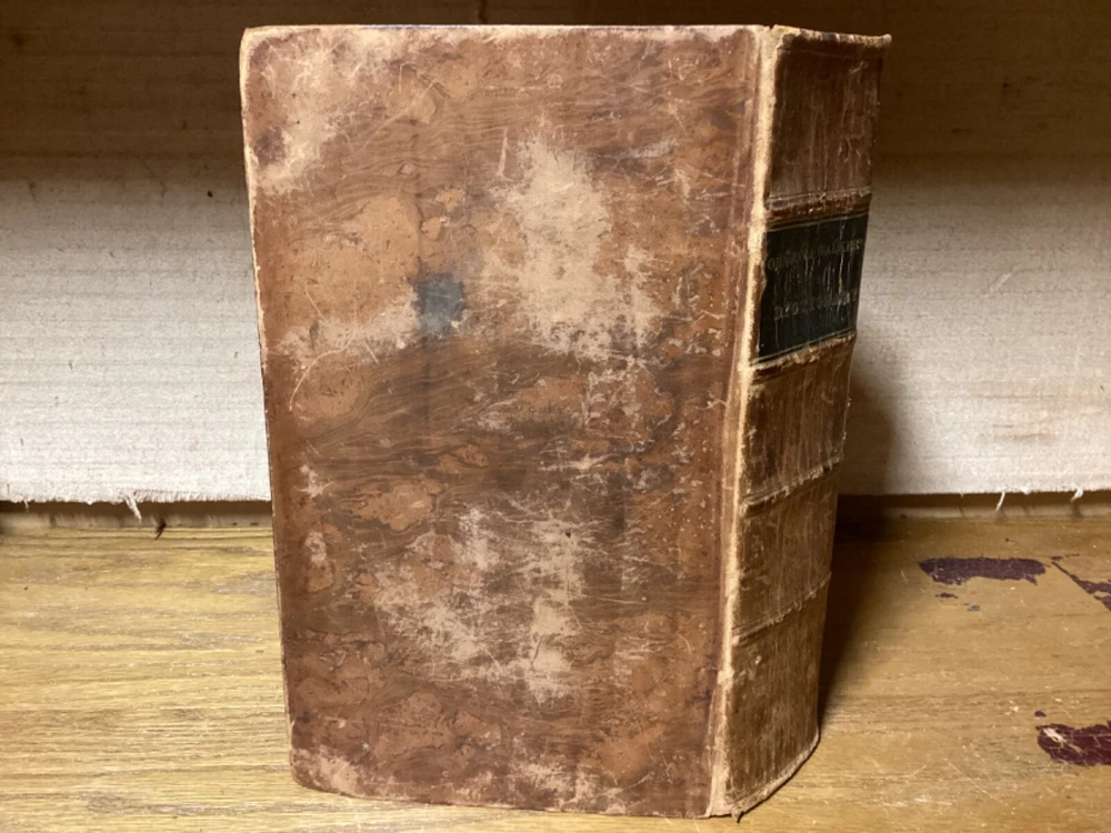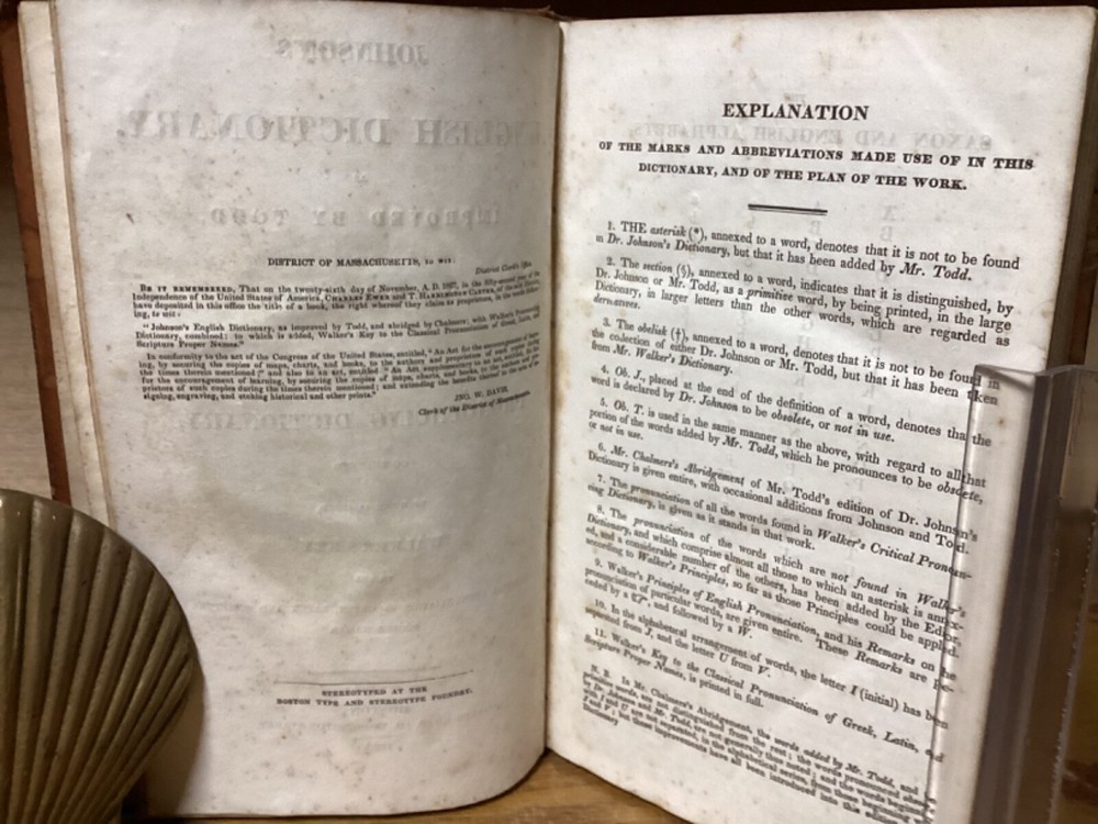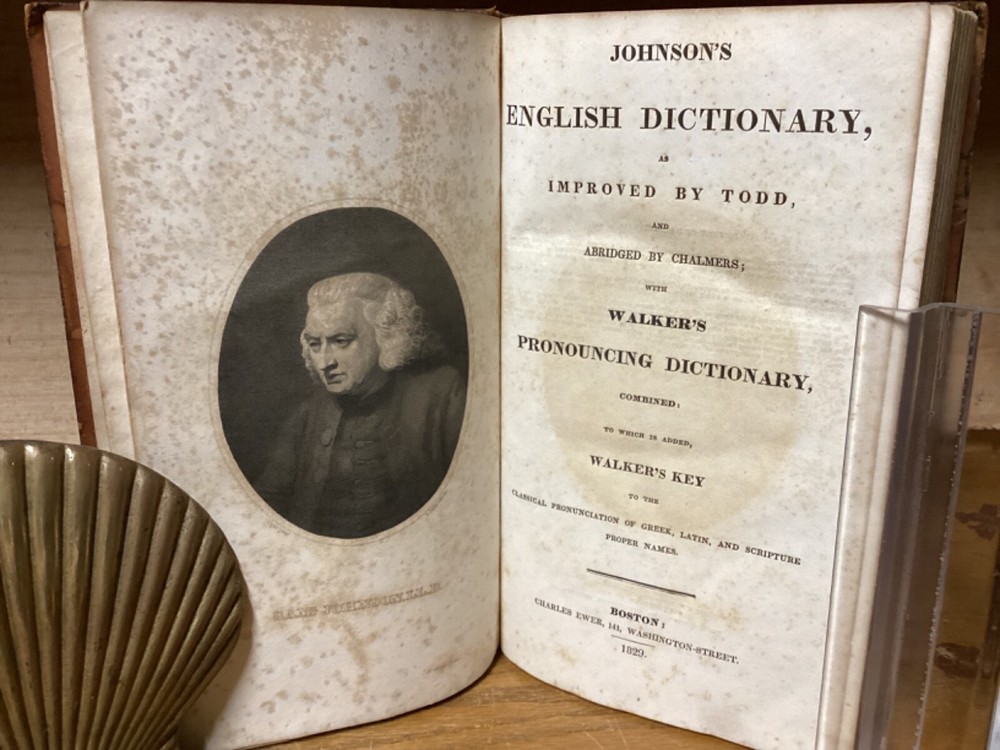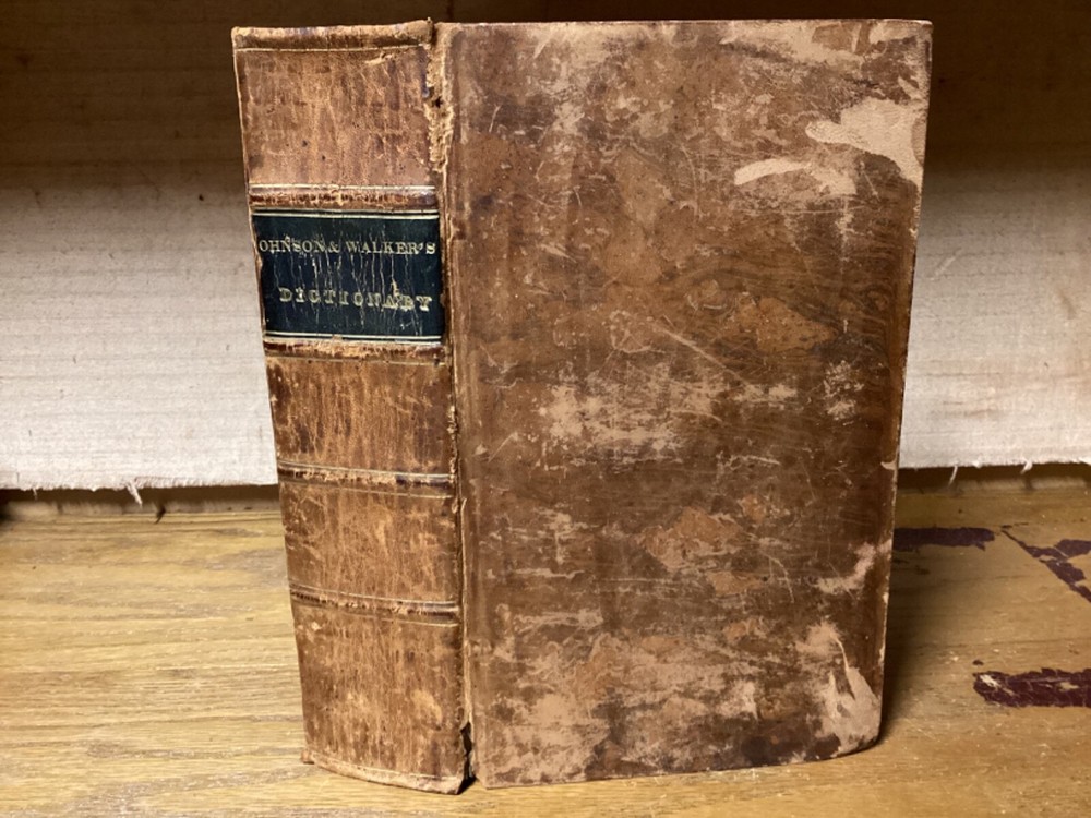 Johnson’s English Dictionary, as Improved by Todd, and Abridged by Chalmers; with Walker’s Pronouncing Dictionary, Combined: to Which is Added, Walker’s Key to the Classical Pronunciation of Greek, Latin, and Scripture Proper Names. Printed in Boston by Charles Ewer. 1829. [30] + 1155 pp. 9” x 5.5”. 8vo. Hardcover full leather. In good condition, with some scuffing and wear to leather. Minor chipping to title label on spine. Slight exterior cracking between front board and spine. Hinges remain in good condition and text block remains bound well. Inscription from Smithfield (likely Maine) at front. General age-related toning to pages, along with periodic foxing and wear. Please see photographs and ask any questions prior to purchasing. A scarce early Boston imprint of Samuel Johnson’s dictionary, with this being a later volume accompanied by improvements and an additional pronouncing dictionary. COLM1829ABFX