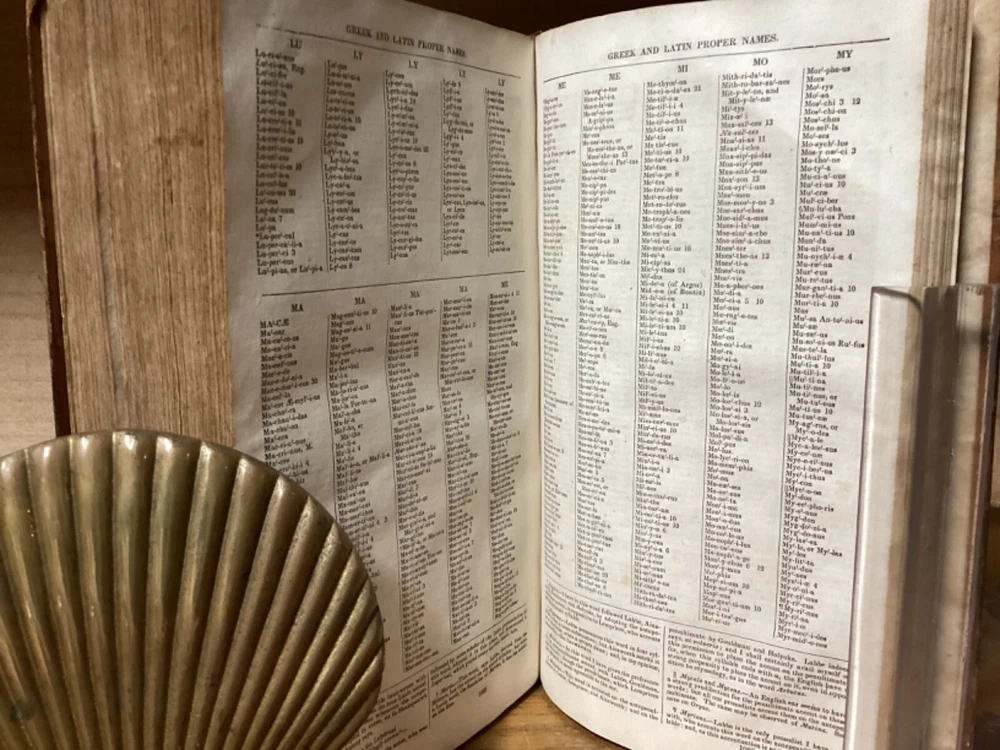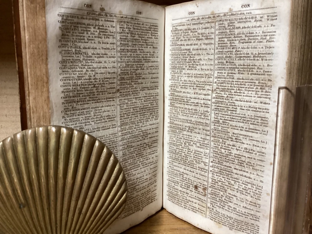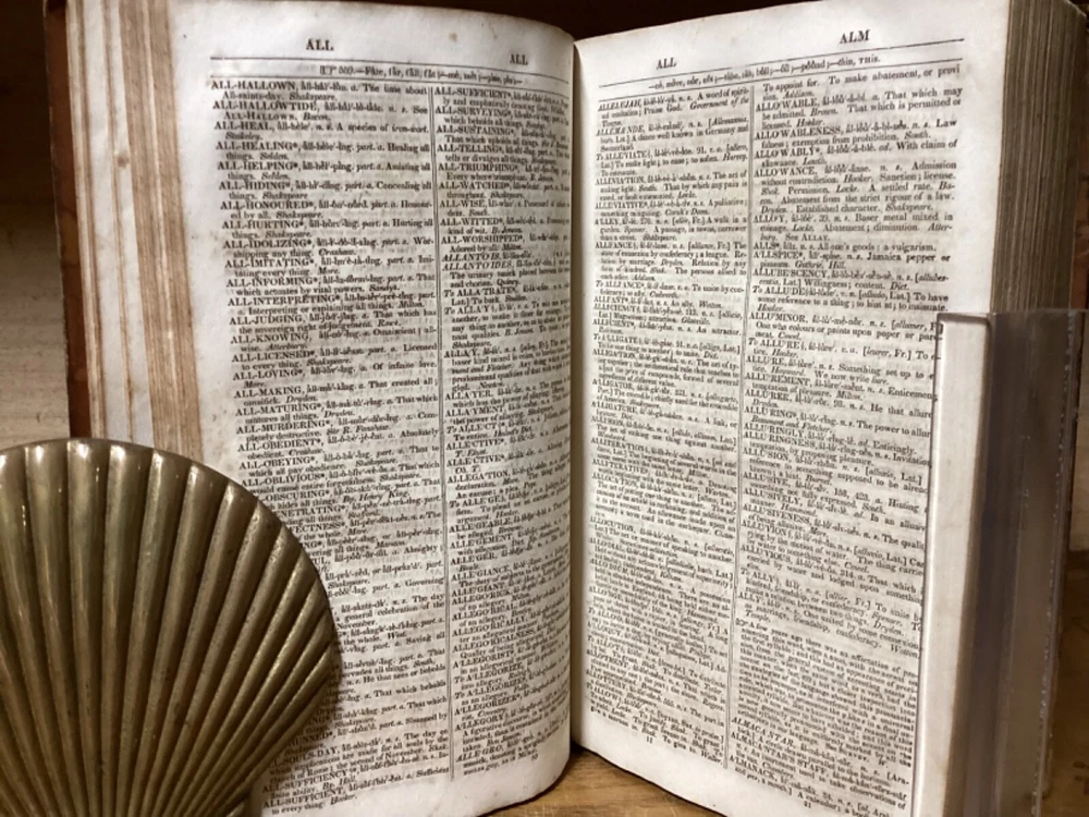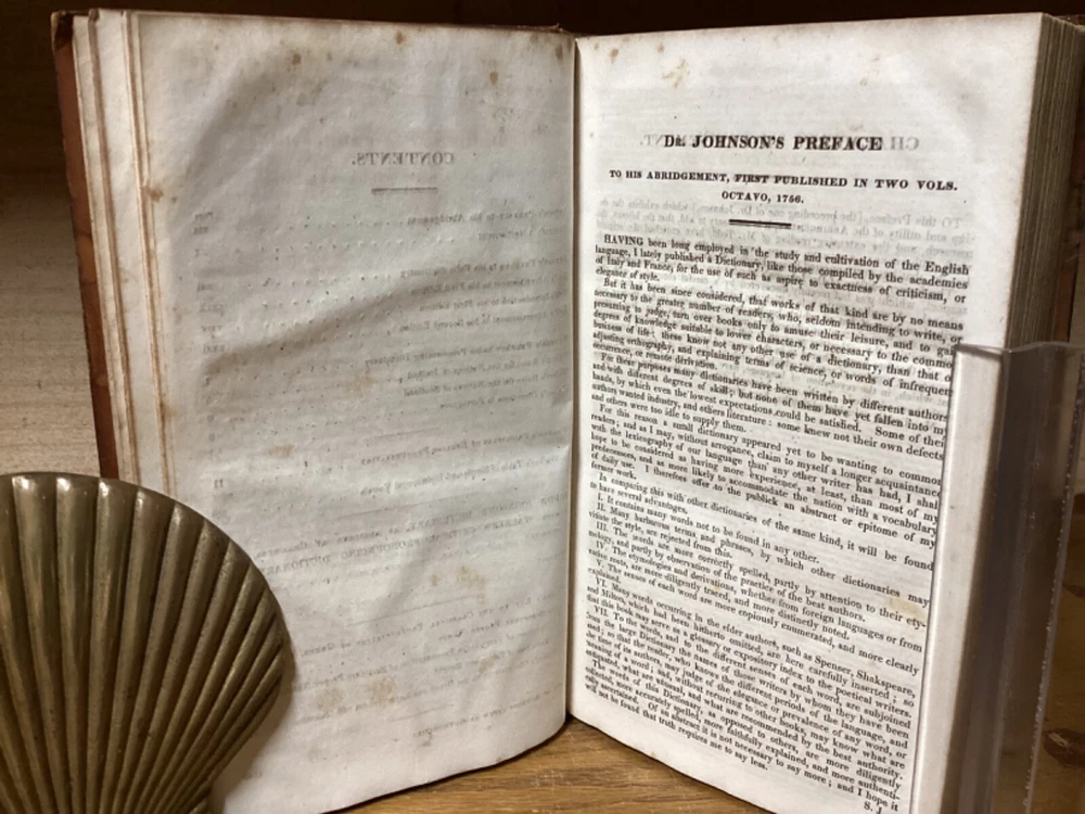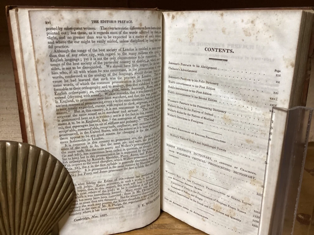 Johnson’s English Dictionary, as Improved by Todd, and Abridged by Chalmers; with Walker’s Pronouncing Dictionary, Combined: to Which is Added, Walker’s Key to the Classical Pronunciation of Greek, Latin, and Scripture Proper Names. Printed in Boston by Charles Ewer. 1829. [30] + 1155 pp. 9” x 5.5”. 8vo. Hardcover full leather. In good condition, with some scuffing and wear to leather. Minor chipping to title label on spine. Slight exterior cracking between front board and spine. Hinges remain in good condition and text block remains bound well. Inscription from Smithfield (likely Maine) at front. General age-related toning to pages, along with periodic foxing and wear. Please see photographs and ask any questions prior to purchasing. A scarce early Boston imprint of Samuel Johnson’s dictionary, with this being a later volume accompanied by improvements and an additional pronouncing dictionary. COLM1829ABFX