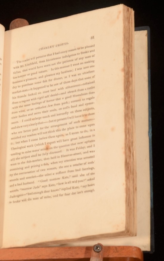 Click here to see our other books! Memoirs of Charley Crofts Containing Numerous Highly Entertaining Anecdotes Charley Crofts 1829 Edwards and Savage : Cork 9" by 5.5" (xv) 177pp. SUMMARY The scarce first edition of this humorous memoir from Charley Crofts. First Edition,Leather Binding,Scarce Overall Condition: Very Good This book weighs 0.5 KG when packed UK Postage: £ 3.99 US Postage: £ 15.99 EU Postage : £ 13.99 European Postage: £ 14.99 Asia Postage: £ 18.99 Worldwide Postage: £ 19.99 DESCRIPTION Rare Cork imprint of this Irish Character. First Edition. CONDITION In a half-morocco binding. Externally, smart, though with some marks. Internally, firmly bound. Pages are bright, though with some spotting throughout. Overall Condition: Very Good GLOSSARY OF TERMS Overall Condition (Dustwrapper condition rating is shown after that for the book itself, where a dustwrapper is present) Fine - Very well preserved copy showing very little wear Very Good Indeed - Only one or two minor faults, really a very attractive copy Very Good - Quite a wide term meaning no major faults but probably several smaller ones often expected given the age of the book, but still a respectable copy Good - Meaning not very good. Some more serious faults as will be described in the condition report under 'condition' Good Only - Meaning one or more faults that could really do with repair Fair - As with good only above but with other faults leaving a compromised copy even after repair Poor - Really bad and possibly seriously incomplete. We only sell books in this condition where their rarity or value makes them attractive none the less. Major defects will be described. GUARANTEE We offer a full money back guarantee on our descriptions. Please ask for details and conditions. We prefer PAYPAL. If you pay via PAYPAL we will post the item off the same or the next working day with the postage you have selected. Please note we cannot accept USD cheques