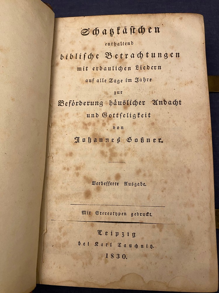 1830 German religious book by John Gossner (Johannes Goszner) Schubkästchen Enthaltend biblische betrachtungen mit erbaulichen liedern auf alle tahre zur befurderung hauslicher undacht und gottseligkeit von Johannes Goszner Measures 4 7/8" x 4 3/8" -- I never use stock photos. The photos you see are the actual item you will be purchasing. Books stored in smoke-free home . Always sold as is, but I ensure customer satisfaction. You come first. I allow my feedback to speak for me. Shipping: USPS Media Mail. Well wrapped and protected in a custom-made box. I ship within one day of receiving payment, often the same day. I can accommodate special requests at buyer’s expense & combined shipping is welcome. I do not ship on Saturday. Return Policy: If you are not happy with your purchase please give me the opportunity to make it right. Returns accepted via ebay policy.