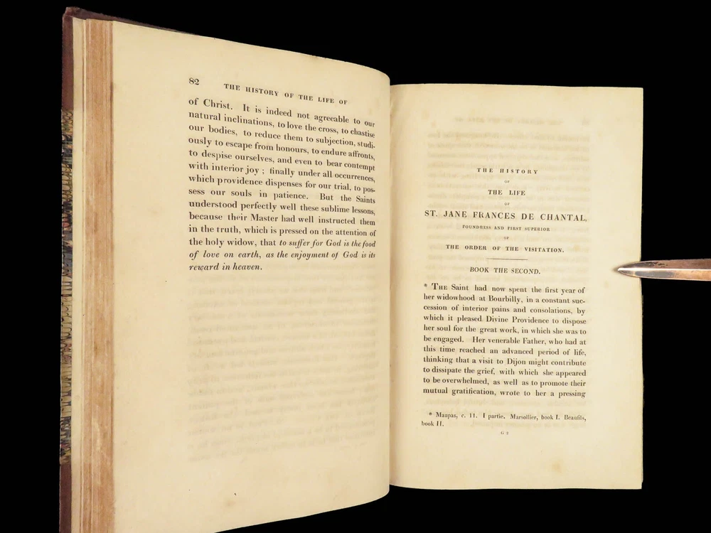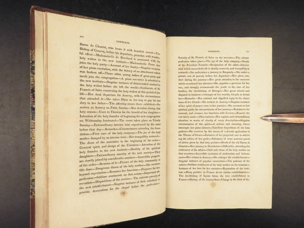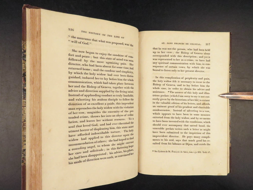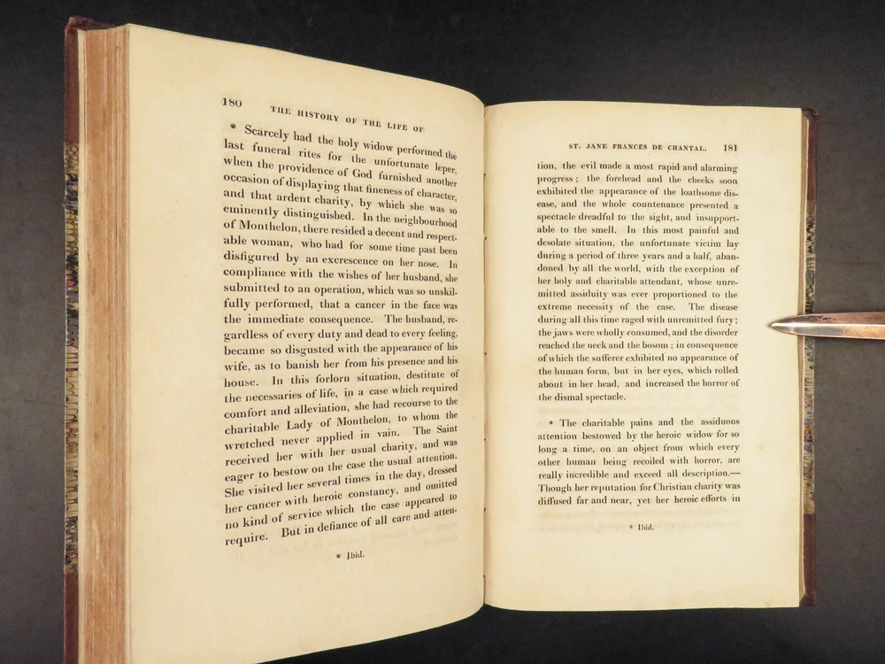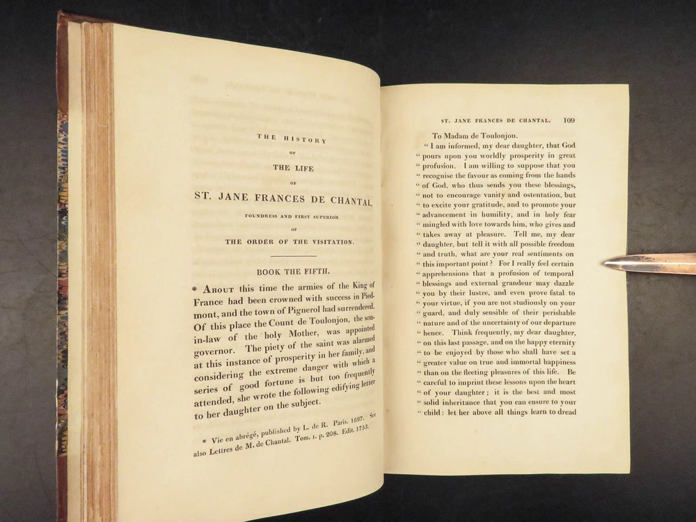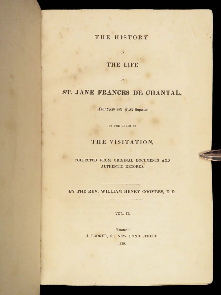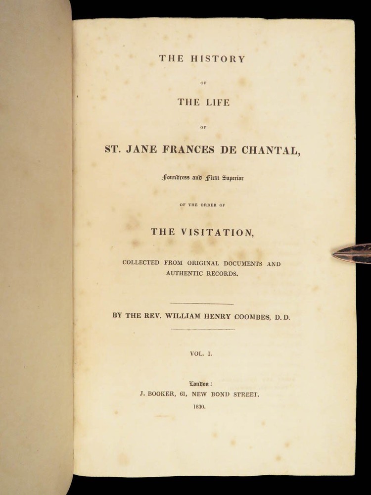 1830 Saint Jane Frances Chantal Catholic Nun Care for Poor Sick Prayers Coombes Jane Frances de Chantal was an 17 th -century Catholic nun known for founding the Visitation of the Holy Mary – an order which was established to help the poor, elderly, and sick who were rejected by others. Chantal was canonized by the Catholic Church in the 18 th -century after which numerous biographical sketches of her life and ministry were written. One such work was William Coombes’s “ History of the Life of St. Jane Frances de Chantal ”. This book describes her charity, her prayer life, her purity, and so much more! Item number: #25202 Price: $499 COOMBES, William Henry The history of the life of St. Jane Frances de Chantal : foundress and first superior of the Order of the Visitation London: J. Booker, 1830. 1 st edition Details : · Collation: Complete with all pages; 2 volumes o Vol. 1 – xvi, 400 o Vol. 2 – vii, [1], 374 · Provenance: Handwritten – [ Annie de Artime ], 1845 · Language: English · Binding: Leather; tight and secure · Size : ~8.5in X 5.5in (21.5cm x 14cm) · Quite rare Our Guarantee: Very Fast. Very Safe. Free Shipping Worldwide. Customer satisfaction is our priority! Notify us with 7 days of receiving, and we will offer a full refund without reservation! 25202