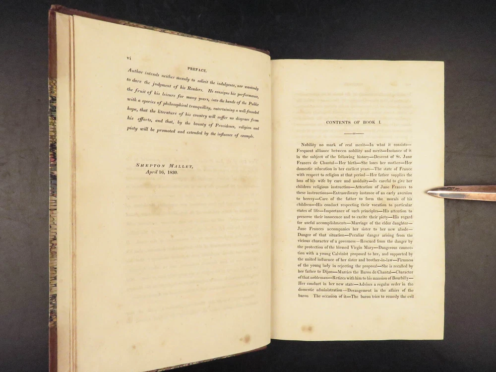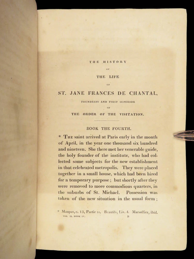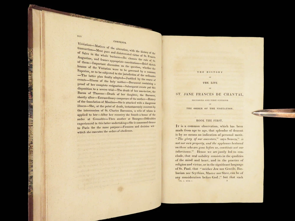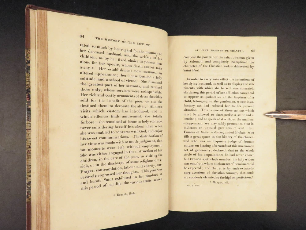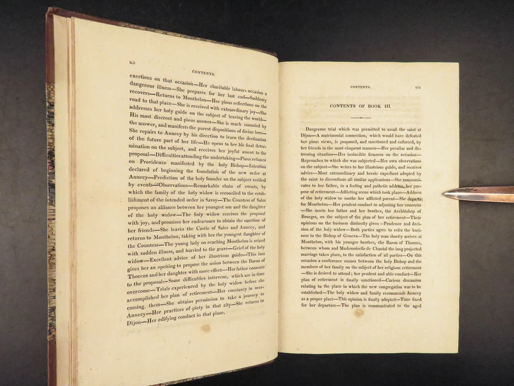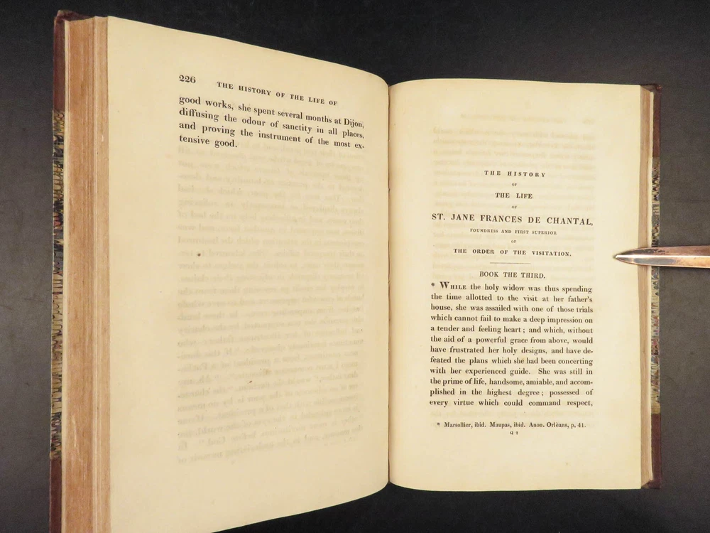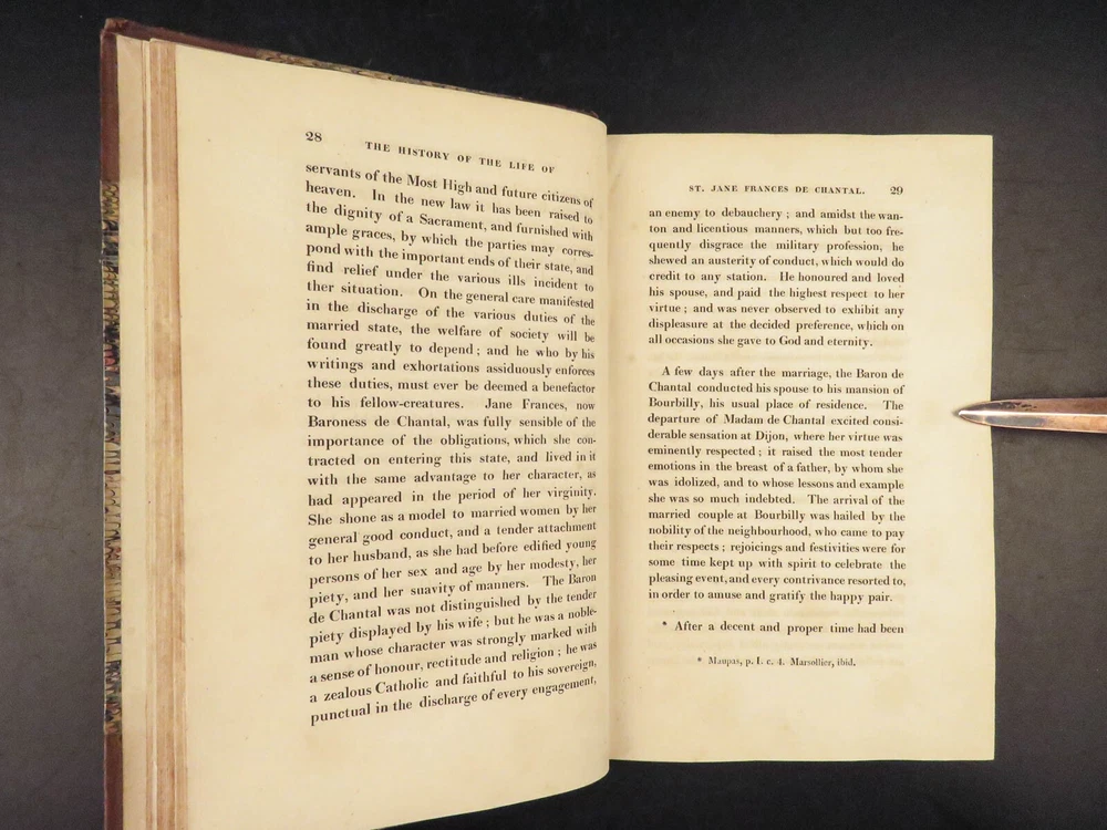 1830 Saint Jane Frances Chantal Catholic Nun Care for Poor Sick Prayers Coombes Jane Frances de Chantal was an 17 th -century Catholic nun known for founding the Visitation of the Holy Mary – an order which was established to help the poor, elderly, and sick who were rejected by others. Chantal was canonized by the Catholic Church in the 18 th -century after which numerous biographical sketches of her life and ministry were written. One such work was William Coombes’s “ History of the Life of St. Jane Frances de Chantal ”. This book describes her charity, her prayer life, her purity, and so much more! Item number: #25202 Price: $499 COOMBES, William Henry The history of the life of St. Jane Frances de Chantal : foundress and first superior of the Order of the Visitation London: J. Booker, 1830. 1 st edition Details : · Collation: Complete with all pages; 2 volumes o Vol. 1 – xvi, 400 o Vol. 2 – vii, [1], 374 · Provenance: Handwritten – [ Annie de Artime ], 1845 · Language: English · Binding: Leather; tight and secure · Size : ~8.5in X 5.5in (21.5cm x 14cm) · Quite rare Our Guarantee: Very Fast. Very Safe. Free Shipping Worldwide. Customer satisfaction is our priority! Notify us with 7 days of receiving, and we will offer a full refund without reservation! 25202