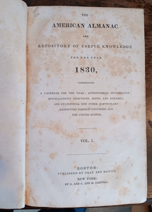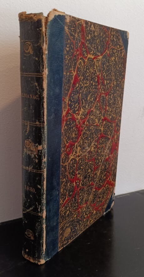 Greetings! Old Saratoga Books is pleased to offer: The American Almanac and Repository of Useful Knowledge for the Year 1830, Vol. I Only, Boston and New York: Gray and Bowen / G. and C. and H. Carvill, 1829. Fair ex-library copy. Library bookplate on front pastedown endpaper, boards worn, some light foxing and toning, musty. Halfbound black leather stamped in gilt on spine with marbled paper-covered sides. Sprinkled edges. xii, 300pp. An American almanac providing data about the coming year's calendar and natural phenomena, farming advice, facts concerning the use and abuse of ardent spirits, statistics about foreign countries and the United States, etc. Thank you for visiting our auctions. Old Saratoga Books owners Dan and Rachel Jagareski have been selling books since 1996. We had an open shop for twenty years in the historic village of Schuylerville and now sell books exclusively online. We are members of the Independent Online Booksellers Association (IOBA).