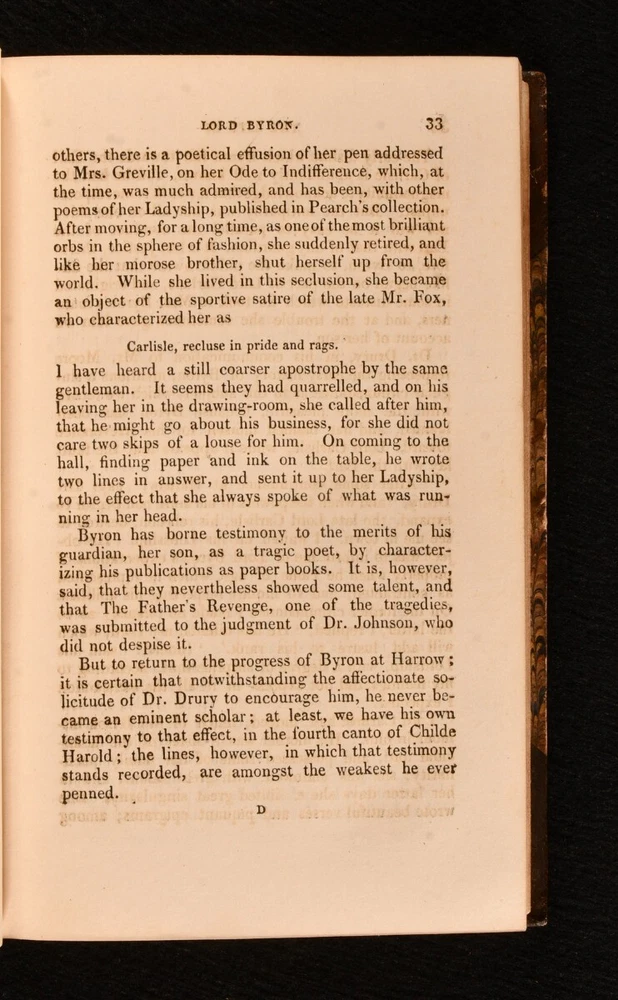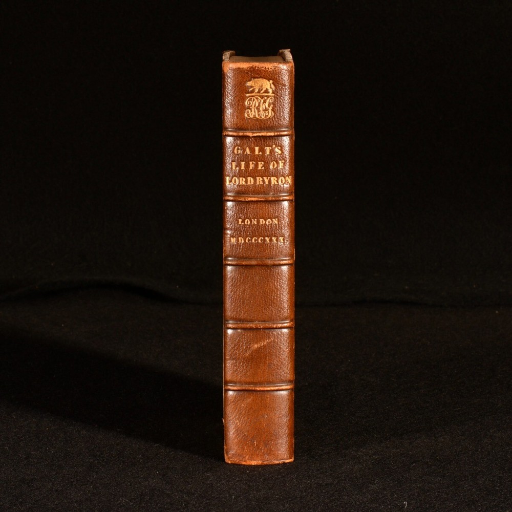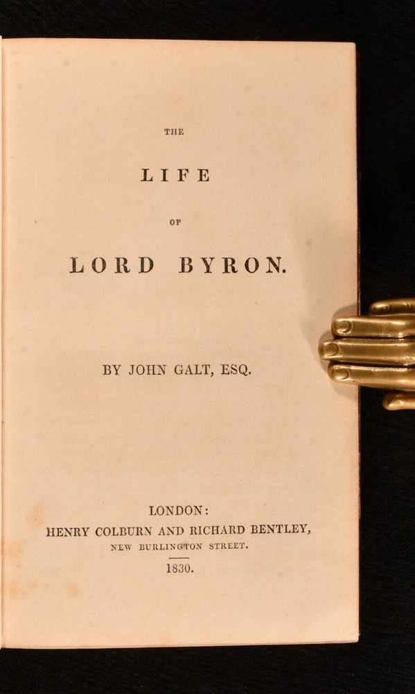 Click here to see our other books! The Life of Lord Byron John Galt 1830 Henry Colburn and Richard Bentley : London 7" by 4.5" xii, 372pp. SUMMARY A first edition copy of this biography of Lord Byron, written by his friend, the Scottish novelist John Galt. First Edition,Illustrated Overall Condition: Very Good This book weighs 0.5 KG when packed UK Postage: £ 3.99 US Postage: £ 15.99 EU Postage : £ 13.99 European Postage: £ 14.99 Asia Postage: £ 18.99 Worldwide Postage: £ 19.99 DESCRIPTION The first edition of this work in a half calf binding with marbled boards. Bookplate of Mark Aikin to the front paste down. Illustrated with a frontispiece and a title page vignette. The first full biography of the notable poet Lord Byron, by John Galt (1779-1839), who befriended Byron in Gibraltar while on a business trip through Europe. Galt is considered to have been the first political novelist, as he was the first to deal with the subject of the Industrial Revolution. He was also well-known as a political and social commentator. CONDITION In a half calf binding. Externally, generally smart, with a little rubbing to the extremities and shelf wear to the boards. Internally, firmly bound. Pages are bright and clean except for offsetting to the end papers. Overall Condition: Very Good GLOSSARY OF TERMS Overall Condition (Dustwrapper condition rating is shown after that for the book itself, where a dustwrapper is present) Fine - Very well preserved copy showing very little wear Very Good Indeed - Only one or two minor faults, really a very attractive copy Very Good - Quite a wide term meaning no major faults but probably several smaller ones often expected given the age of the book, but still a respectable copy Good - Meaning not very good. Some more serious faults as will be described in the condition report under 'condition' Good Only - Meaning one or more faults that could really do with repair Fair - As with good only above but with other faults leaving a compromised copy even after repair Poor - Really bad and possibly seriously incomplete. We only sell books in this condition where their rarity or value makes them attractive none the less. Major defects will be described. GUARANTEE We offer a full money back guarantee on our descriptions. Please ask for details and conditions. We prefer PAYPAL. If you pay via PAYPAL we will post the item off the same or the next working day with the postage you have selected. Please note we cannot accept USD cheques