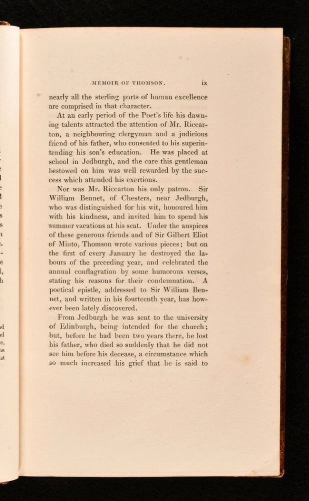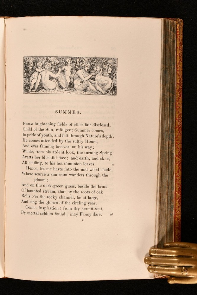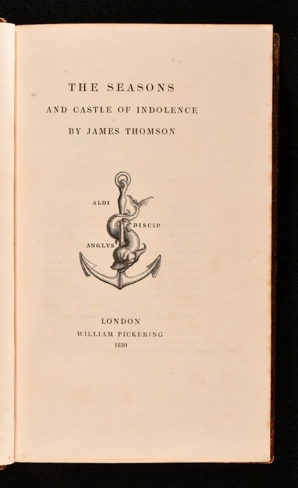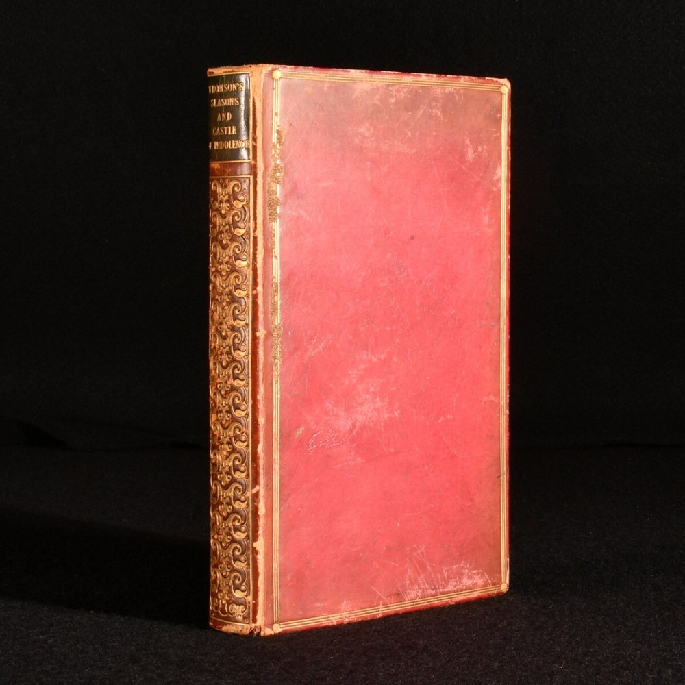 Click here to see our other books! The Seasons and Castle of Indolence James Thomson 1830 William Pickering : London 7.5" by 5" cxxviii, 292pp. SUMMARY A collection of James Thomson's most notable works, 'The Seasons' and 'Castle of Indolence', with his memoir. Leather Binding Overall Condition: Good This book weighs 0.75 KG when packed UK Postage: £ 3.99 US Postage: £ 19.99 EU Postage : £ 15.99 European Postage: £ 16.99 Asia Postage: £ 21.99 Worldwide Postage: £ 25.99 DESCRIPTION The sought after Aldine edition. In a full calf binding with gilt detail. A combined edition of these two popular poems by the prolific Scottish poet, James Thomson. Complete with a detailed memoir of the author. James Thomson is best known for writing the patriotic lyrics to 'Rule, Britannia!' Lacking the portrait frontispiece. CONDITION In a full calf binding with gilt detail. Externally sound with rubbing to the extremities and spine. Marks to the boards. Spotting to front and back free endpapers. Internally, firmly bound. Pages bright and clean with light spots to the front and back. Contemporary ink inscription to front blank. Overall Condition: Good GLOSSARY OF TERMS Overall Condition (Dustwrapper condition rating is shown after that for the book itself, where a dustwrapper is present) Fine - Very well preserved copy showing very little wear Very Good Indeed - Only one or two minor faults, really a very attractive copy Very Good - Quite a wide term meaning no major faults but probably several smaller ones often expected given the age of the book, but still a respectable copy Good - Meaning not very good. Some more serious faults as will be described in the condition report under 'condition' Good Only - Meaning one or more faults that could really do with repair Fair - As with good only above but with other faults leaving a compromised copy even after repair Poor - Really bad and possibly seriously incomplete. We only sell books in this condition where their rarity or value makes them attractive none the less. Major defects will be described. GUARANTEE We offer a full money back guarantee on our descriptions. Please ask for details and conditions. We prefer PAYPAL. If you pay via PAYPAL we will post the item off the same or the next working day with the postage you have selected. Please note we cannot accept USD cheques