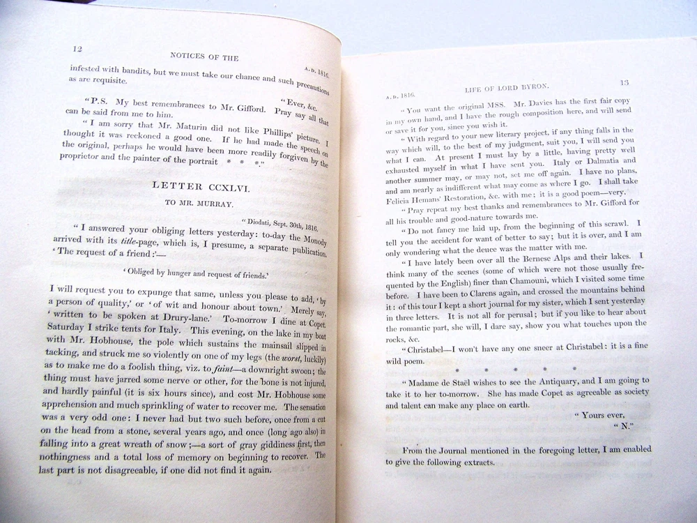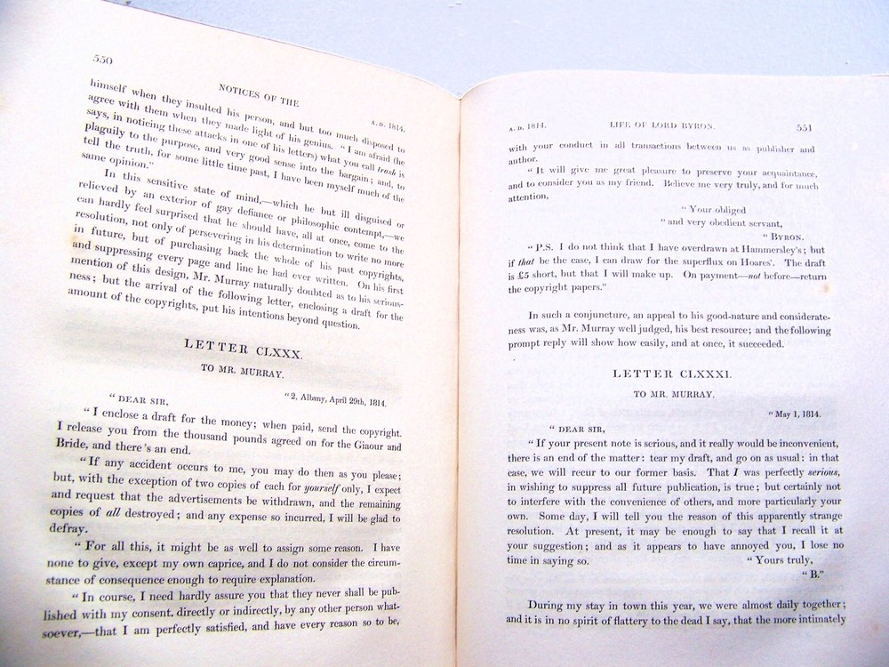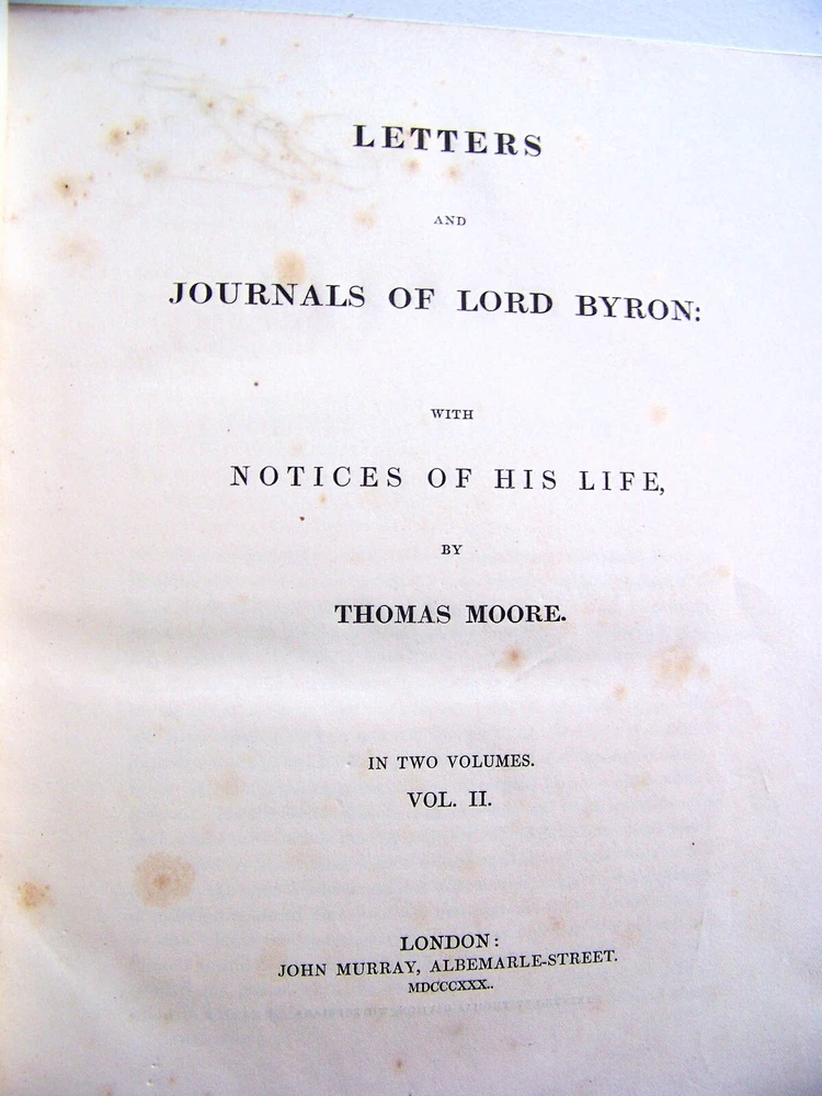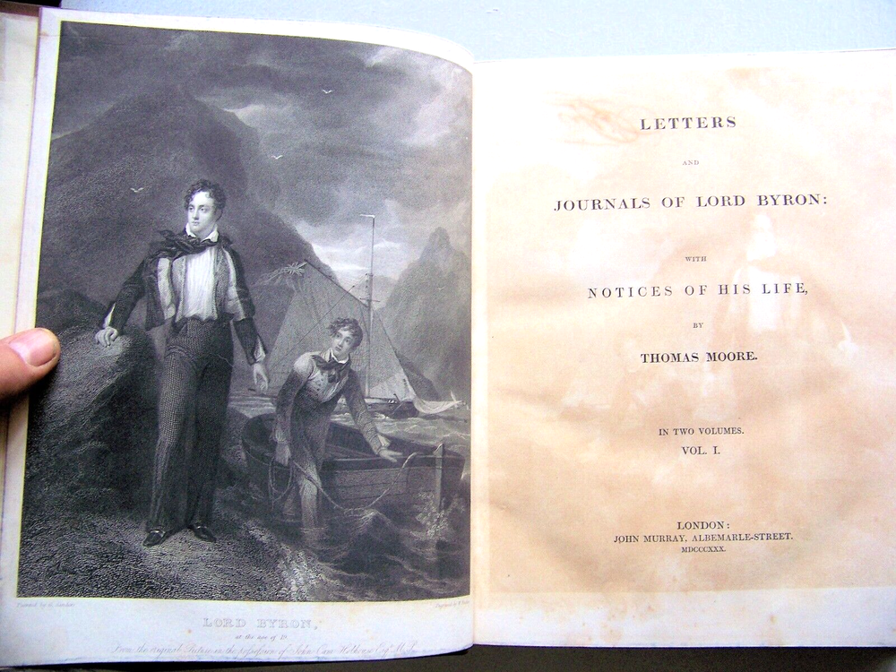 WE'VE PURCHASED ANOTHER TERRIFIC COLLECTION OF BOOKS A LIBRARY FULL OF VINTAGE BOOKS! FIRST EDITIONS SCARCE TITLES A WIDE VARIETY OF TOPICS SO GET COMFORTABLE...GRAB A CUP OF COFFEE...AND ENJOY SHOPPING SCARCE COPY OF THE 1830 U. K. FIRST EDITION TWO VOLUME SET BIG, HEAVY BOOKS QUARTER LEATHER BOUND WITH RAISED RIBS ON SPINE MARBLED PAGE EDGES THE LETTERS AND JOURNALS OF LORD BYRON BY: THOMAS MOORE PUBLISHED BY: JOHN MURRAY