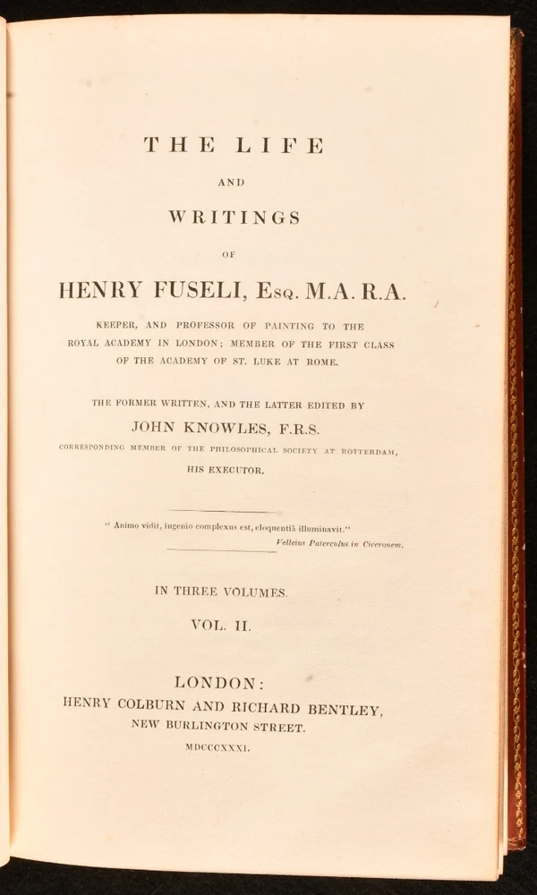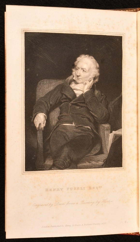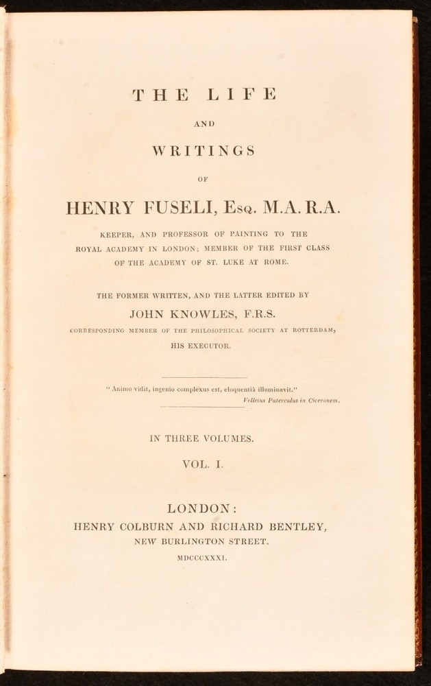 Click here to see our other books! The Life and Writings of Henry Fuseli John Knowles 1831 Henry Colburn and Richard Bentley : London 9" by 5.5" xvi, 439pp; [4], 391pp; [4], 408pp SUMMARY The uncommon first edition of this three volume biography of Henry Fuseli. First Edition,Illustrated,Leather Binding,Uncommon Overall Condition: Good This book weighs 3 KG when packed UK Postage: £ 3.99 US Postage: £ 36.99 EU Postage : £ 25.99 European Postage: £ 27.99 Asia Postage: £ 47.99 Worldwide Postage: £ 69.99 DESCRIPTION First edition of The Life and Writings of Henry Fuseli by John Knowles in full calf bindings. Complete in three volumes. Illustrated with a monochrome plate as the frontispiece of Volume I. Collated, complete. Henry Fuseli was a Swiss painter and writer who dealt with many subjects but was best known for his supernatural subject matter. Prior owner's book plate to the first pastedown of each volume. Prior owner's ink inscription to the first free endpaper of Volume III dated 1862. Small library stamp to the bottom right corner of the first free endpapers of each volume. CONDITION In full calf bindings. Externally, smart. There is some rubbing to the heads and tails of the spines and to the extremities. The title labels to the spine of Volume I are missing. There is a chip to one of the spine labels of Volume II. There are some light markings to the boards, with a notable mark to the front board of Volume III. Prior owner's book plate to the first pastedown of each volume. Prior owner's ink inscription to the first free endpaper of Volume III dated 1862. Small library stamp to the bottom right corner of the first free endpapers of each volume. Internally, firmly bound. The pages are bright and clean with some occasional light spotting. Overall Condition: Good GLOSSARY OF TERMS Overall Condition (Dustwrapper condition rating is shown after that for the book itself, where a dustwrapper is present) Fine - Very well preserved copy showing very little wear Very Good Indeed - Only one or two minor faults, really a very attractive copy Very Good - Quite a wide term meaning no major faults but probably several smaller ones often expected given the age of the book, but still a respectable copy Good - Meaning not very good. Some more serious faults as will be described in the condition report under 'condition' Good Only - Meaning one or more faults that could really do with repair Fair - As with good only above but with other faults leaving a compromised copy even after repair Poor - Really bad and possibly seriously incomplete. We only sell books in this condition where their rarity or value makes them attractive none the less. Major defects will be described. GUARANTEE We offer a full money back guarantee on our descriptions. Please ask for details and conditions. We prefer PAYPAL. If you pay via PAYPAL we will post the item off the same or the next working day with the postage you have selected. Please note we cannot accept USD cheques