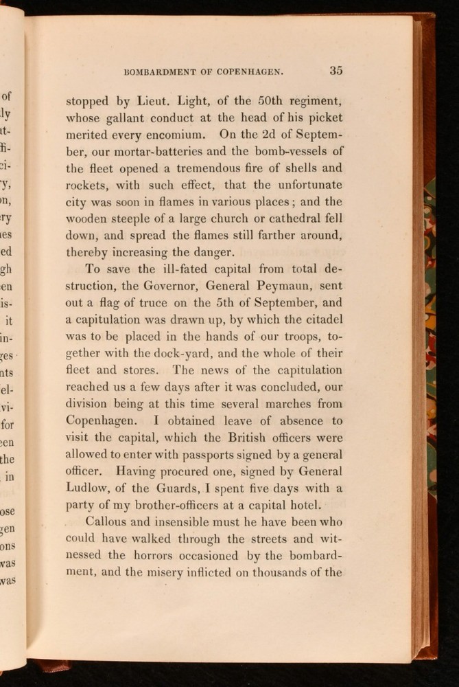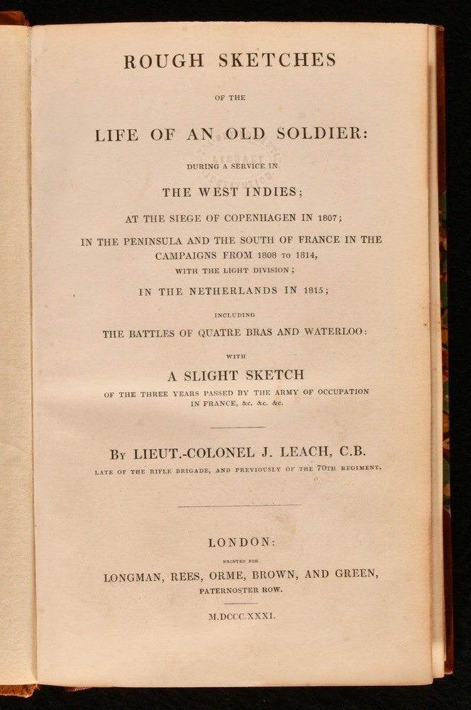 Click here to see our other books! Rough Sketches of the Life of an Old Soldier: During a Service in the West Indies at the Siege of Copenhagen in 1807 Lieut.-Colonel J. Leach 1831 Longman, Rees, Orme, Brown and Green : London 8.5" by 5.5" xxix [2], 2-411pp SUMMARY The uncommon first edition of Lieutenant-Colonel Jonathan Leach's first hand account of the Light Division's campaigns during the Peninsular Wars, in a lovely half calf binding. First Edition,Leather Binding,Uncommon Overall Condition: Near Fine This book weighs 0.75 KG when packed UK Postage: £ 3.99 US Postage: £ 19.99 EU Postage : £ 15.99 European Postage: £ 16.99 Asia Postage: £ 21.99 Worldwide Postage: £ 25.99 DESCRIPTION The work recounts the Peninsular War, during which the author, Jonathan Leach, fought in the south of France in campaigns from 1808 to 1814. During this time, he was with the Light Division. The Light Division was formed in 1803 during the Napoleonic Wars, with this memoir offering a first hand account of the newly formed light infantry division, at an interesting and turbulent time for the division. The author offers here an unbroken narrative; almost every scene recounted in this work was one to which he was an eyewitness, and recorded in his journal. For other scenes, the author utilised the log-books of his brother-officers. With a library blind stamp to the head of the title page, and no further library markings. The first edition of this memoir of a Lieutenant-Colonel's experiences in the Peninsular War, in a wonderful half calf binding. CONDITION Rebound in half calf, with gilt detailing to back strip and bright marbled paper covered boards. Externally, fine. Endpapers renewed. Internally, firmly bound. Blind stamp to title page. With only the odd light handling mark or spot, with pages otherwise clean and bright. Overall Condition: Near Fine GLOSSARY OF TERMS Overall Condition (Dustwrapper condition rating is shown after that for the book itself, where a dustwrapper is present) Fine - Very well preserved copy showing very little wear Very Good Indeed - Only one or two minor faults, really a very attractive copy Very Good - Quite a wide term meaning no major faults but probably several smaller ones often expected given the age of the book, but still a respectable copy Good - Meaning not very good. Some more serious faults as will be described in the condition report under 'condition' Good Only - Meaning one or more faults that could really do with repair Fair - As with good only above but with other faults leaving a compromised copy even after repair Poor - Really bad and possibly seriously incomplete. We only sell books in this condition where their rarity or value makes them attractive none the less. Major defects will be described. GUARANTEE We offer a full money back guarantee on our descriptions. Please ask for details and conditions. We prefer PAYPAL. If you pay via PAYPAL we will post the item off the same or the next working day with the postage you have selected. Please note we cannot accept USD cheques