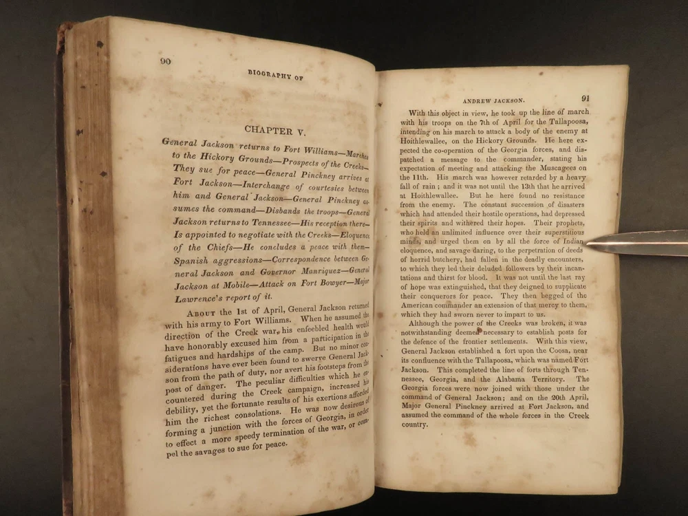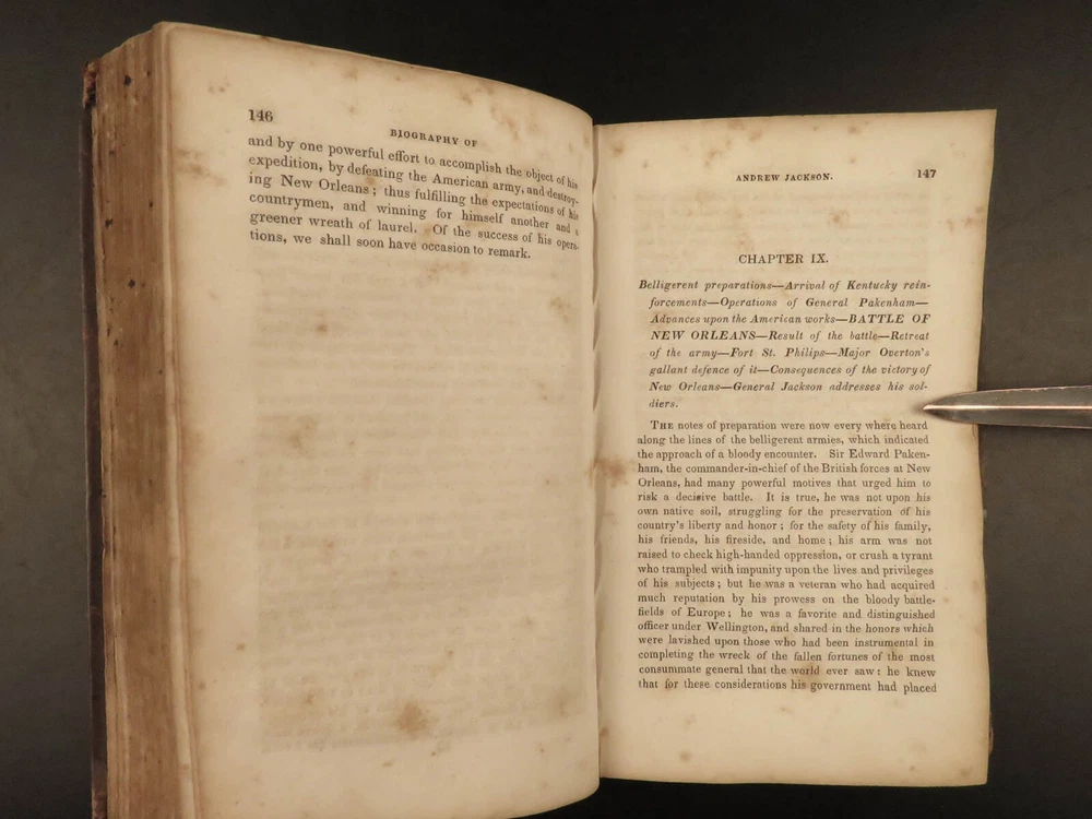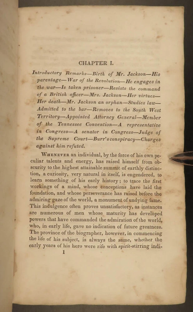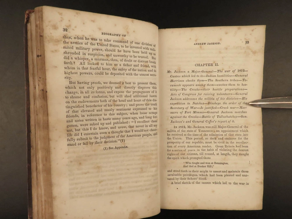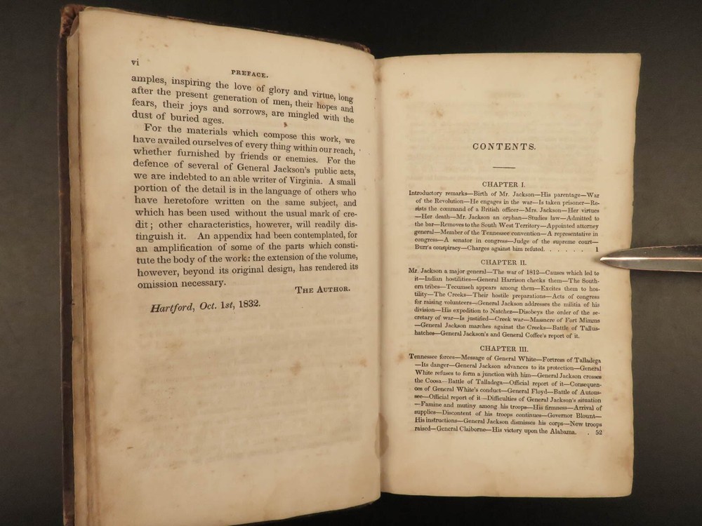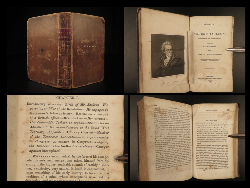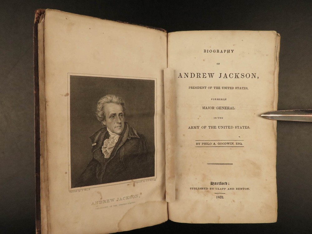1832 1 ed President Andrew Jackson Military Politics US Revolutionary War of 1812 “ It is a damn poor mind that can think of only one way to spell a word.” ― Andrew Jackson Philo Goodwin’s ‘ Biography of Andrew Jackson ’ is a rare, early 19th-century account of the famed American President, focusing primarily on his career as a military officer and as a lawyer. This 1832 first edition of Goodwin’s book includes a portrait frontispiece of Andrew Jackson. It is filled with information regarding his early childhood, civil life as lawyer senator and judge, as well as heroics in the War of 1812, the Creek War, and the American Revolution with an inclusion of his time in the presidency. Item number: #40156 Price: $499 GOODWIN, Philo A. Biography of Andrew Jackson, president of the United States, formerly major general in the Army of the United States. Hartford: Clapp and Benton, 1832. First edition. Details : · Collation: Complete o xi, [1], 422 o Includes engraved frontispiece · Provenance: Binding stamp – W. E. Bates · Language: English · Binding: Leather; tight and secure · Size : ~7.5in X 4.5in (19cm x 11.5cm) Our Guarantee: Very Fast. Very Safe. Free Shipping Worldwide. Customer satisfaction is our priority! Notify us with 7 days of receiving, and we will offer a full refund without reservation! 40156