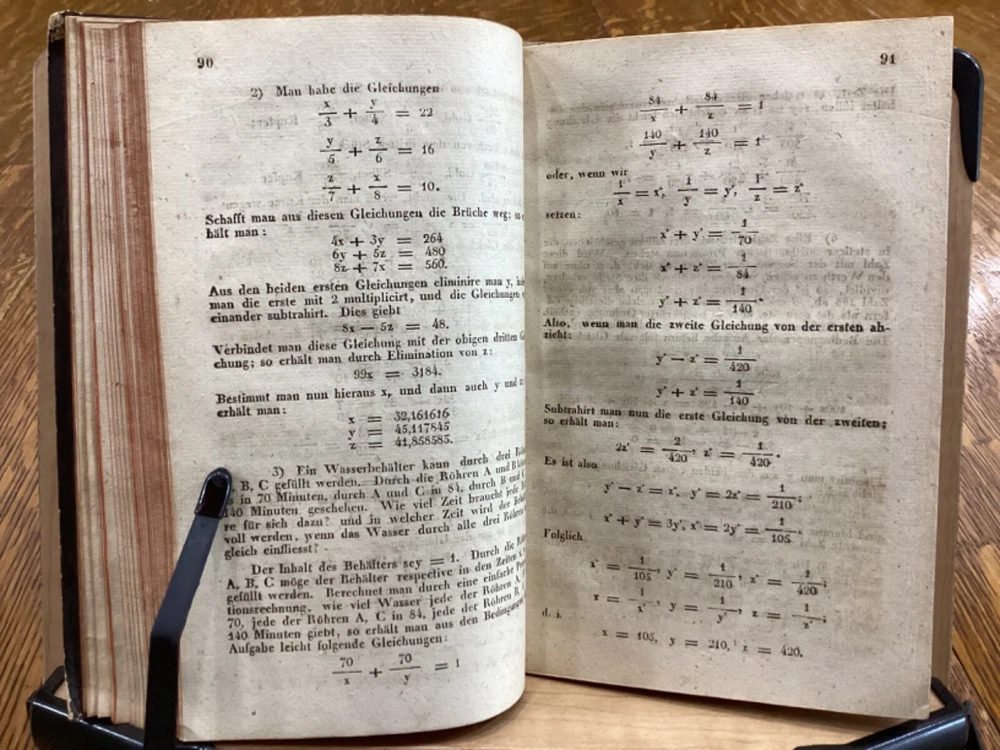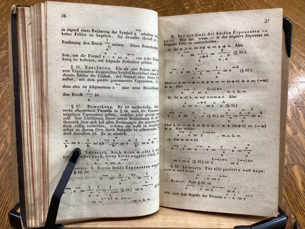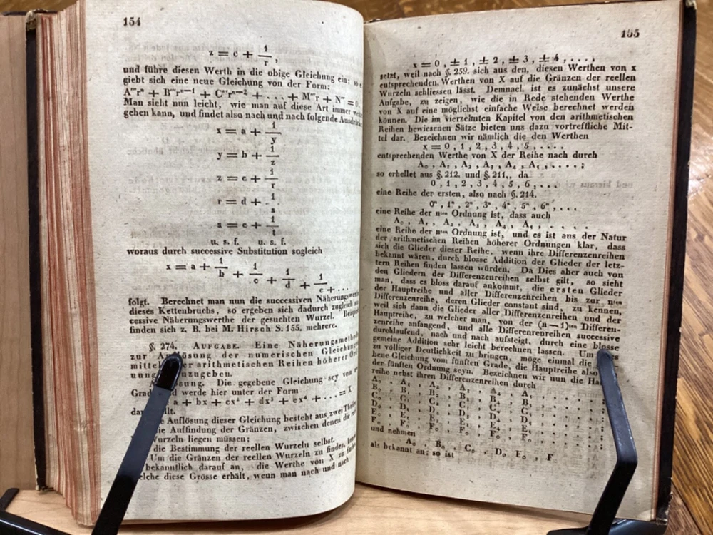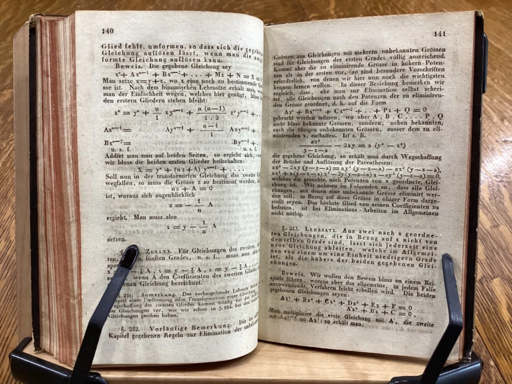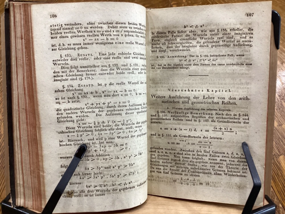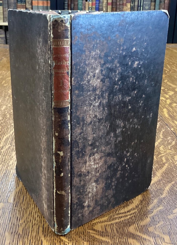 Lehrbuch der Mathematik für die oberen Klassen höherer Lehranstalten by Johann August Grunert, Erster Theil, Allgemeine Arithmetik, J. J. Wiesike, Brandenburg, 1832, 180pp, leather, 5 x 8", 12mo Fair condition. Wear to boards. Tips are bumped with exposed boards. Chipping and cracking to spine; still legible. Fore edges have been painted red. Possible provenance in ink on title page. Toning, age-staining, and foxing throughout textblock. Please see photos. Johann August Grunert (7 February 1797 - 7 June 1872) was a German mathematician. In 1833, he became a full professor of mathematics at the University of Greifswald. His mathematical textbooks for upper and middle classes at higher educational institutions were published several times. FORN-TUB-0036-BB-0524-JC679