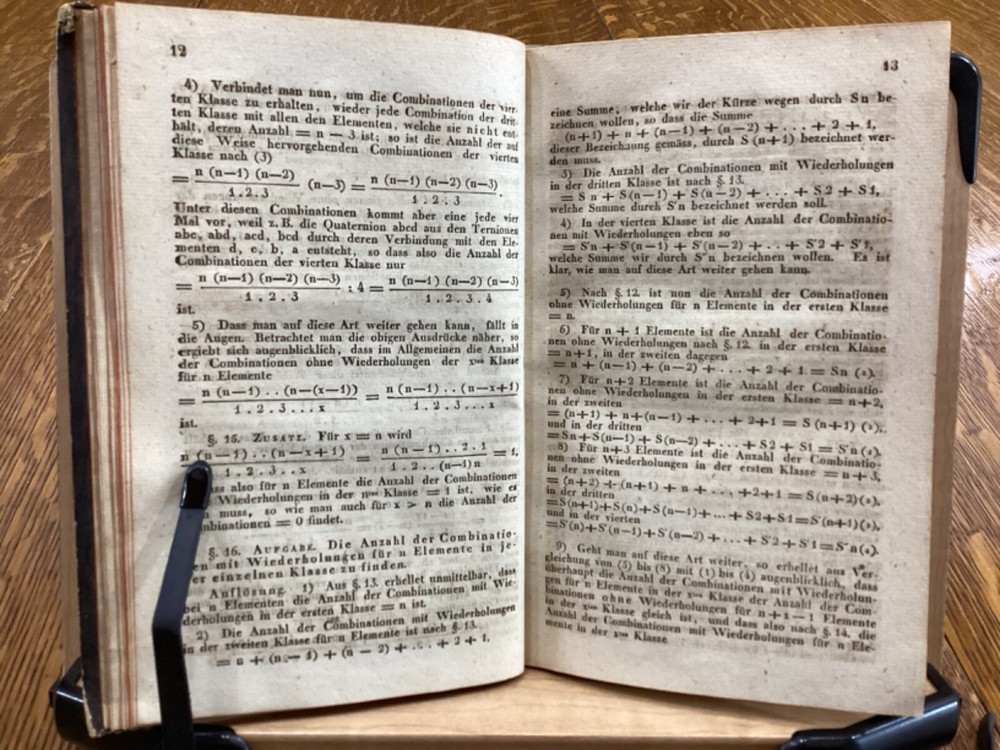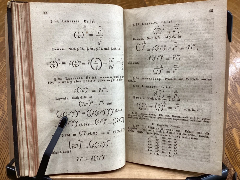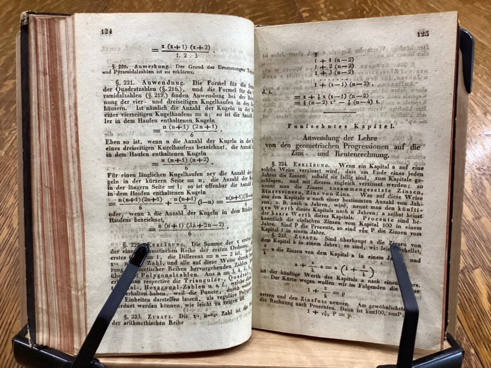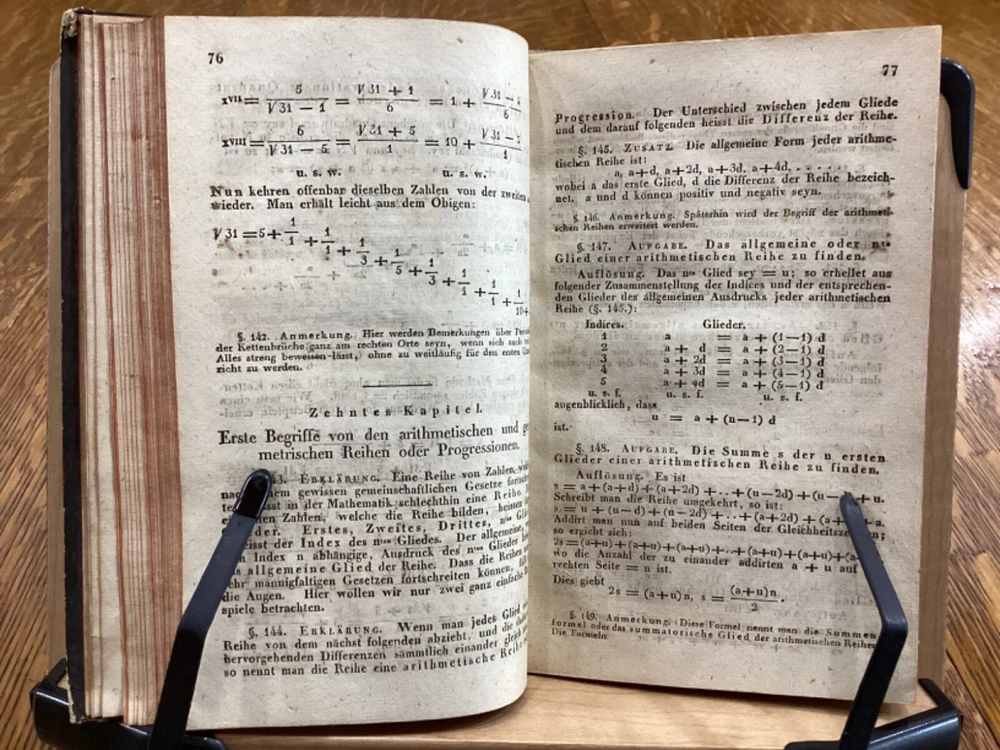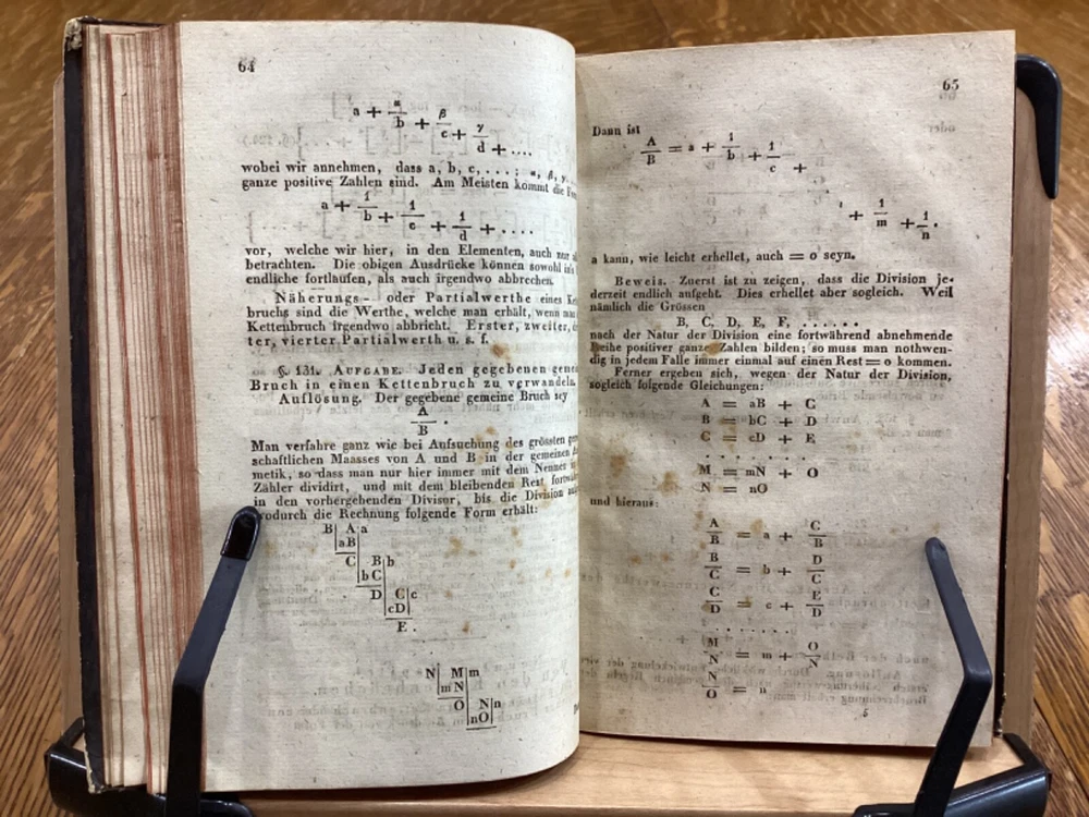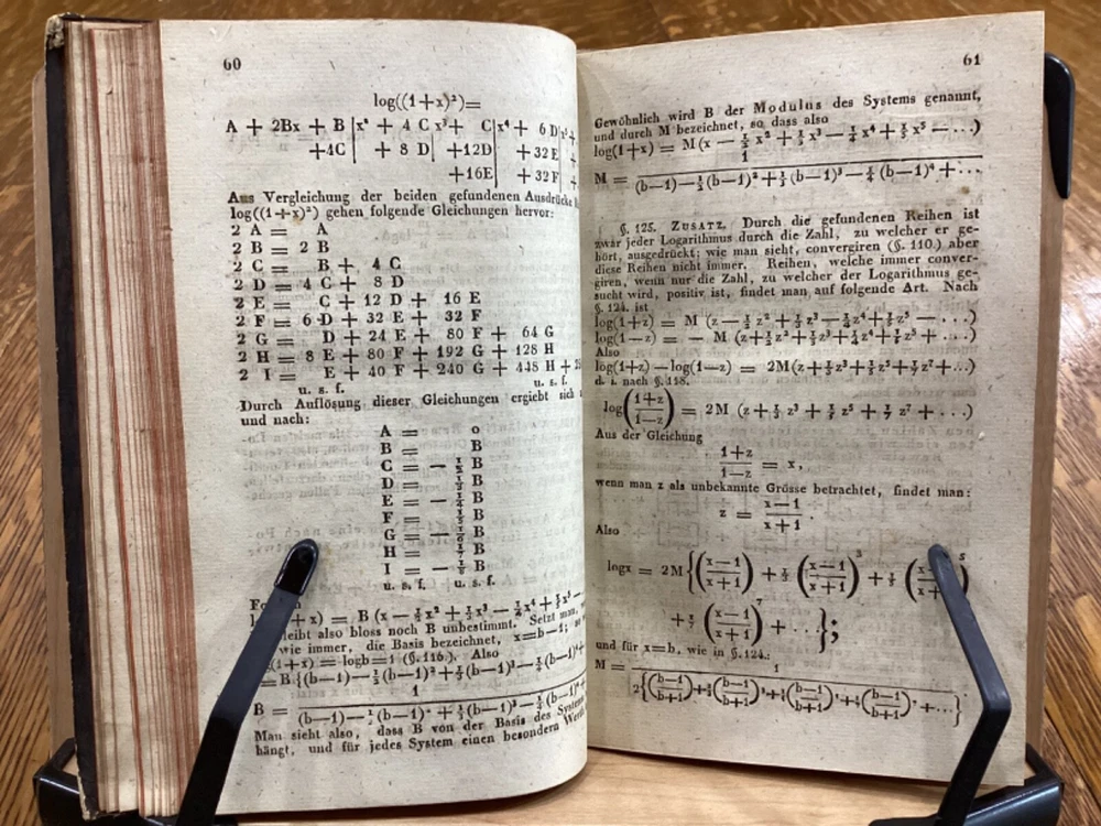 Lehrbuch der Mathematik für die oberen Klassen höherer Lehranstalten by Johann August Grunert, Erster Theil, Allgemeine Arithmetik, J. J. Wiesike, Brandenburg, 1832, 180pp, leather, 5 x 8", 12mo Fair condition. Wear to boards. Tips are bumped with exposed boards. Chipping and cracking to spine; still legible. Fore edges have been painted red. Possible provenance in ink on title page. Toning, age-staining, and foxing throughout textblock. Please see photos. Johann August Grunert (7 February 1797 - 7 June 1872) was a German mathematician. In 1833, he became a full professor of mathematics at the University of Greifswald. His mathematical textbooks for upper and middle classes at higher educational institutions were published several times. FORN-TUB-0036-BB-0524-JC679