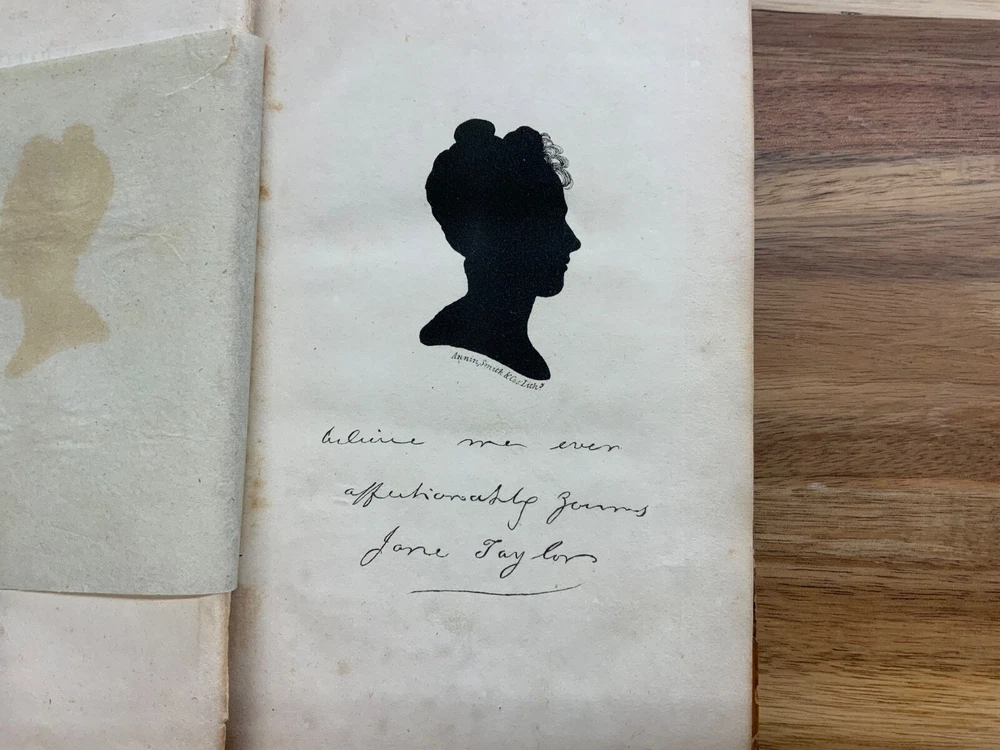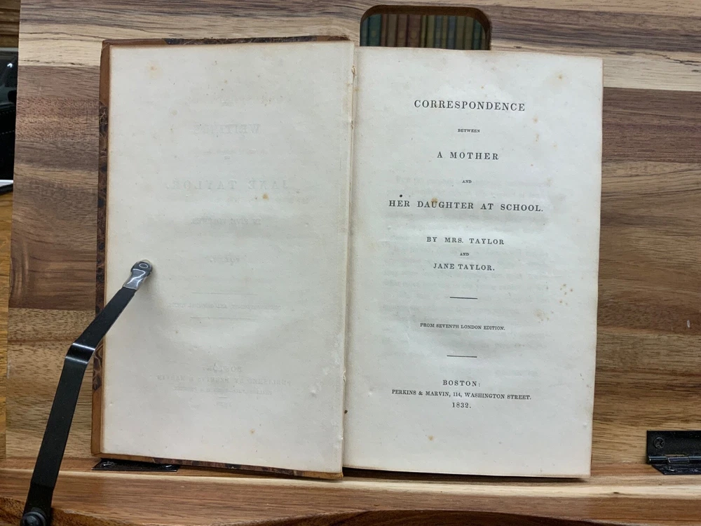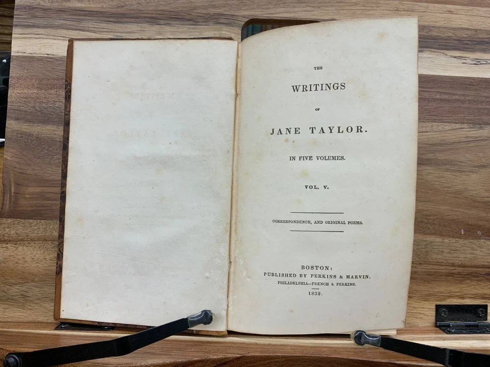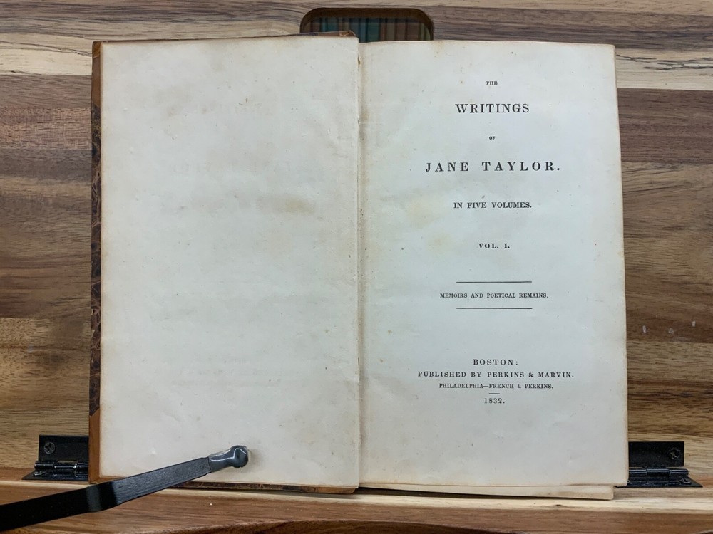 The Writings of Jane Taylor in Five Volumes. Boston: Published by Perkins & Marvin, 1832. Complete Set. Uniform half-leather marbled bindings measure 7.25 x 4.5", 12mos. Vol. I: 1832, Memoirs, Correspondence, and Poetical Remains; A New Edition. 346 p. Vol. II: 1831, The Contributions of Q. Q. To a Periodical Work: With Some Pieces Not Before Published. Part I: Religious and Didactic Pieces, From Fifth London Edition. 295 p. Vol. III: 1832, The Contributions of Q. Q. To a Periodical Work: With Some Pieces Not Before Published. Part II: Miscellaneous Pieces. 268 p. Vol. IV: 1832, Display, A Tale. From Twelfth London Edition, 180 p + Essays in Rhyme, on Morals and Manners , 108 p. Vol. V: 1832, Correspondence Between a Mother and Her Daughter at School. From Seventh London Edition, 296 p. In fair condition. All front hinges cracked - front boards attached via cording only - FRAGILE! Boars are normally scuffed at edges and worn/bumped at leather corners. Heads and tails of spines scuffed with some chipping. Title and volume labels remain intact with some normal scuffing. Gilt lettering and deco overall attractive with some normal soiling. Some rear hinges cracked. Toning and age-staining throughout text-blocks. Off-setting on tissue guard in Vol. I, from silhouette frontispiece. Bindings are shaken. Please see photos. Jane Taylor (1783 - 1824) was an English poet and novelist. She wrote the words to the song Twinkle, Twinkle, Little Star, which is widely known, but is generally forgotten who wrote it. The sisters Jane and Ann Taylor and their authorship of various works have often been confused, in part because their early ones were published together. Jane Taylor is credited by Robert Browning in an introductory note to a late poem, “Rephan”, which he states was “suggested by a very early recollection of a prose story” by her. Complete Set. Boston Imprint. RARES1832BGHA - 05/20 FORN-SHELF-0506-BB-2505-HKREV830