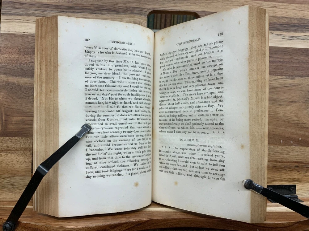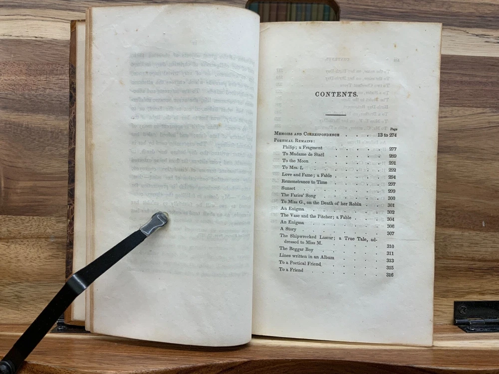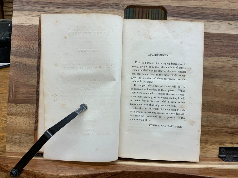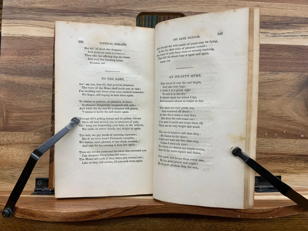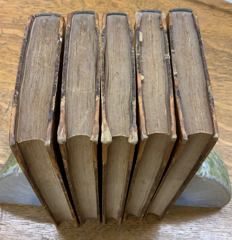 The Writings of Jane Taylor in Five Volumes. Boston: Published by Perkins & Marvin, 1832. Complete Set. Uniform half-leather marbled bindings measure 7.25 x 4.5", 12mos. Vol. I: 1832, Memoirs, Correspondence, and Poetical Remains; A New Edition. 346 p. Vol. II: 1831, The Contributions of Q. Q. To a Periodical Work: With Some Pieces Not Before Published. Part I: Religious and Didactic Pieces, From Fifth London Edition. 295 p. Vol. III: 1832, The Contributions of Q. Q. To a Periodical Work: With Some Pieces Not Before Published. Part II: Miscellaneous Pieces. 268 p. Vol. IV: 1832, Display, A Tale. From Twelfth London Edition, 180 p + Essays in Rhyme, on Morals and Manners , 108 p. Vol. V: 1832, Correspondence Between a Mother and Her Daughter at School. From Seventh London Edition, 296 p. In fair condition. All front hinges cracked - front boards attached via cording only - FRAGILE! Boars are normally scuffed at edges and worn/bumped at leather corners. Heads and tails of spines scuffed with some chipping. Title and volume labels remain intact with some normal scuffing. Gilt lettering and deco overall attractive with some normal soiling. Some rear hinges cracked. Toning and age-staining throughout text-blocks. Off-setting on tissue guard in Vol. I, from silhouette frontispiece. Bindings are shaken. Please see photos. Jane Taylor (1783 - 1824) was an English poet and novelist. She wrote the words to the song Twinkle, Twinkle, Little Star, which is widely known, but is generally forgotten who wrote it. The sisters Jane and Ann Taylor and their authorship of various works have often been confused, in part because their early ones were published together. Jane Taylor is credited by Robert Browning in an introductory note to a late poem, “Rephan”, which he states was “suggested by a very early recollection of a prose story” by her. Complete Set. Boston Imprint. RARES1832BGHA - 05/20 FORN-SHELF-0506-BB-2505-HKREV830