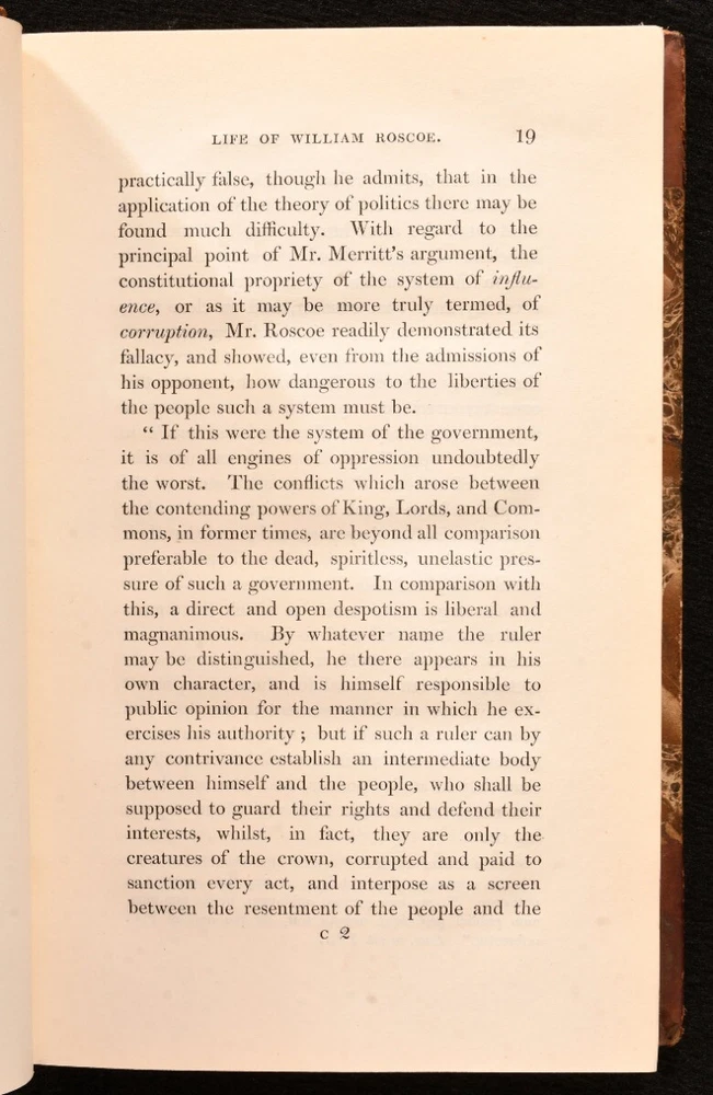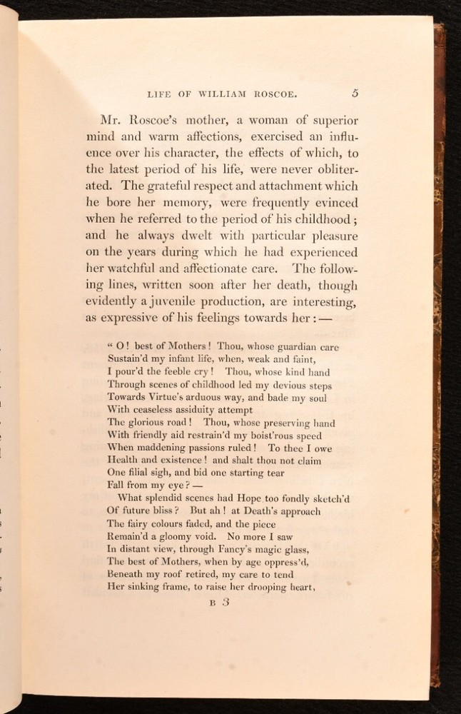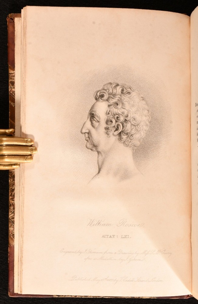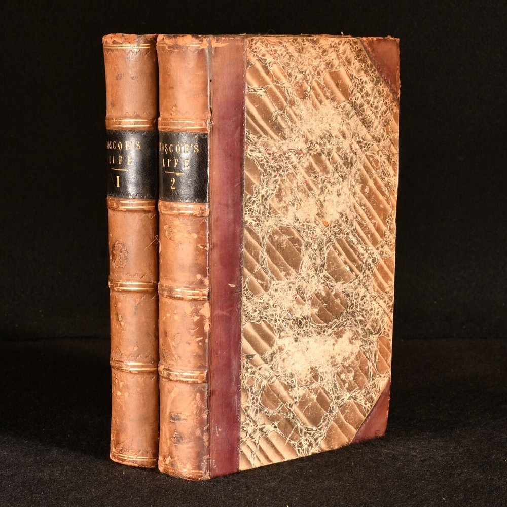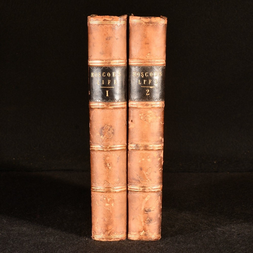 Click here to see our other books! The Life of William Roscoe Henry Roscoe 1833 T. Cadell : London 8.5" by 5.5" xv, 501; xii, 491pp. SUMMARY A smart first edition set of this biography of English banker William Roscoe. First Edition,Illustrated,Leather Binding,Original Binding,Publishers' Original Binding Overall Condition: Very Good This book weighs 1.5 KG when packed UK Postage: £ 3.99 US Postage: £ 23.99 EU Postage : £ 18.99 European Postage: £ 19.99 Asia Postage: £ 31.99 Worldwide Postage: £ 32.99 DESCRIPTION Complete in two volumes. First edition. With a frontispiece and one plate to volume one. Collated complete. The life of William Roscoe, an English banker, lawyer, and briefly a Member of Parliament, best known as one of England's first abolitionists, and as the author of the poem for children The Butterfly's Ball, and the Grasshopper's Feast. In his day he was also respected as a historian, art collector, botanist and miscellaneous writer. Written by his youngest son, Henry Roscoe, an English barrister, legal writer, and biographer. CONDITION In the original half calf binding. Externally, sound with rubbing and light bumping to the extremities resulting in minor loss. Fading to the spines with the odd mark to the boards. Internally, firmly bound. Pages are very bright and clean with the odd small spot. The odd small crease to the foredge of volume two. Light spotting to the endpapers with the previous owner's bookplate to the front pastedown. Overall Condition: Very Good GLOSSARY OF TERMS Overall Condition (Dustwrapper condition rating is shown after that for the book itself, where a dustwrapper is present) Fine - Very well preserved copy showing very little wear Very Good Indeed - Only one or two minor faults, really a very attractive copy Very Good - Quite a wide term meaning no major faults but probably several smaller ones often expected given the age of the book, but still a respectable copy Good - Meaning not very good. Some more serious faults as will be described in the condition report under 'condition' Good Only - Meaning one or more faults that could really do with repair Fair - As with good only above but with other faults leaving a compromised copy even after repair Poor - Really bad and possibly seriously incomplete. We only sell books in this condition where their rarity or value makes them attractive none the less. Major defects will be described. GUARANTEE We offer a full money back guarantee on our descriptions. Please ask for details and conditions. We prefer PAYPAL. If you pay via PAYPAL we will post the item off the same or the next working day with the postage you have selected. Please note we cannot accept USD cheques