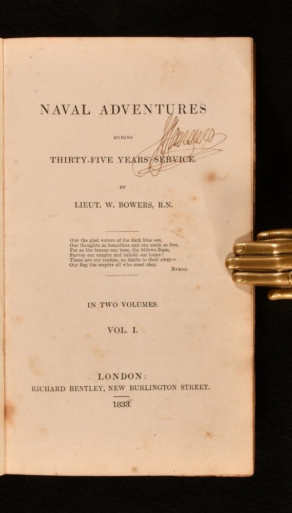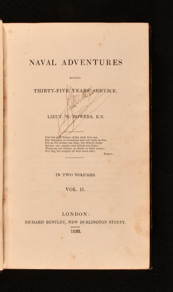 Click here to see our other books! Naval Adventures During Thirty-Five Years' Service Lieut. W. Bowers 1833 Richard Bentley : London 8" by 5" 302; 302pp. SUMMARY In this very scarce two volume set, Lieutenant W. Bowers' offers an exciting account of his naval adventures. First Edition,Leather Binding,Very Scarce Overall Condition: Good This book weighs 1 KG when packed UK Postage: £ 3.99 US Postage: £ 22.99 EU Postage : £ 16.99 European Postage: £ 17.99 Asia Postage: £ 22.99 Worldwide Postage: £ 28.99 DESCRIPTION A first edition two volume set in half calf bindings. Ink inscription to the title pages of both volumes. Perhaps the authors own signature though it is hard to read. In these two volumes, Lieutenant W. Bowers recalls his naval adventures around the world and his acquaintances among notable seamen, over thirty-five years of service. It also provides some autobiographical details of his childhood and family. CONDITION In half calf bindings. Externally sound, with shelf wear to the boards, and rubbing to the extremities. Backstrip lifting from the rear joint and from the tail of the front joint to Vol I. Splitting to the front joint of Vol II, and starting to lift slightly. Internally, firmly bound. Pages are bright with the odd spot throughout. Overall Condition: Good GLOSSARY OF TERMS Overall Condition (Dustwrapper condition rating is shown after that for the book itself, where a dustwrapper is present) Fine - Very well preserved copy showing very little wear Very Good Indeed - Only one or two minor faults, really a very attractive copy Very Good - Quite a wide term meaning no major faults but probably several smaller ones often expected given the age of the book, but still a respectable copy Good - Meaning not very good. Some more serious faults as will be described in the condition report under 'condition' Good Only - Meaning one or more faults that could really do with repair Fair - As with good only above but with other faults leaving a compromised copy even after repair Poor - Really bad and possibly seriously incomplete. We only sell books in this condition where their rarity or value makes them attractive none the less. Major defects will be described. GUARANTEE We offer a full money back guarantee on our descriptions. Please ask for details and conditions. We prefer PAYPAL. If you pay via PAYPAL we will post the item off the same or the next working day with the postage you have selected. Please note we cannot accept USD cheques
