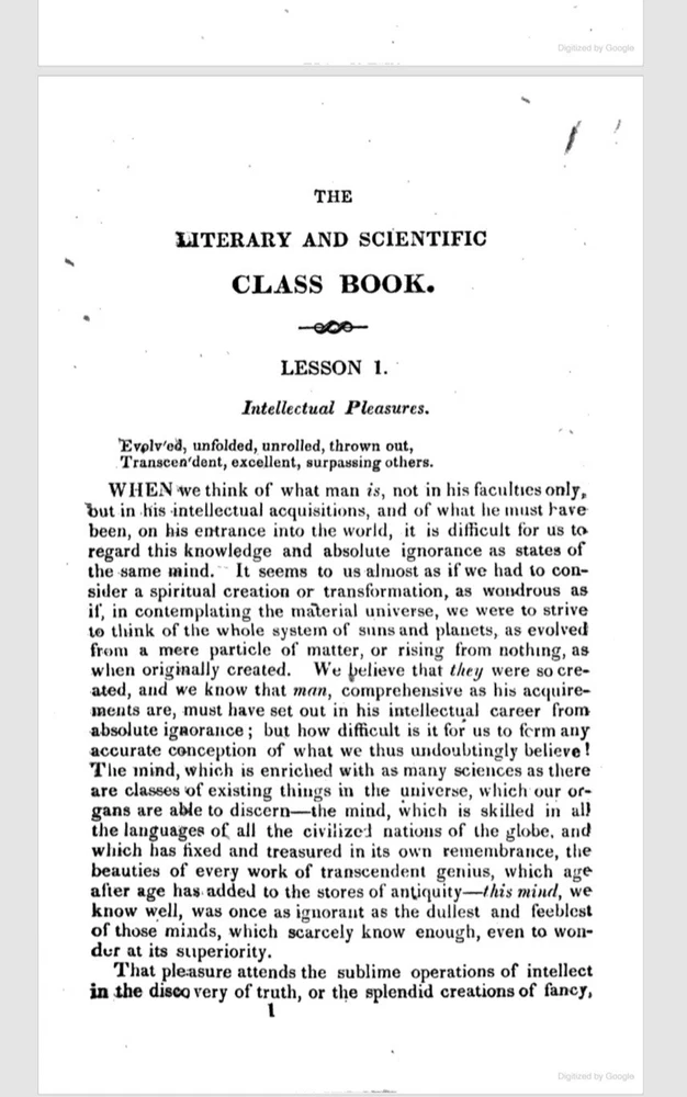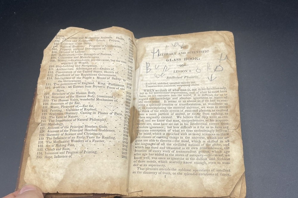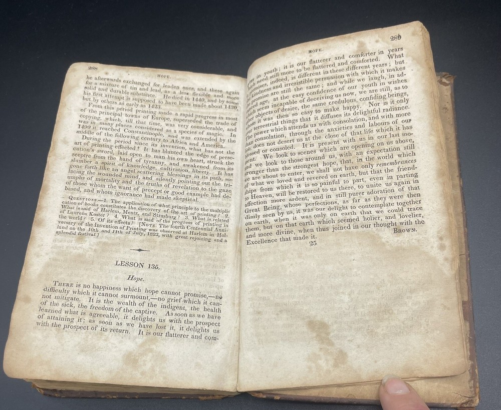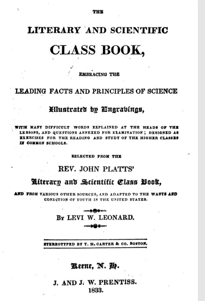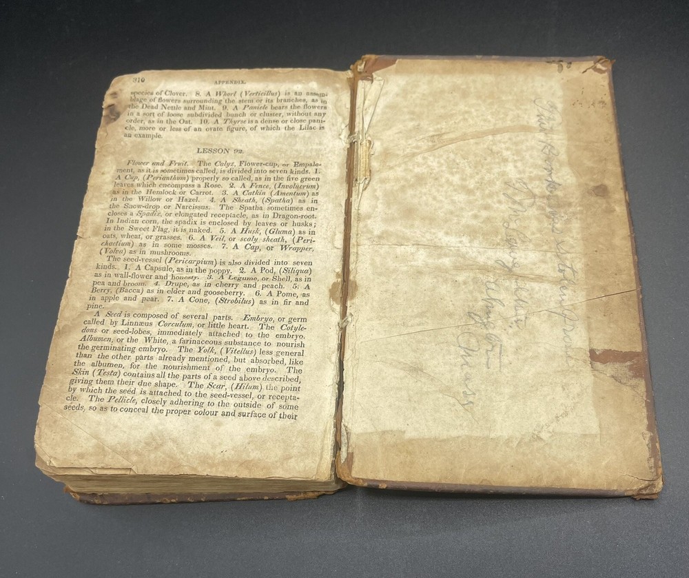 This book is entitled “literary and scientific class book” The cover is leather and pages parchment. It was written in 1833. Although the copyright page is missing, I was able to match it to another copy to verify info. It has a variety of lessons relating to their understanding of science and inventions of the 1700’s and early 1800’s. The dates mentioned in the lessons refer to the late 1700’s and very early 1800’s. It also has a section about our government and the government of England. A fascinating book written shortly after the Revolutionary War. Some missing pages and damage, but still well preserved for being nearly 200 years old.