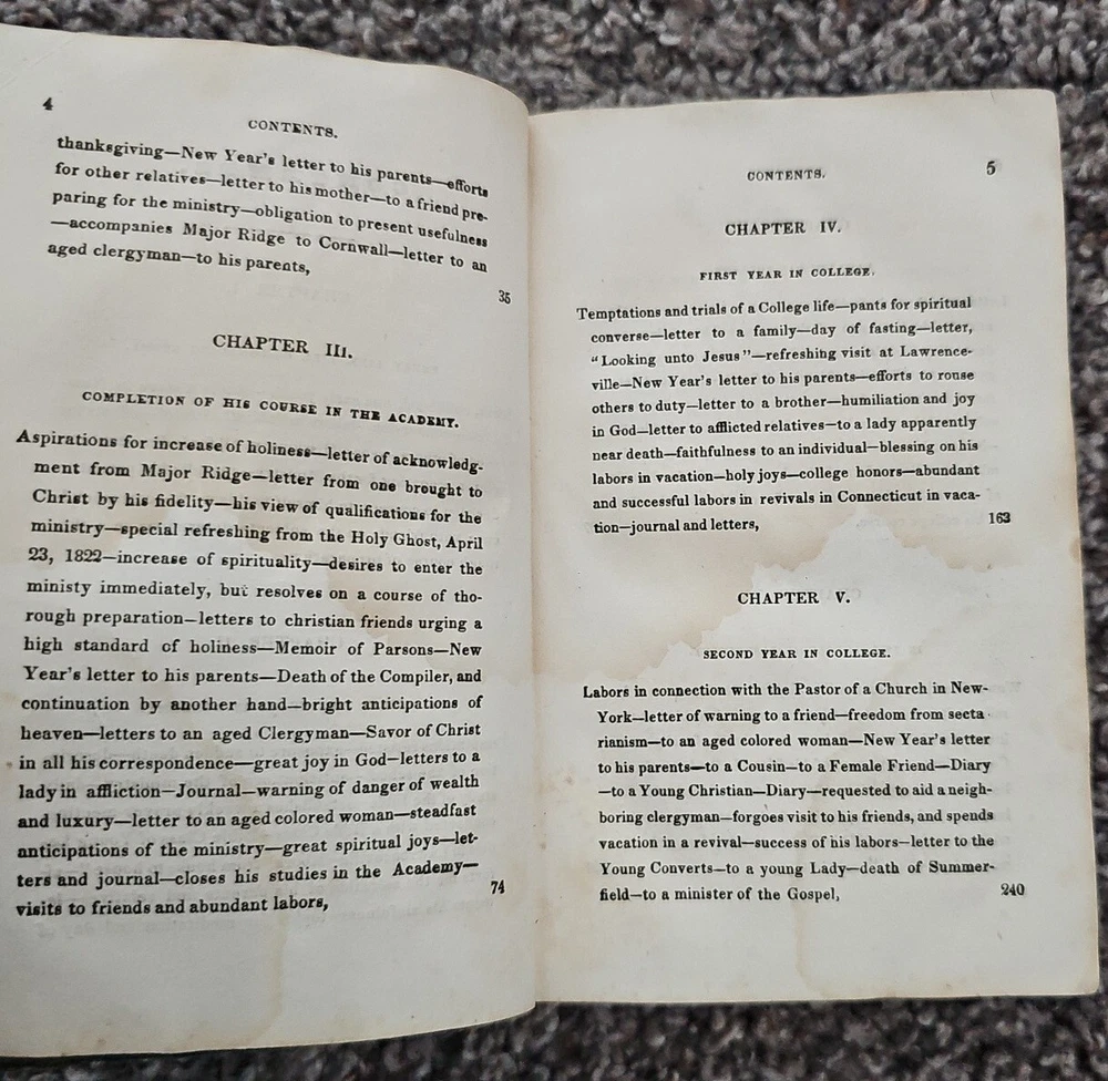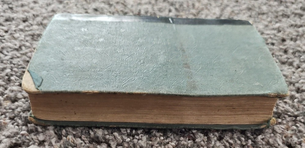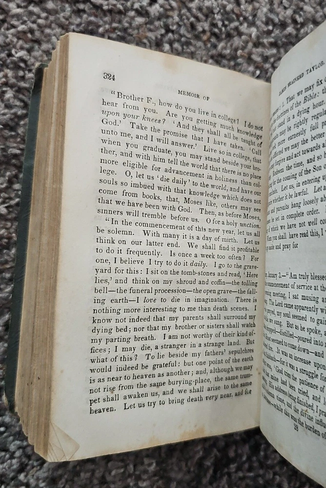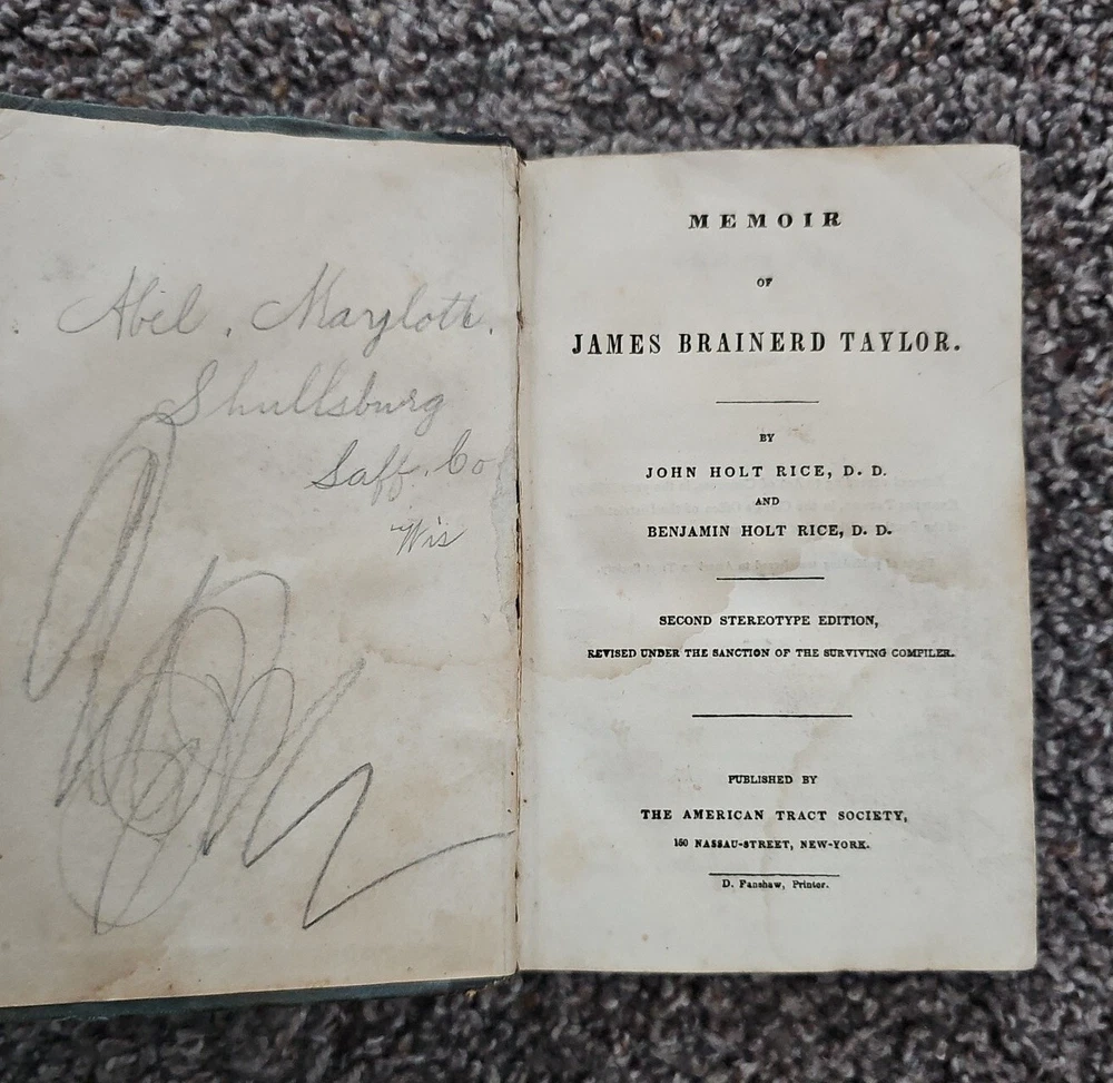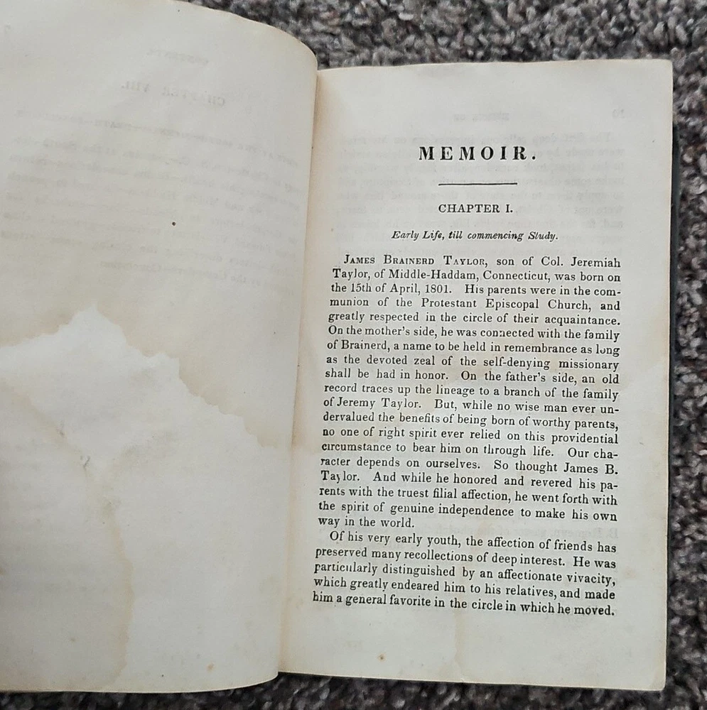 MEMOIR OF JAMES BRAINERD TAYLOR by John Holt Rice and Benjamin Holt Rice second stereotype edition Published by the American Tract Society Measures 3 3/4" x 6" and is 441 pages Condition: The hardback cover has a pressed design in the green cloth covered boards. The cloth on the corners is worn with the boards showing. The leather spine has gold gilt bands and lettering. It has rubbing to the leather (see pictures) but no chipping. The binding is tight. The inside front cover has pencil writing. The first 10 and last 50 pages have light moisture stains on part of the page. The rest of the pages have normal foxing or yellowing but are in very good condition.