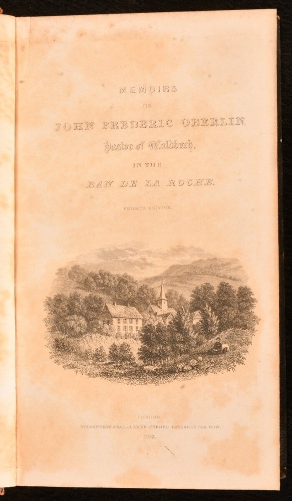 Click here to see our other books! Memoirs of John Frederic Oberlin, Pastor of Waldbach, in the Ban de la Roche John Frederic Oberlin 1833 Holdsworth & Ball : London 7" by 4.5" x, 348pp. SUMMARY The fourth edition of this memoir of John Frederic Oberlin. Leather Binding Overall Condition: Very Good Indeed This book weighs 0.5 KG when packed UK Postage: £ 3.99 US Postage: £ 15.99 EU Postage : £ 13.99 European Postage: £ 14.99 Asia Postage: £ 18.99 Worldwide Postage: £ 19.99 DESCRIPTION The fourth edition. With a frontispiece silhouette side portrait. In a full calf binding with gilt text to the spine. This work features a memoir of John Frederic Oberlin. Oberlin was an Alsatian pastor and philanthropist. CONDITION In a full calf binding. Externally very smart with minor marks to the boards and slight rubbing to the joints and rear extremities. Internally firmly bound with bright and generally clean pages with spotting to the front and rear blanks and to the title page. Overall Condition: Very Good Indeed GLOSSARY OF TERMS Overall Condition (Dustwrapper condition rating is shown after that for the book itself, where a dustwrapper is present) Fine - Very well preserved copy showing very little wear Very Good Indeed - Only one or two minor faults, really a very attractive copy Very Good - Quite a wide term meaning no major faults but probably several smaller ones often expected given the age of the book, but still a respectable copy Good - Meaning not very good. Some more serious faults as will be described in the condition report under 'condition' Good Only - Meaning one or more faults that could really do with repair Fair - As with good only above but with other faults leaving a compromised copy even after repair Poor - Really bad and possibly seriously incomplete. We only sell books in this condition where their rarity or value makes them attractive none the less. Major defects will be described. GUARANTEE We offer a full money back guarantee on our descriptions. Please ask for details and conditions. We prefer PAYPAL. If you pay via PAYPAL we will post the item off the same or the next working day with the postage you have selected. Please note we cannot accept USD cheques